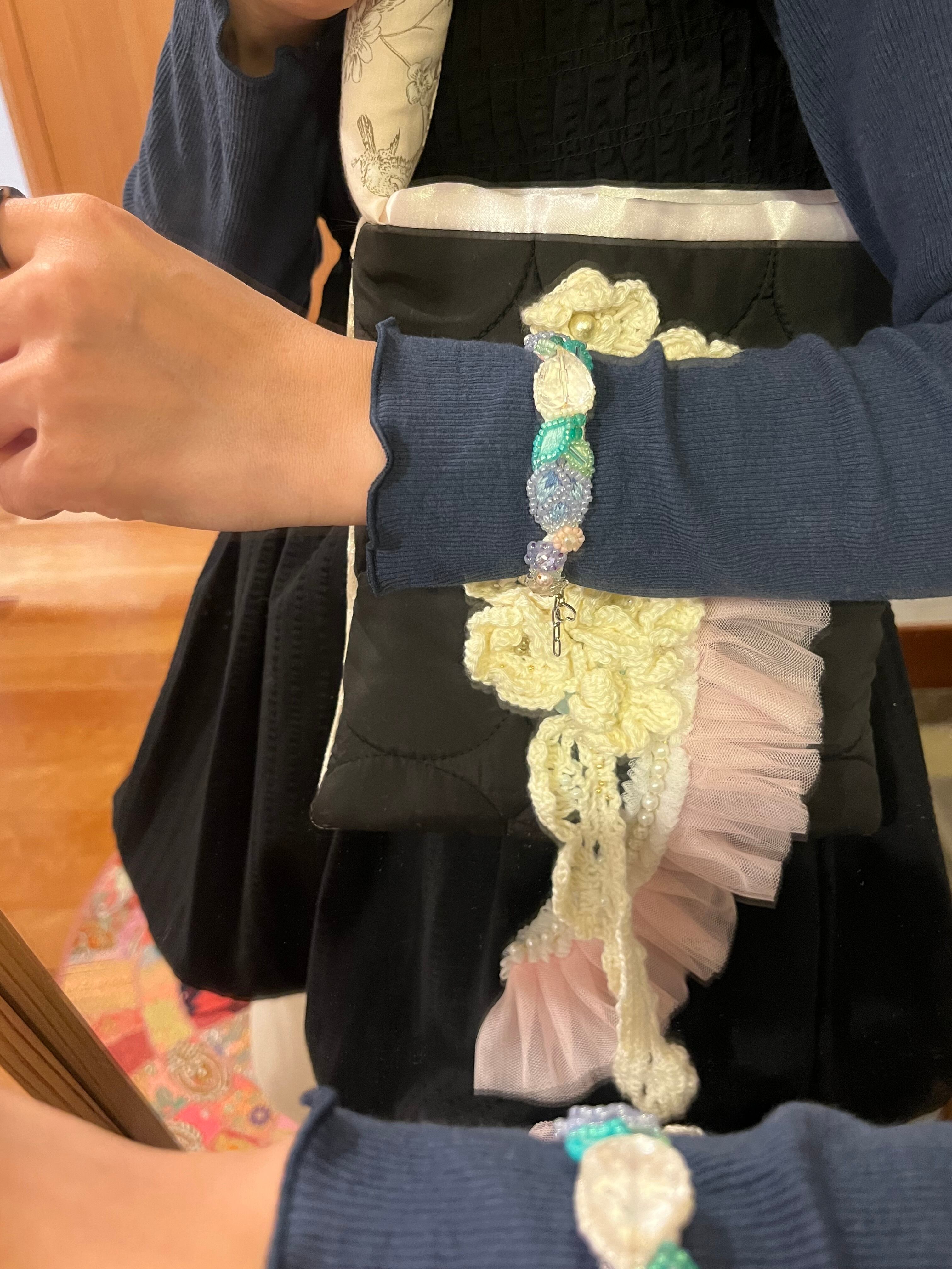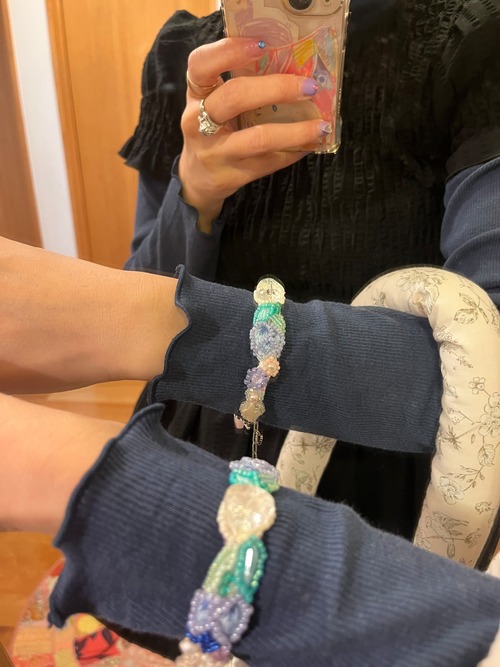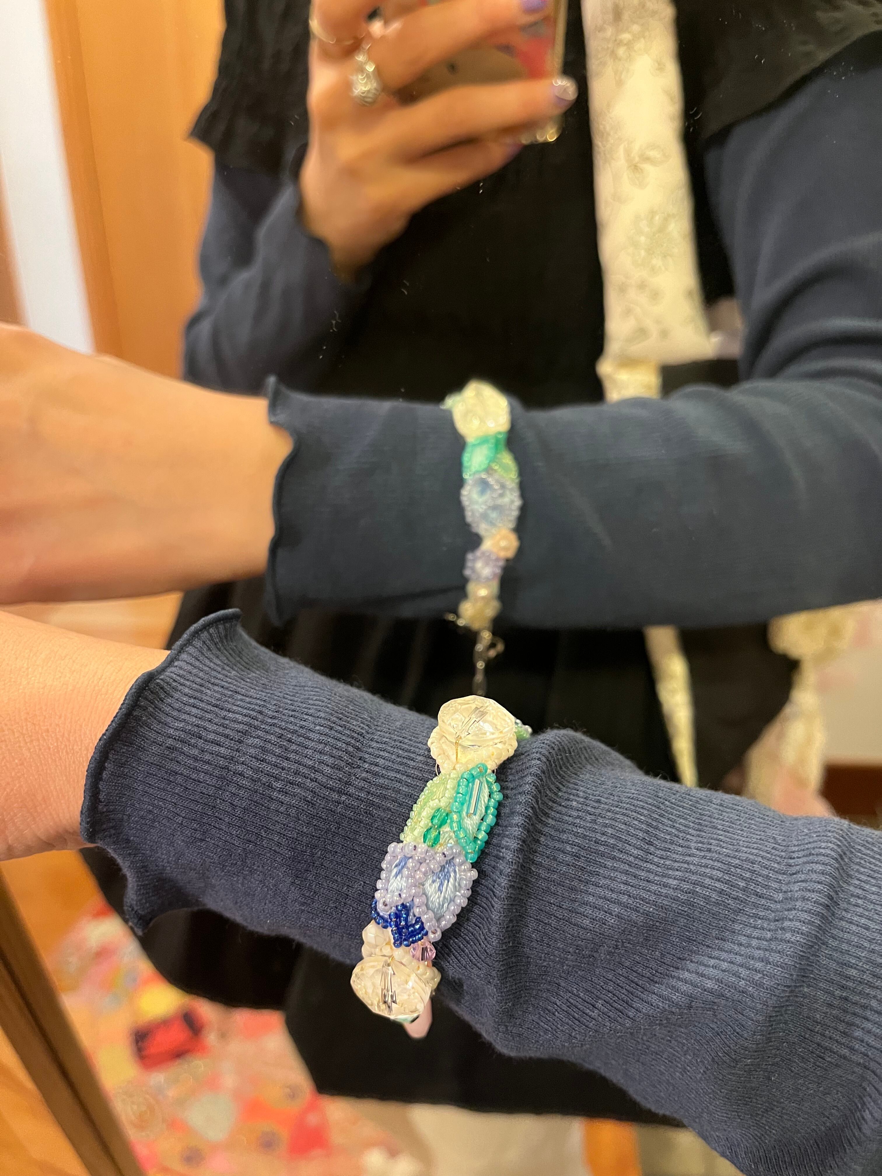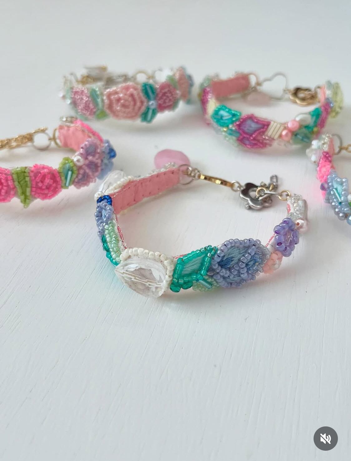 シロツメクサをつなげて花輪にしていくようにひとつひとつ丁寧にすすめているブレスレットのシリーズです