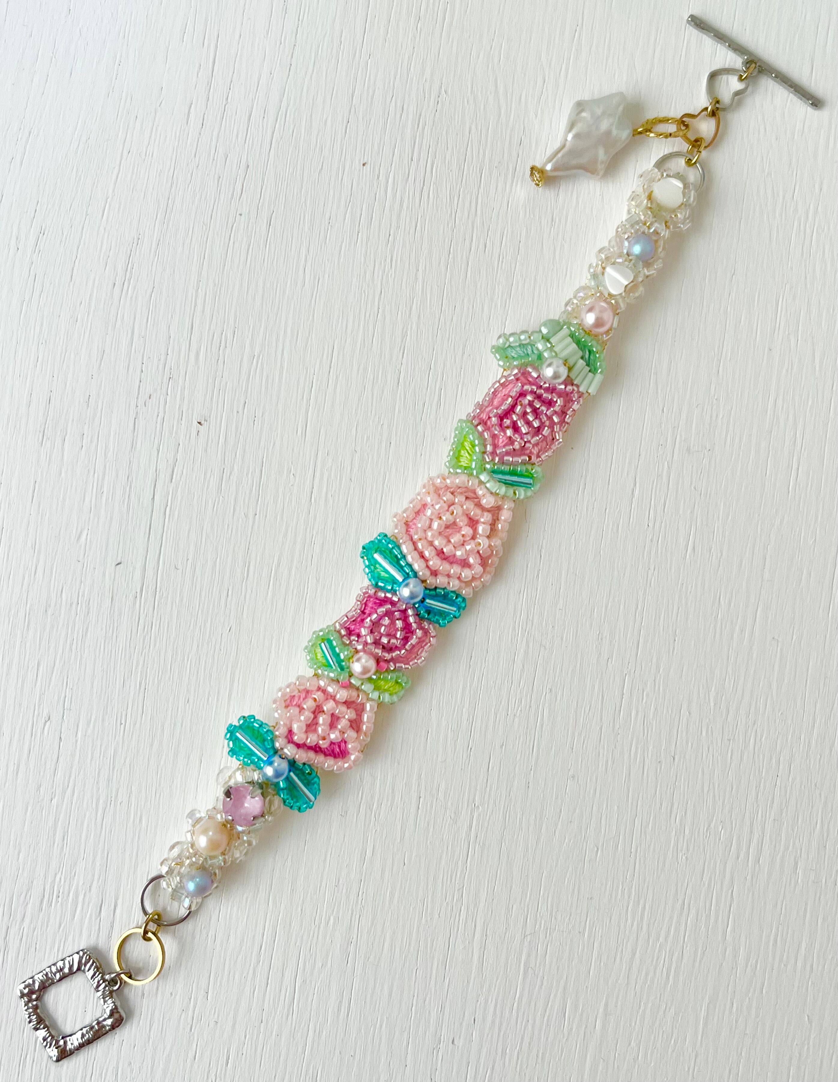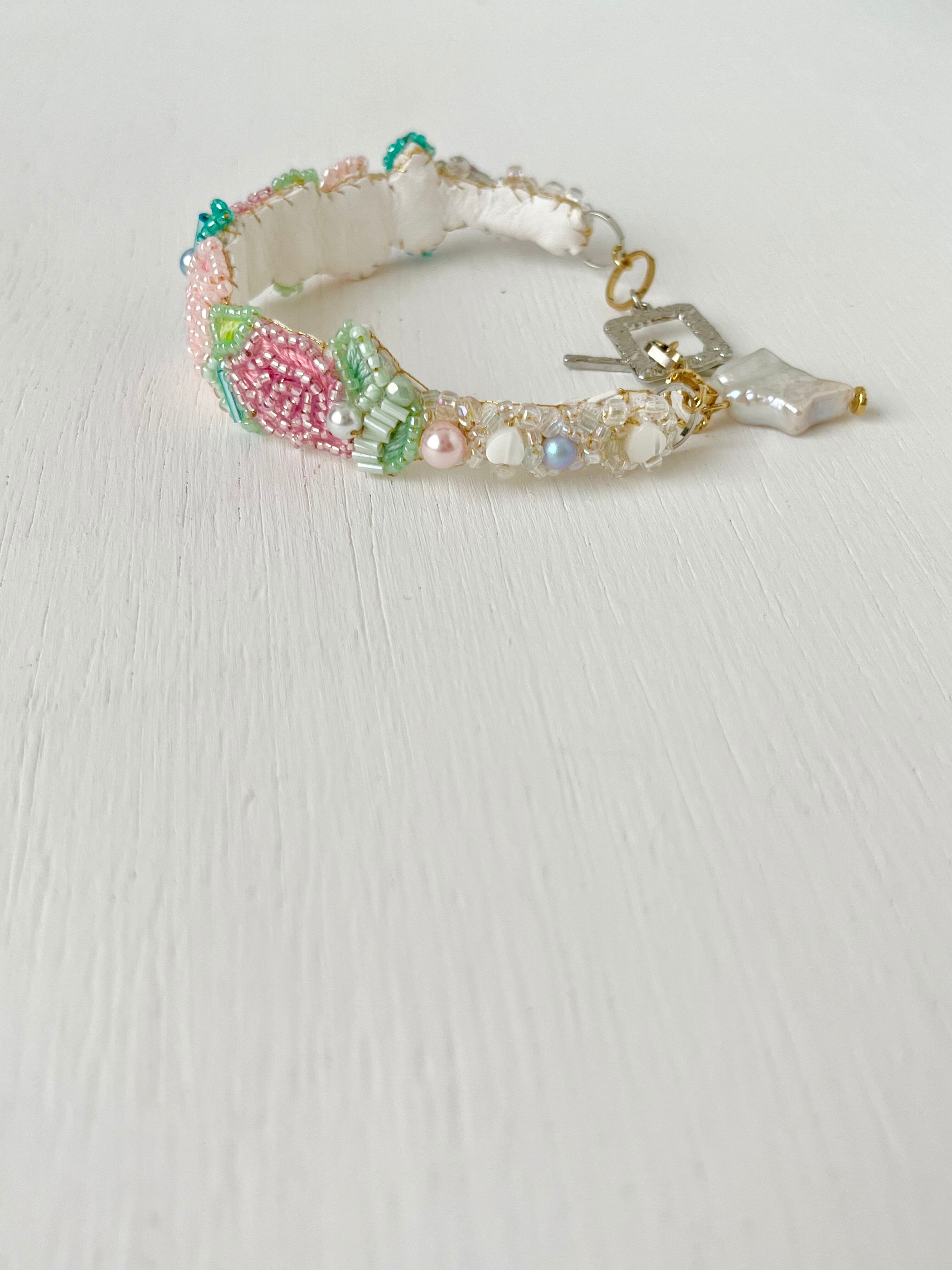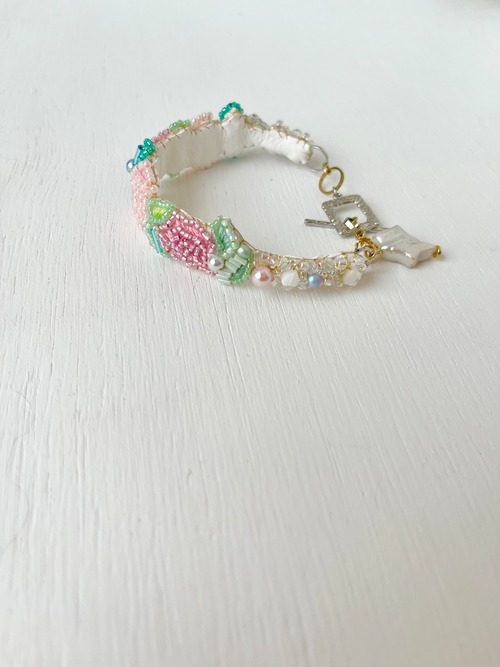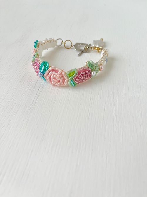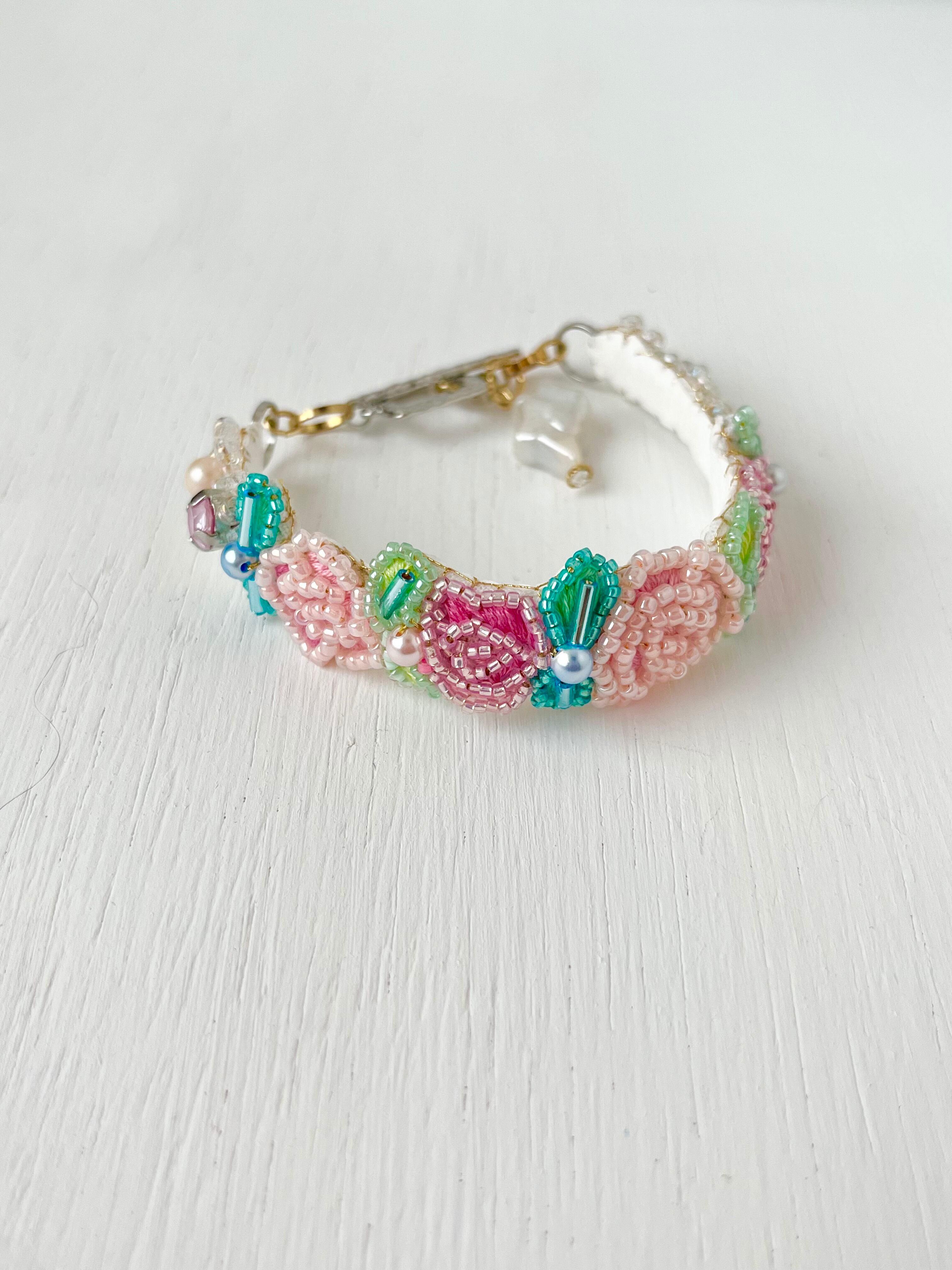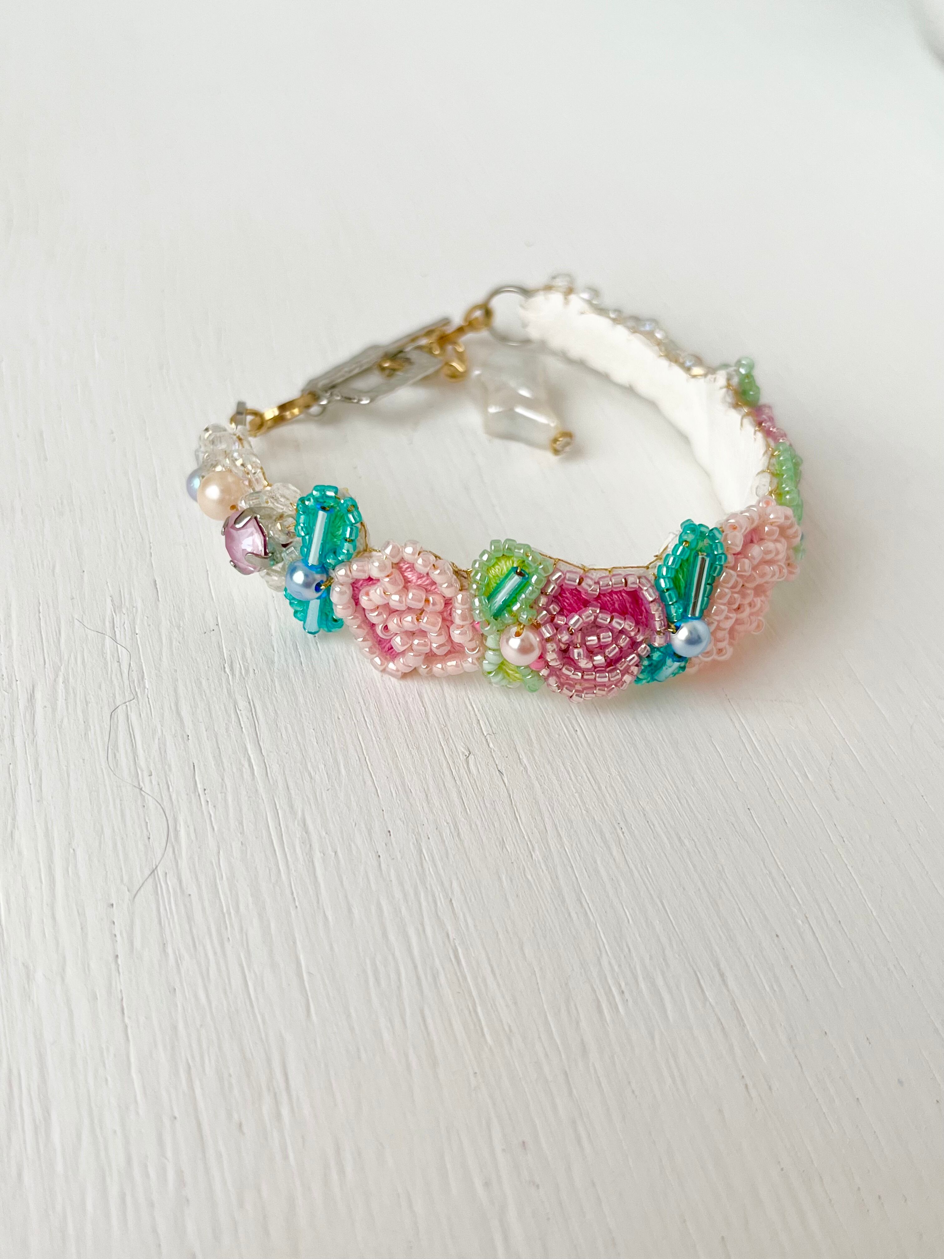 シロツメクサをつなげて花輪にしていくようにひとつひとつ丁寧にすすめているブレスレットのシリーズです