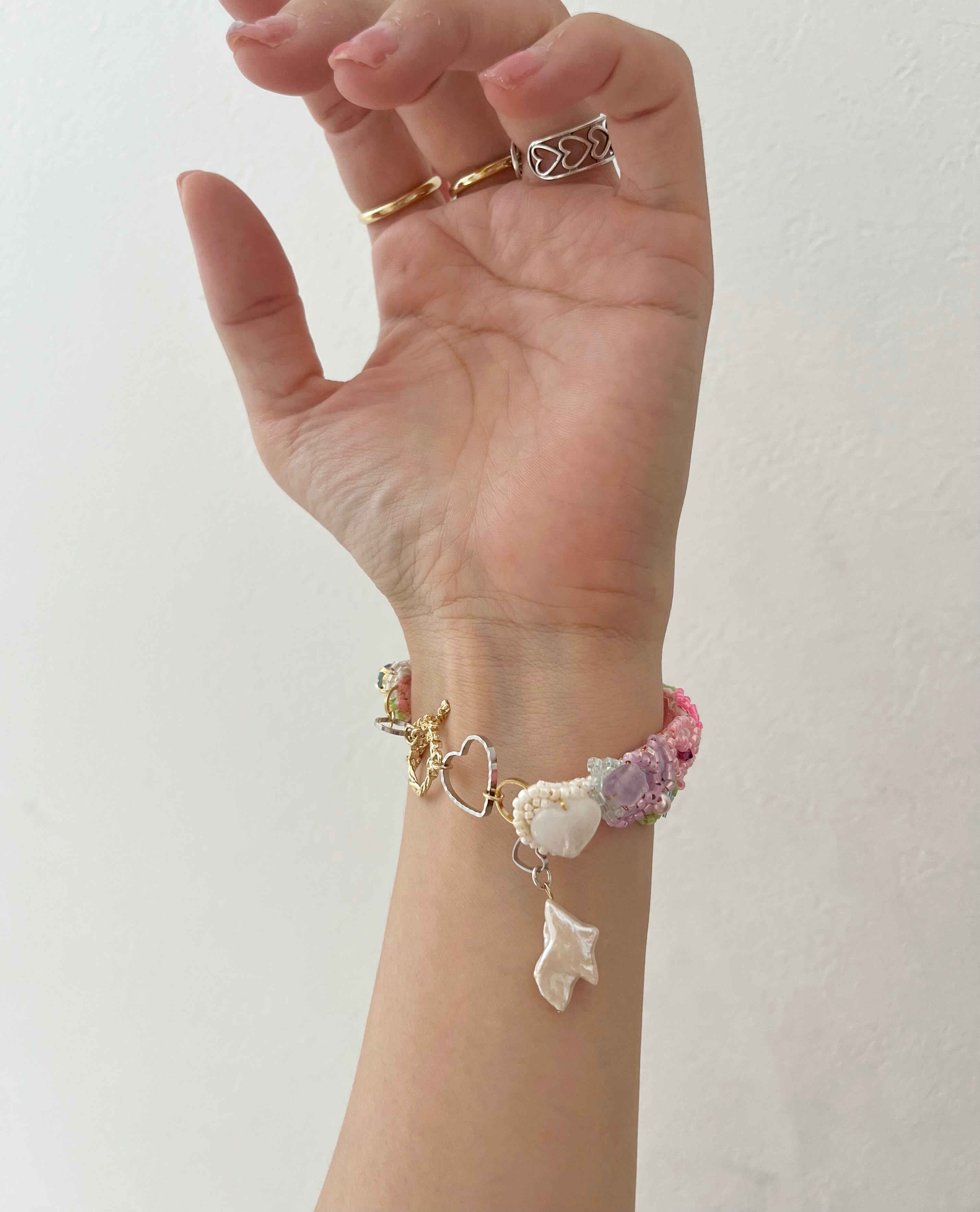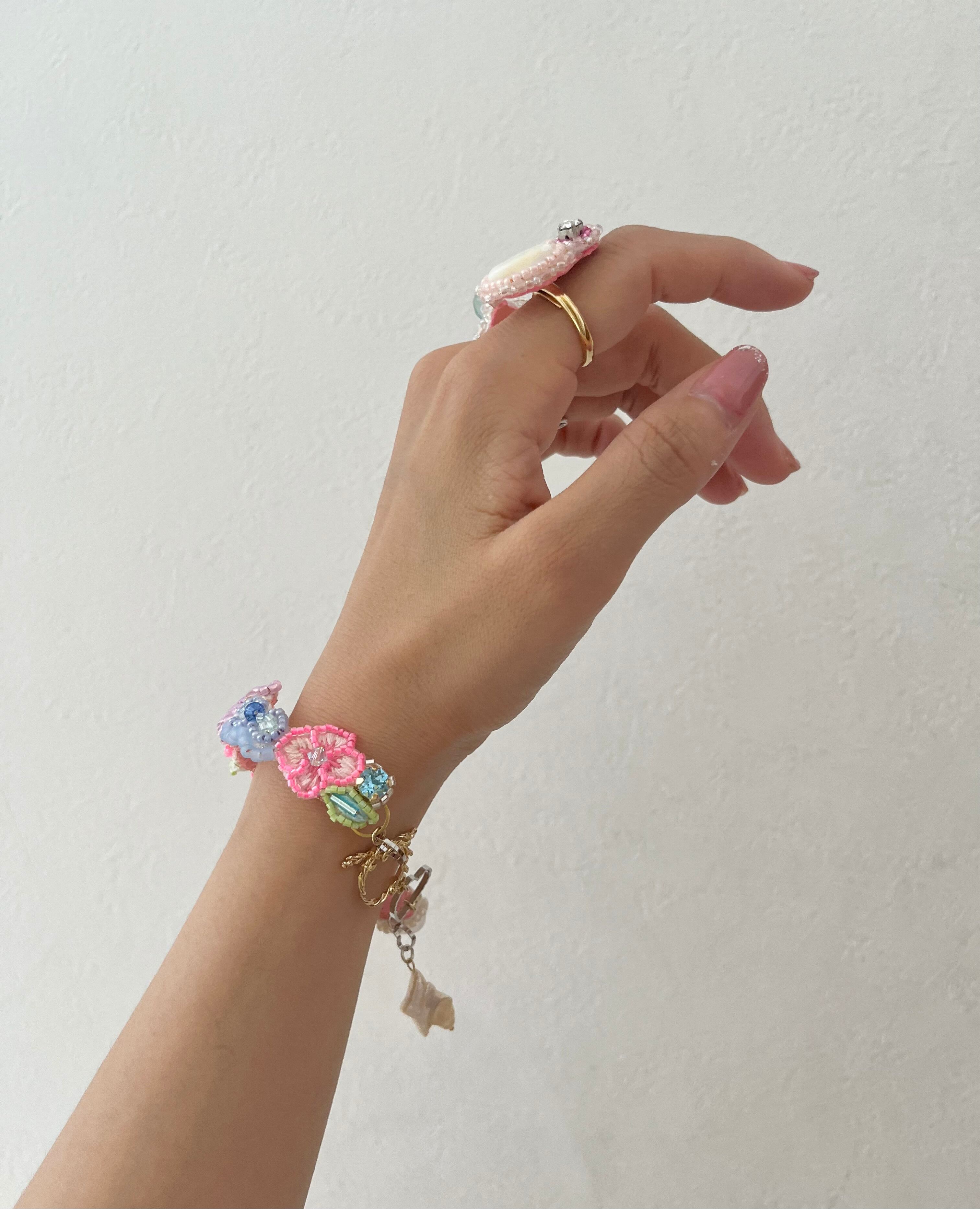 シロツメクサをつなげて花輪にしていくようにひとつひとつ丁寧にすすめているブレスレットのシリーズです