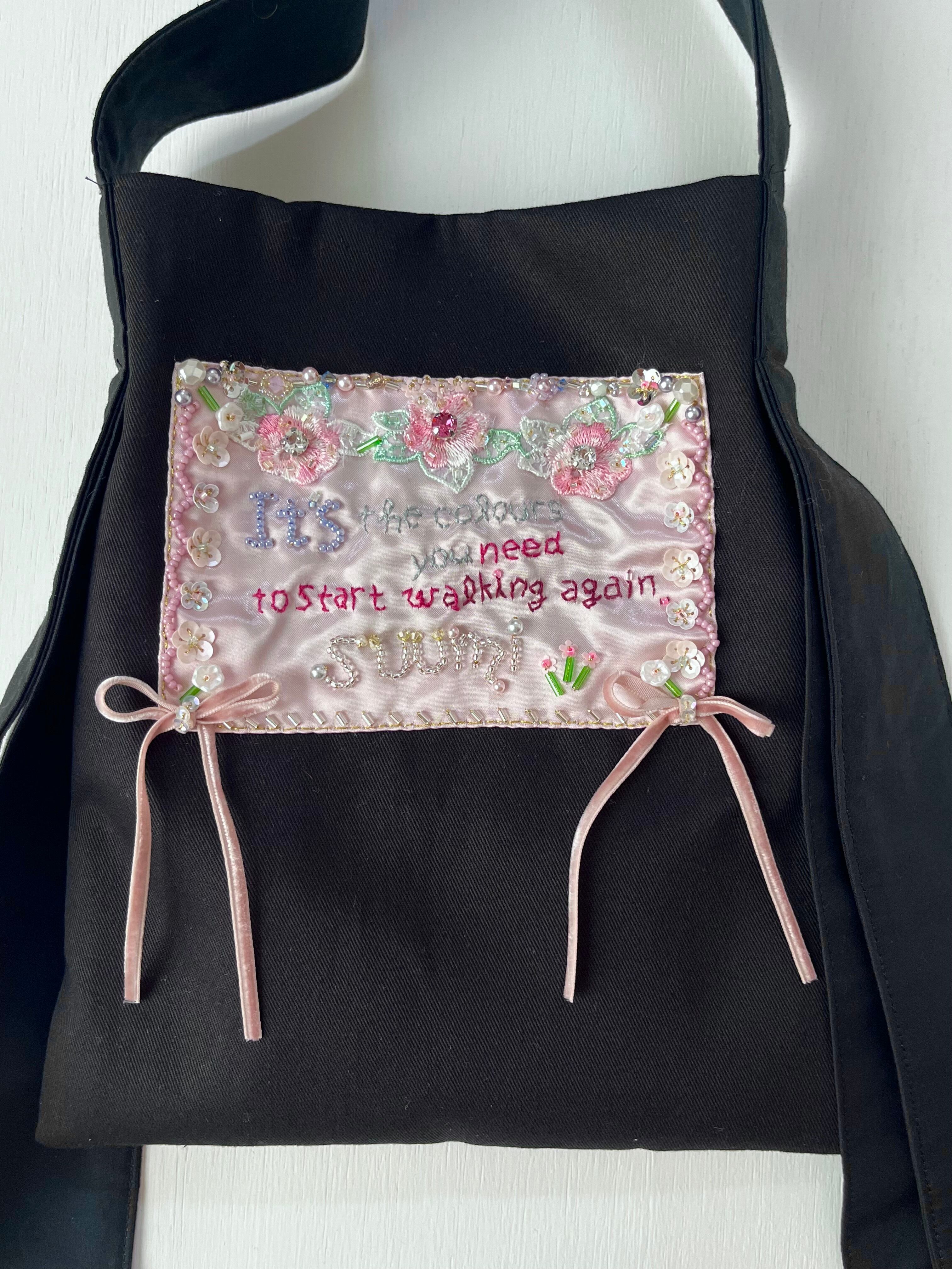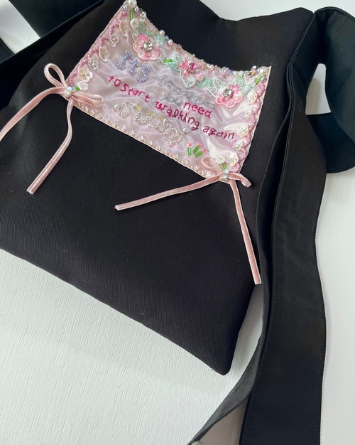 それぞれのバッグには想い想いに言葉を綴り、タグを手刺繍して制作してます