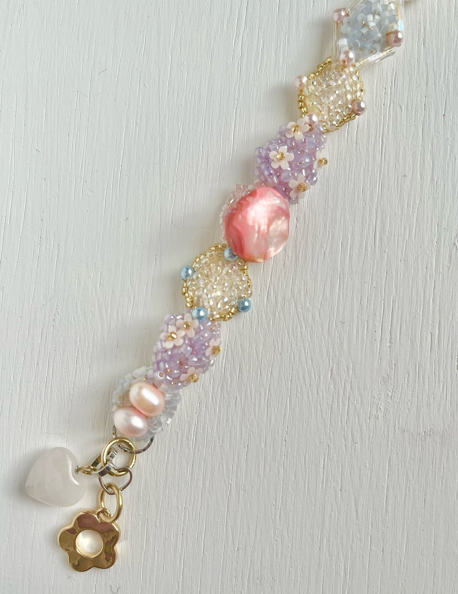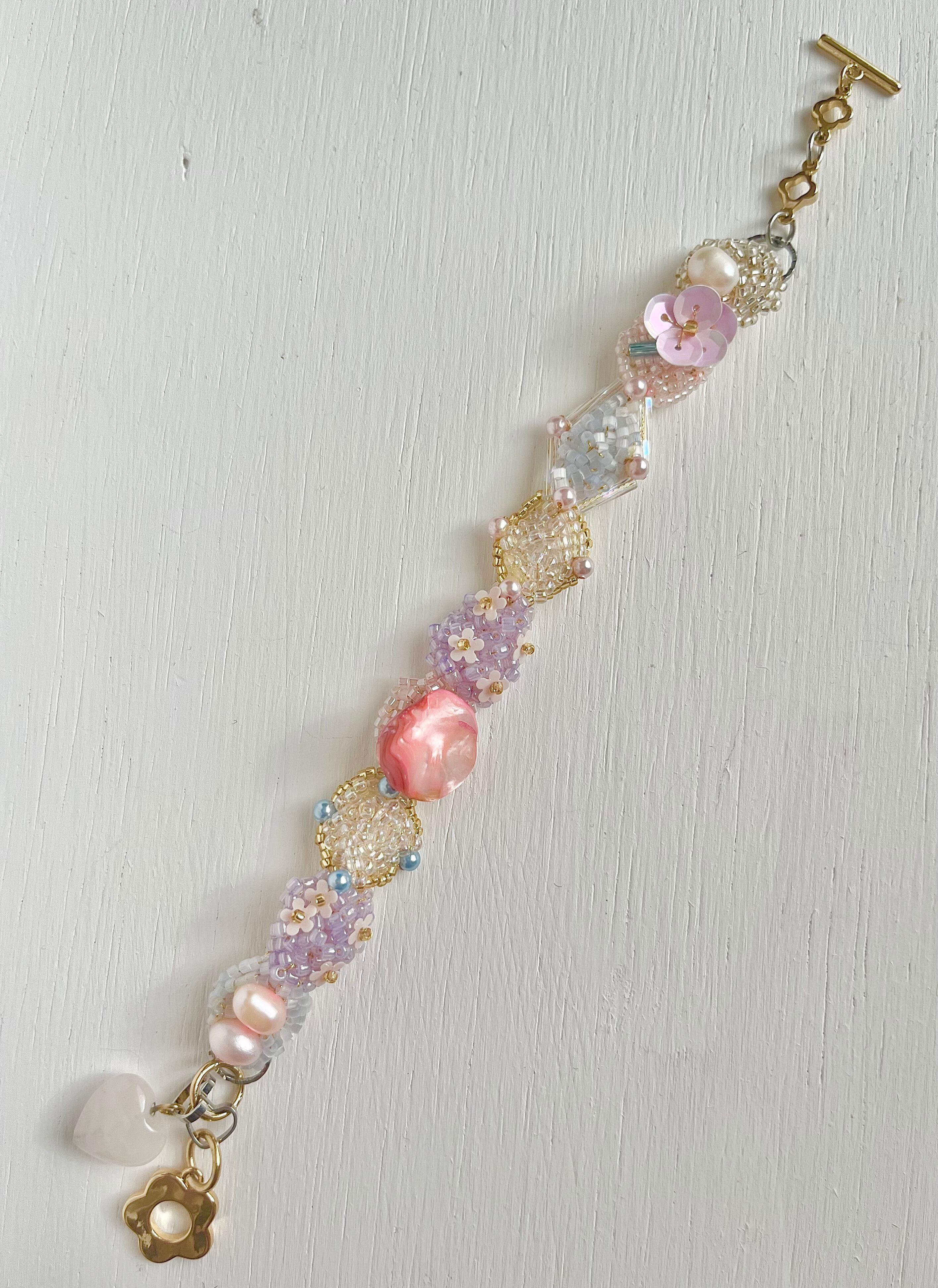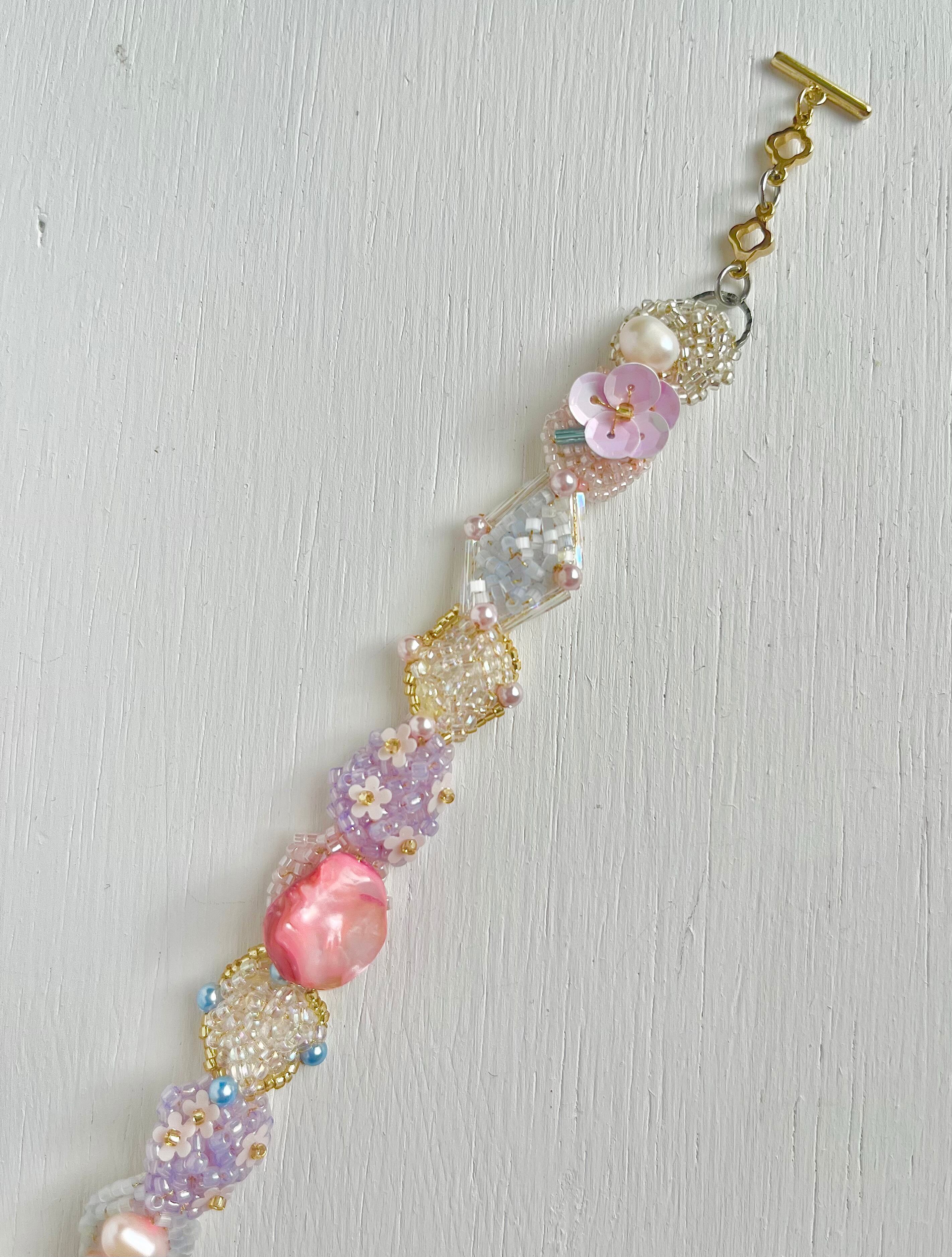 シロツメクサをつなげて花輪にしていくようにひとつひとつ丁寧にすすめているブレスレットのシリーズです