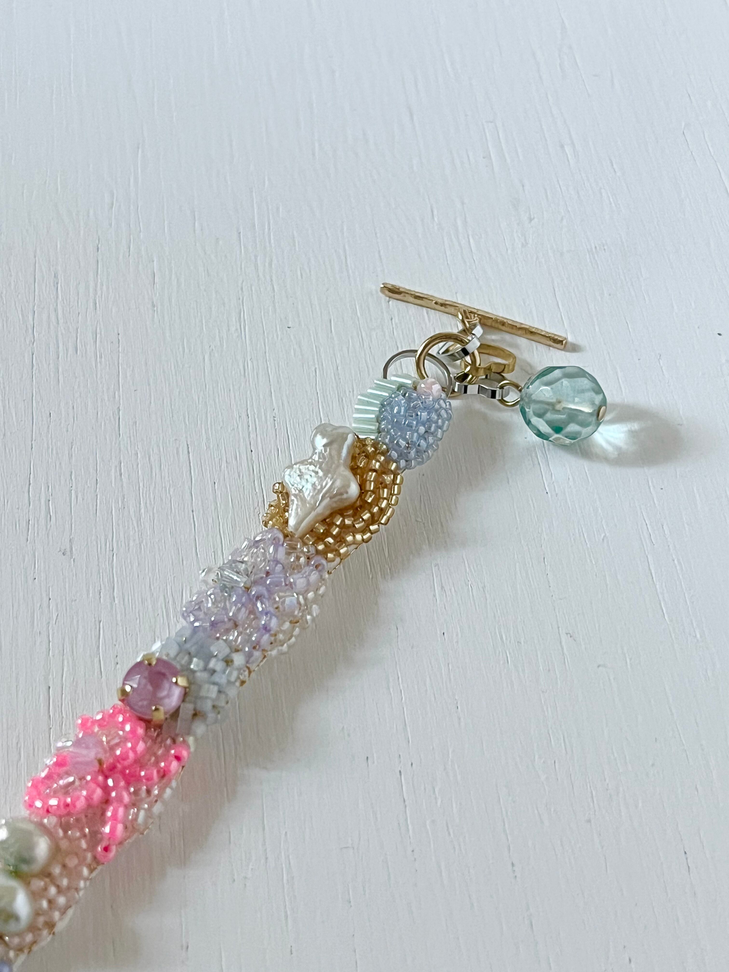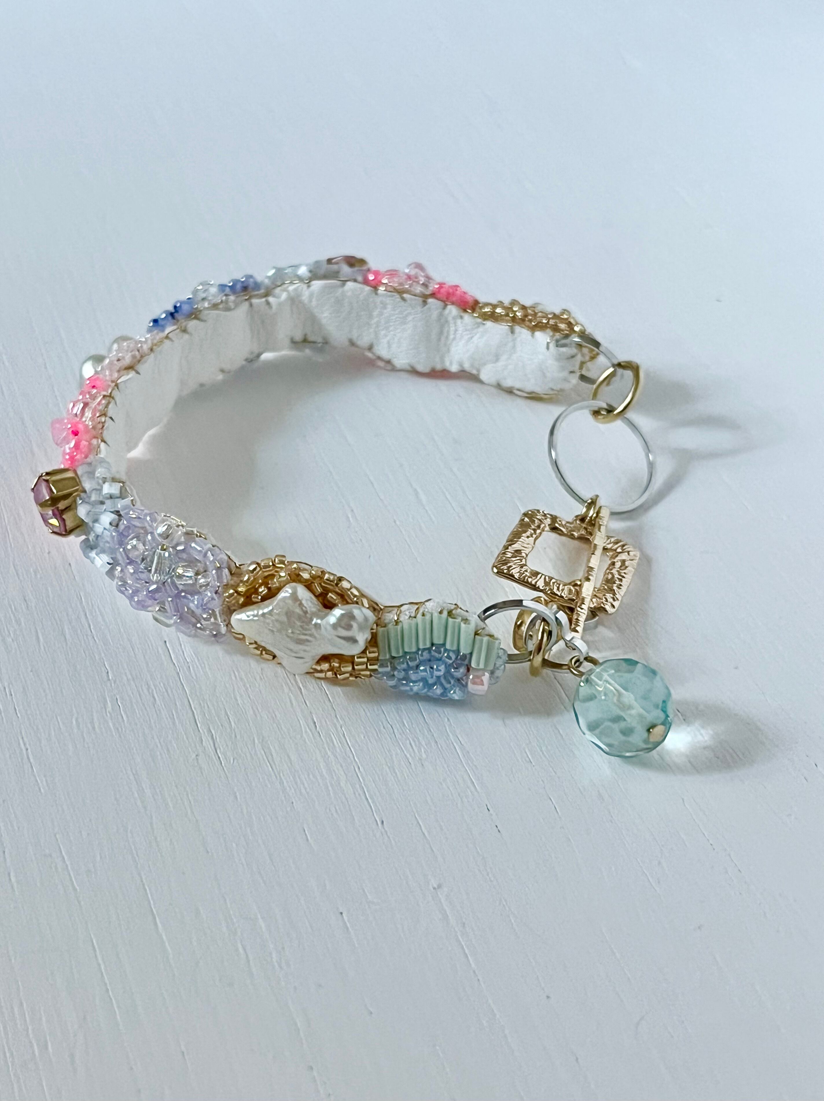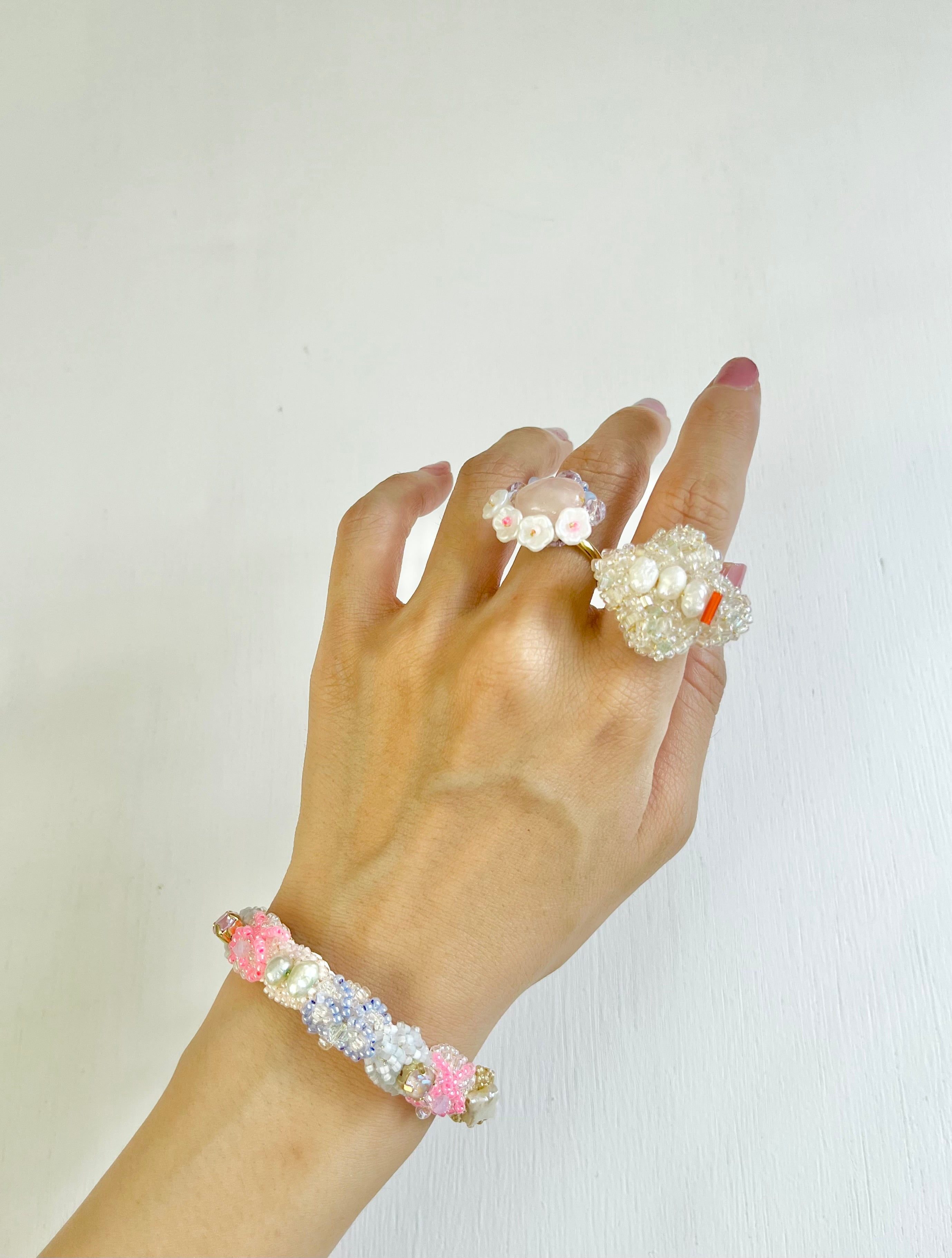 シロツメクサをつなげて花輪にしていくようにひとつひとつ丁寧にすすめているブレスレットのシリーズです
