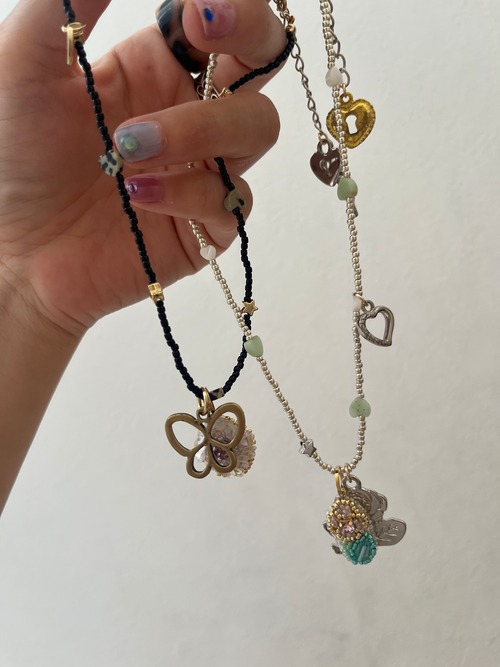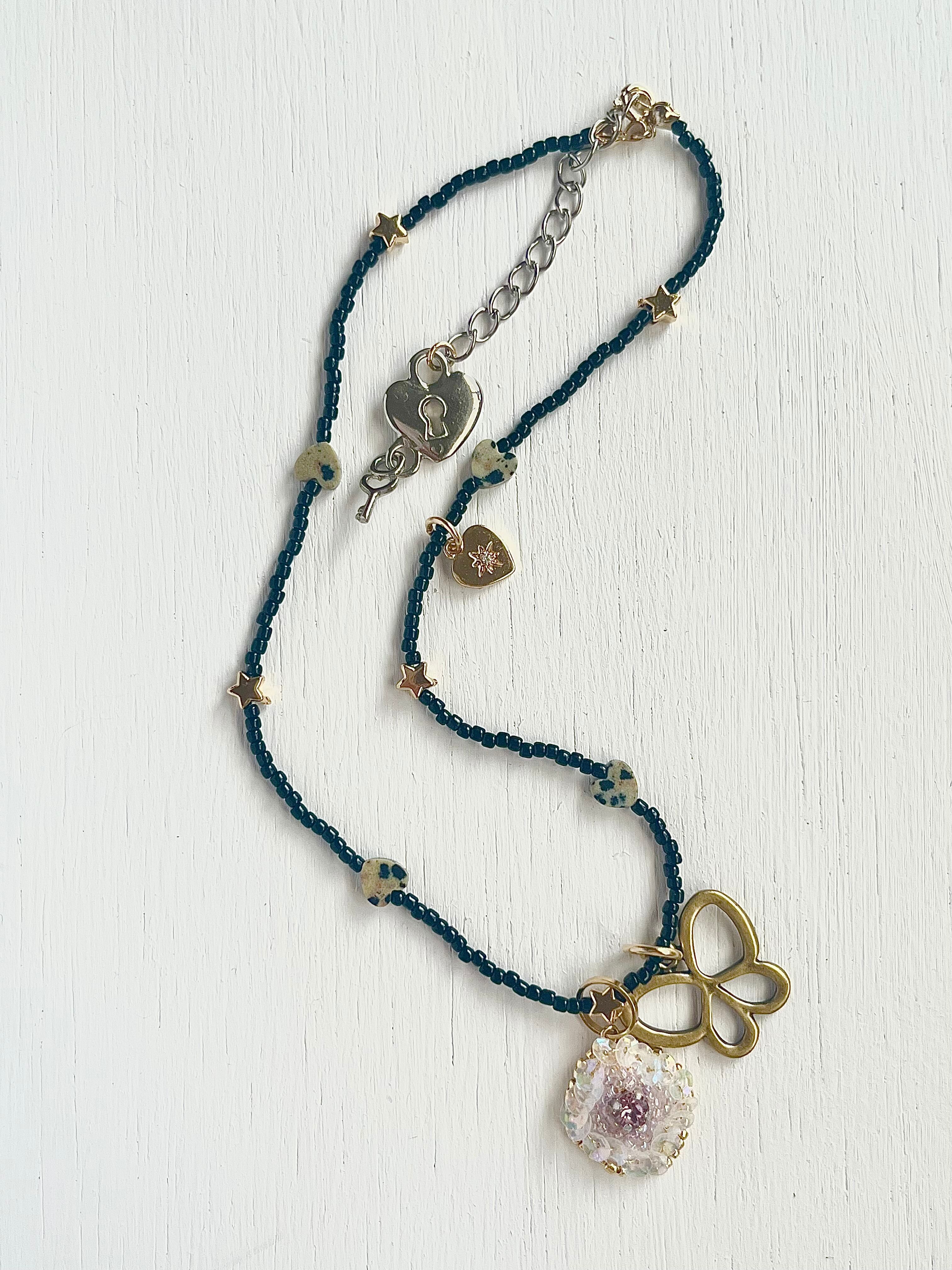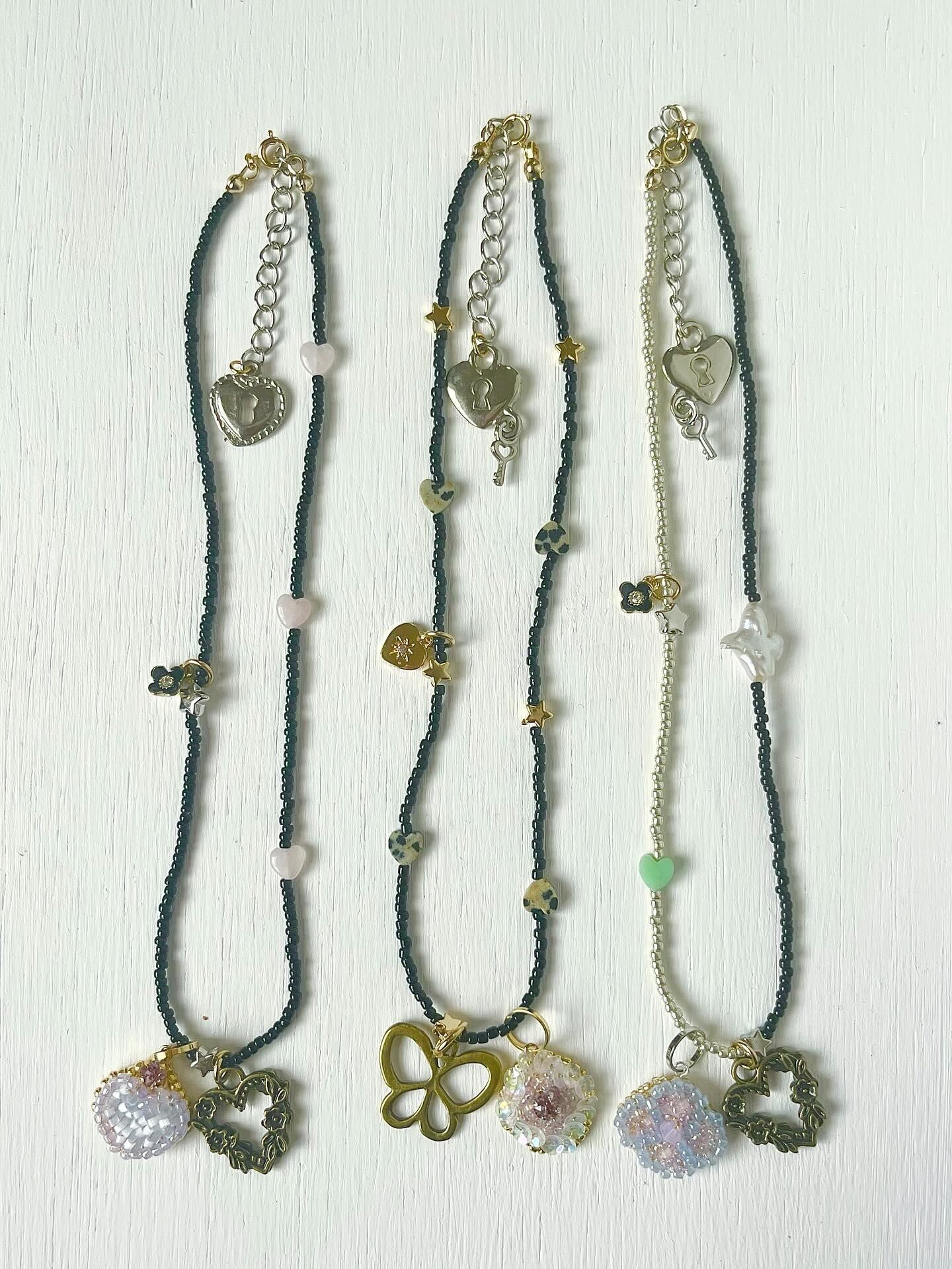 ダルメシアン柄の石、星型のパール、ハートの貝、キャンディーのような小さな天然石などひとつひとつかわいくなるようバランスにこだわりました