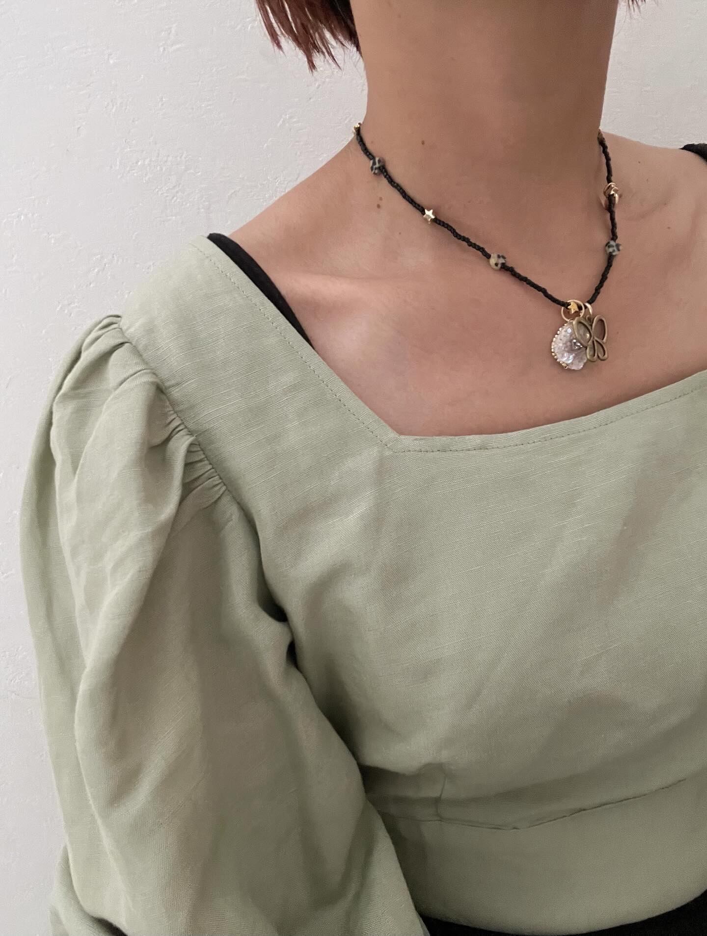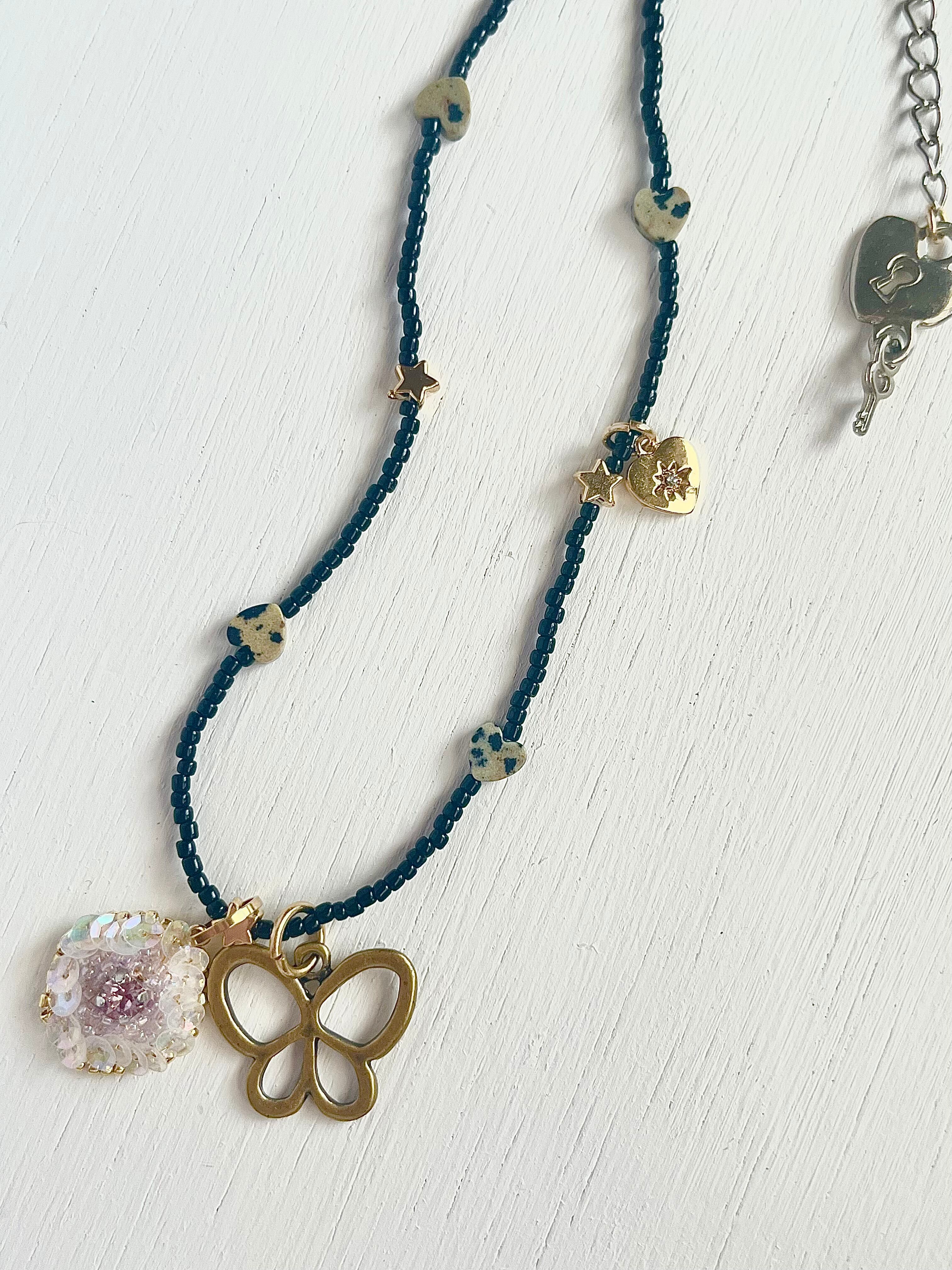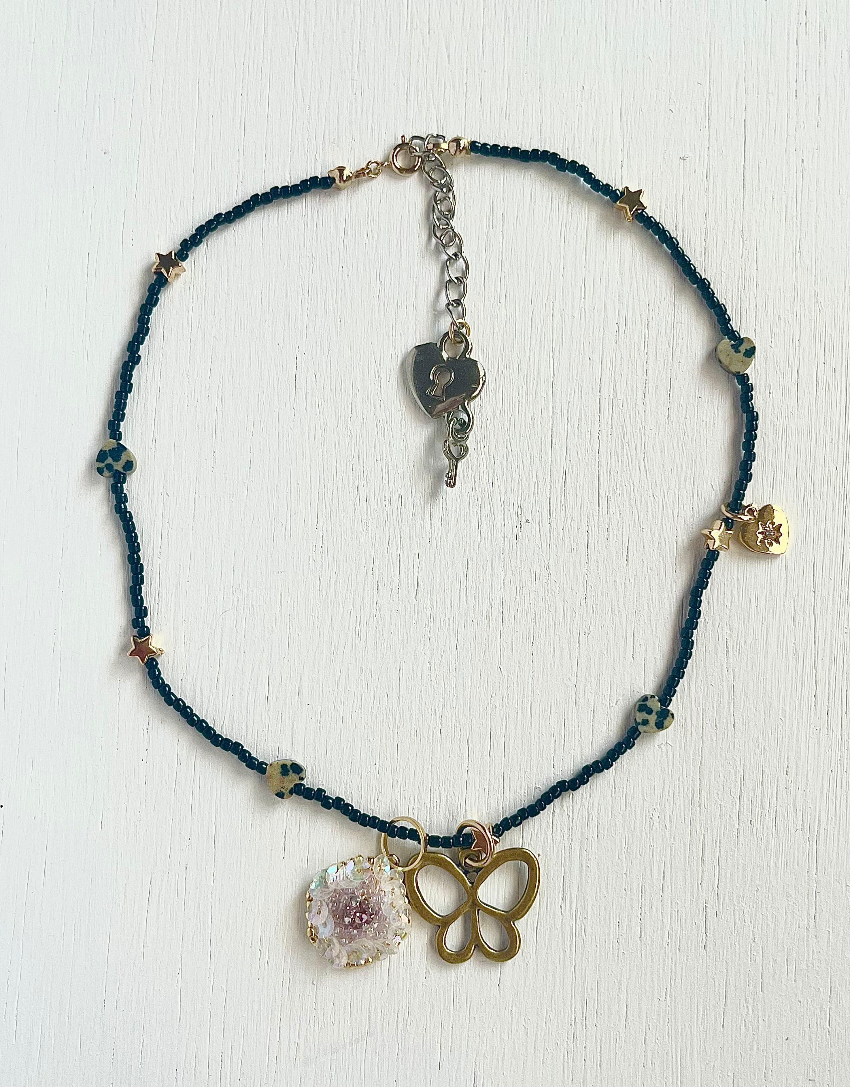 ダルメシアン柄の石、星型のパール、ハートの貝、キャンディーのような小さな天然石などひとつひとつかわいくなるようバランスにこだわりました