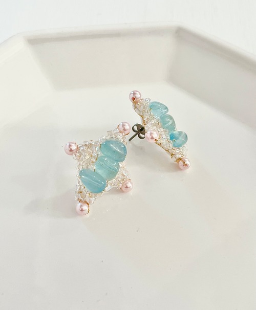 美しいアクアマリンの石をお砂糖菓子のように透明感たっぷりに刺繍して仕上げました