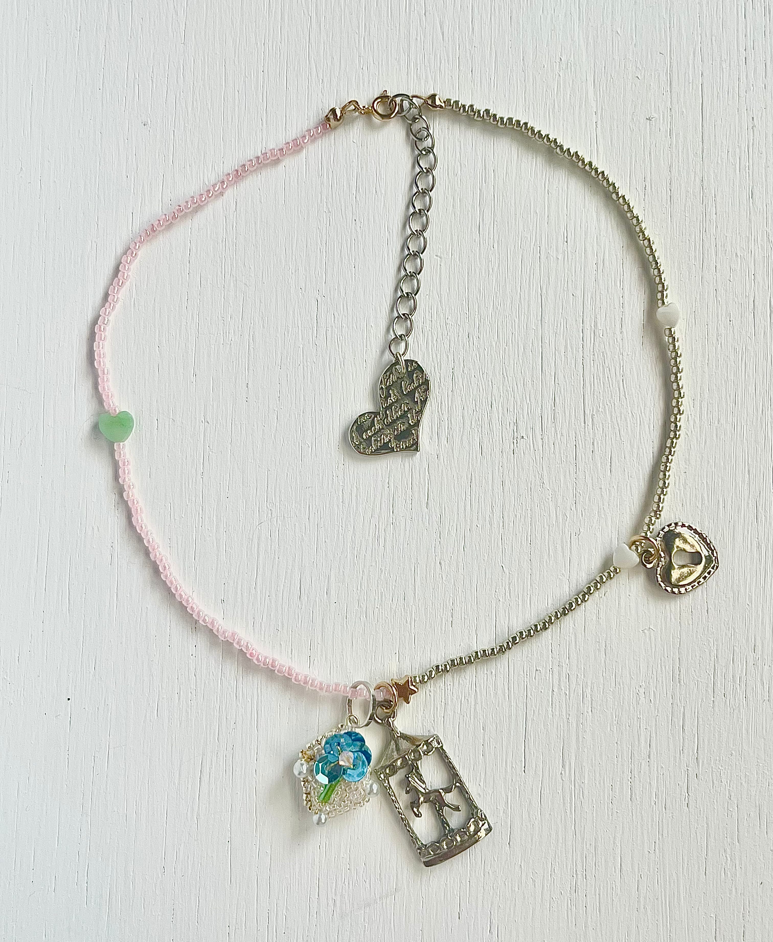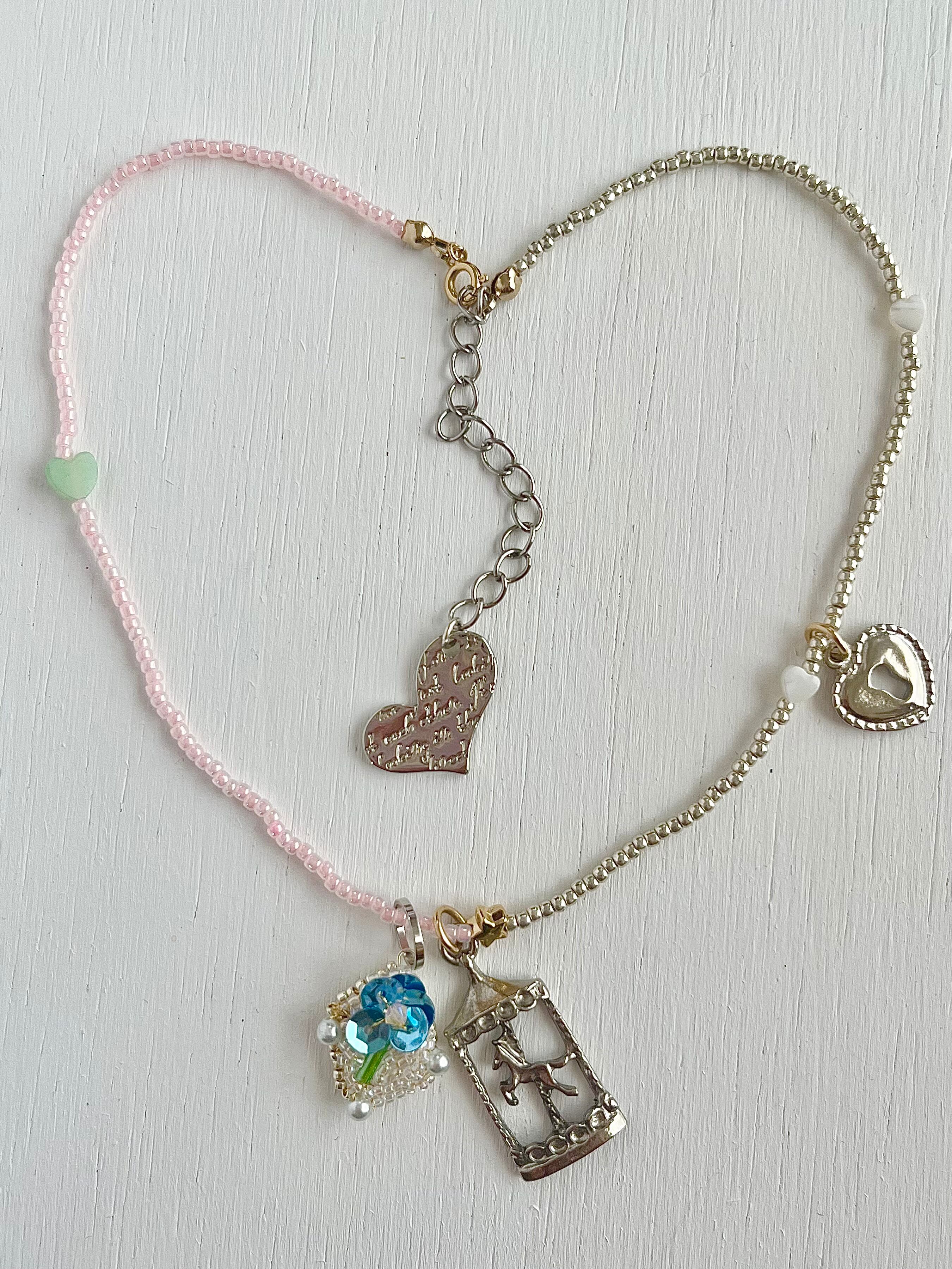 ダルメシアン柄の石、星型のパール、ハートの貝、キャンディーのような小さな天然石などひとつひとつかわいくなるようバランスにこだわりました