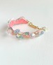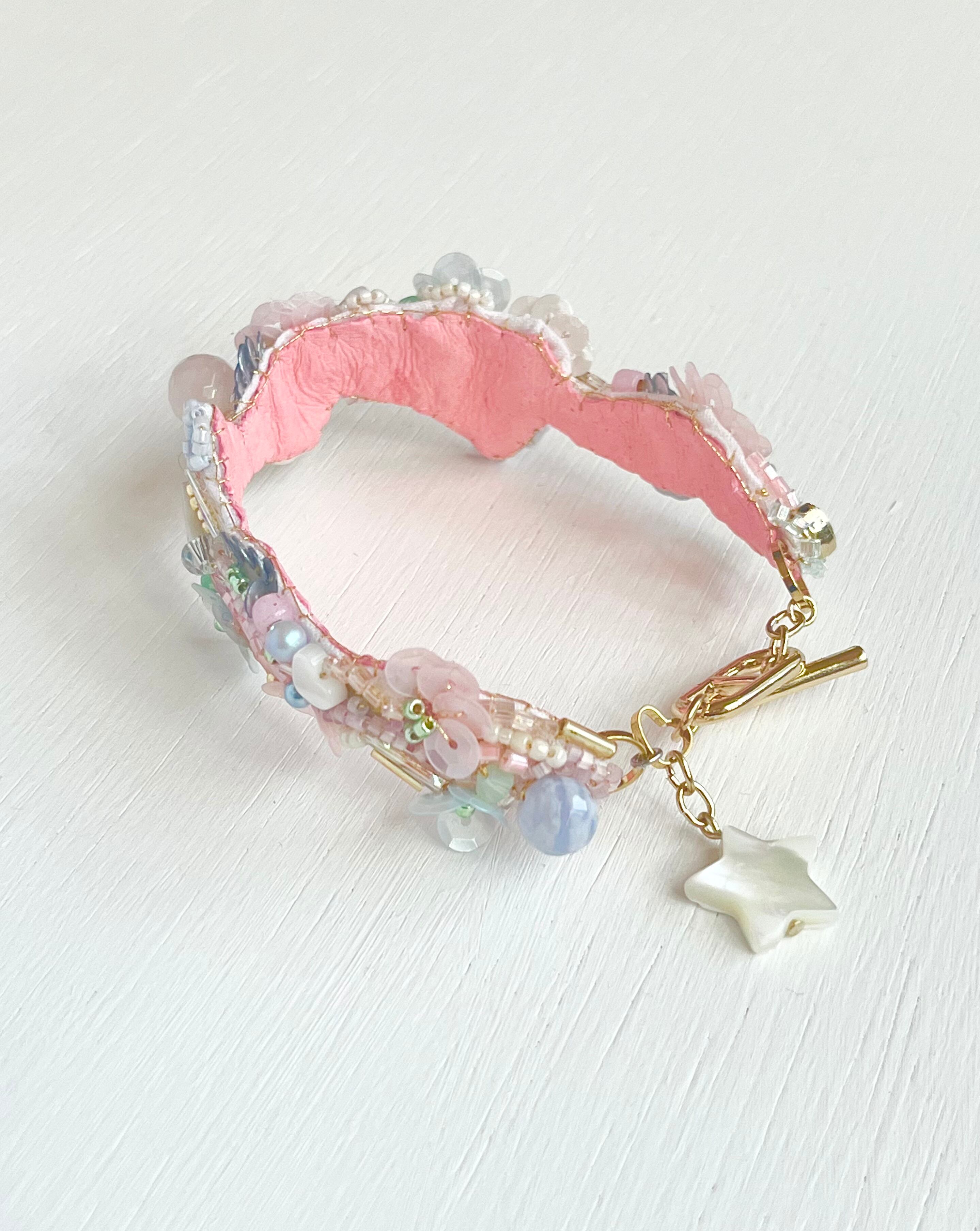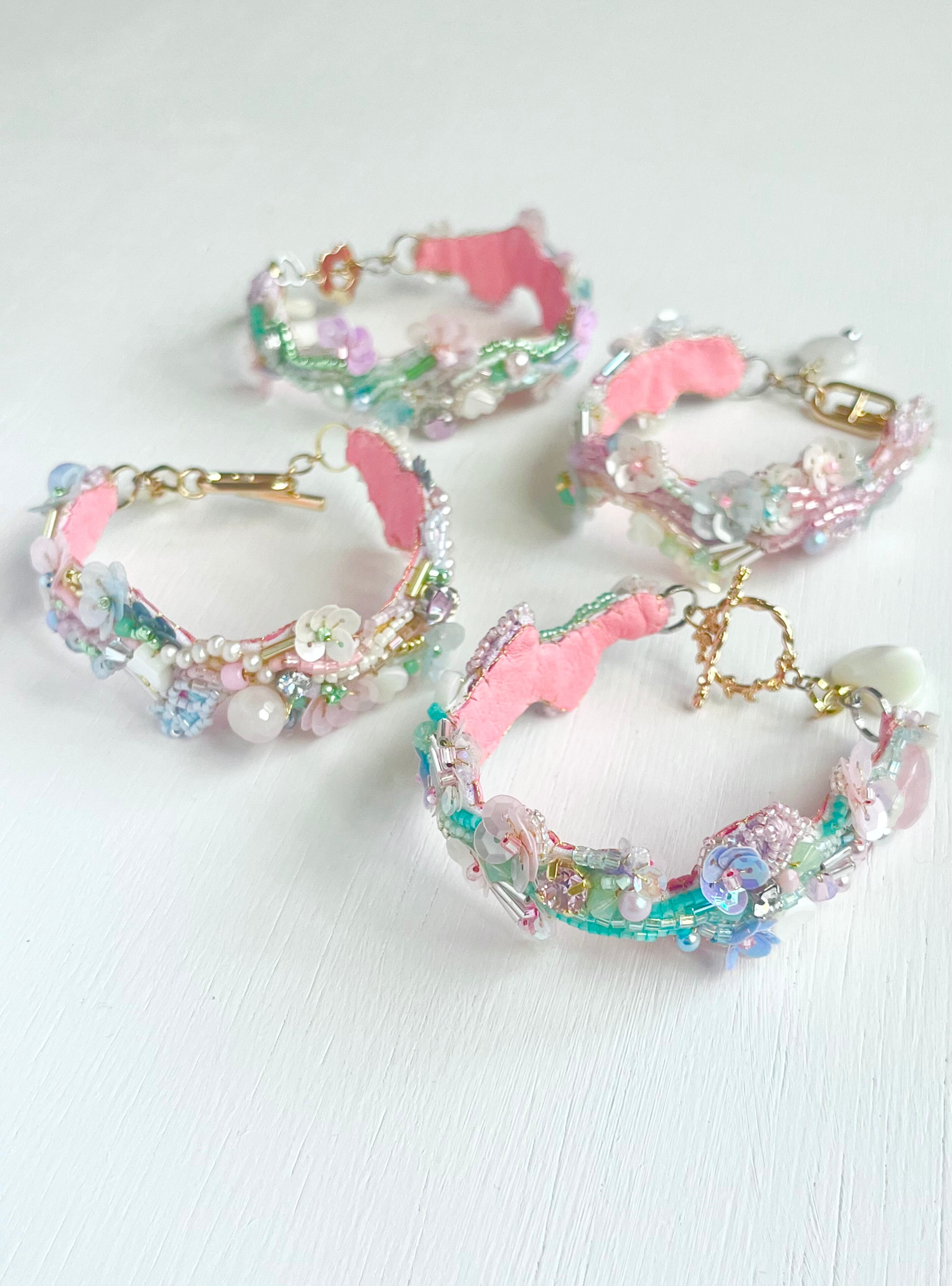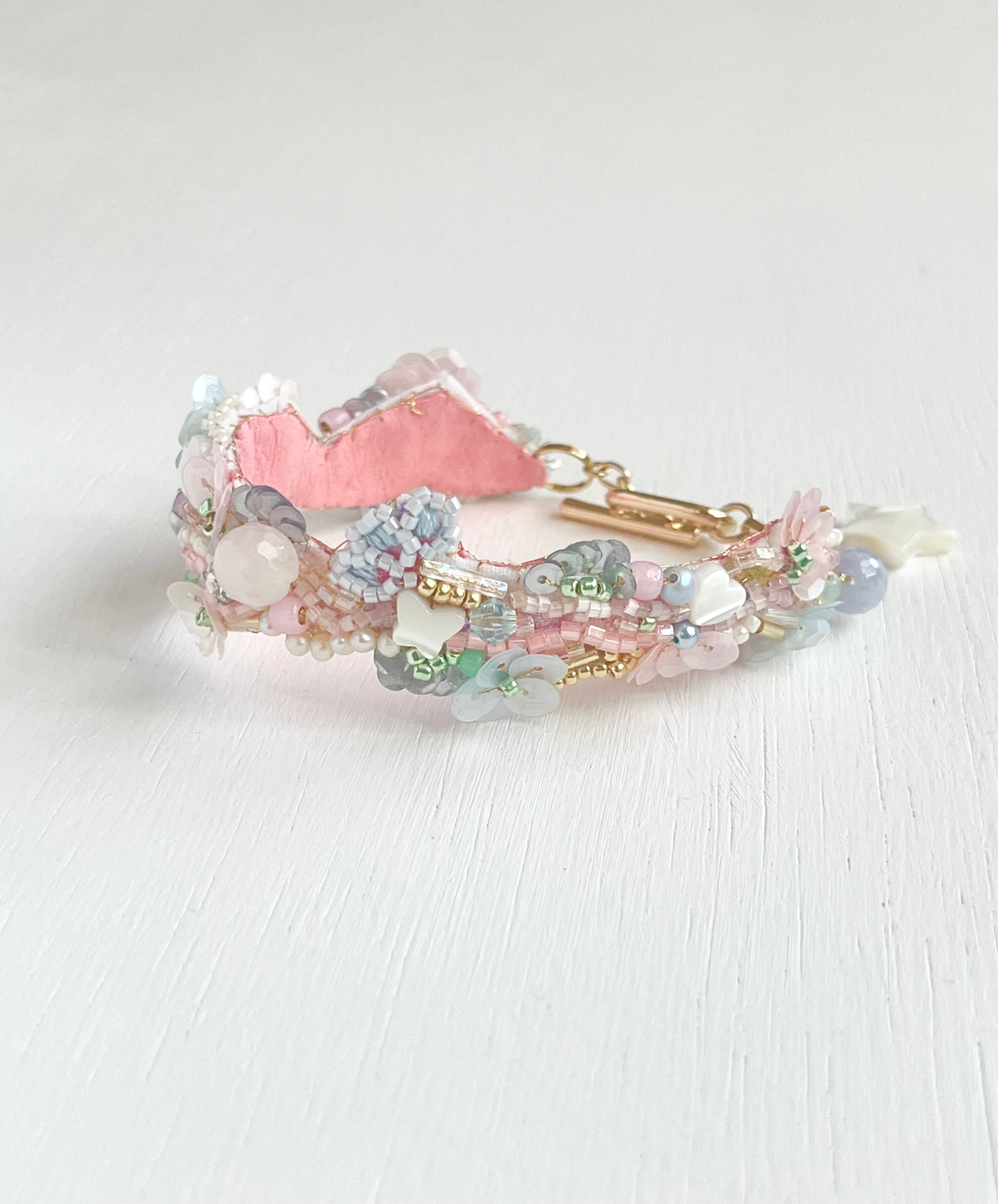 シロツメクサをつなげて花輪にしていくようにひとつひとつ丁寧にすすめているブレスレットのシリーズです
