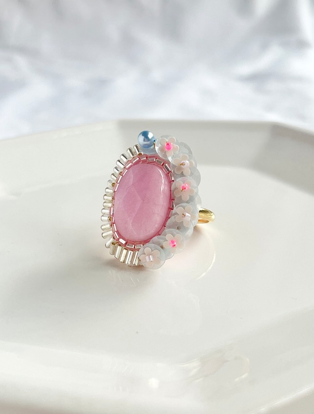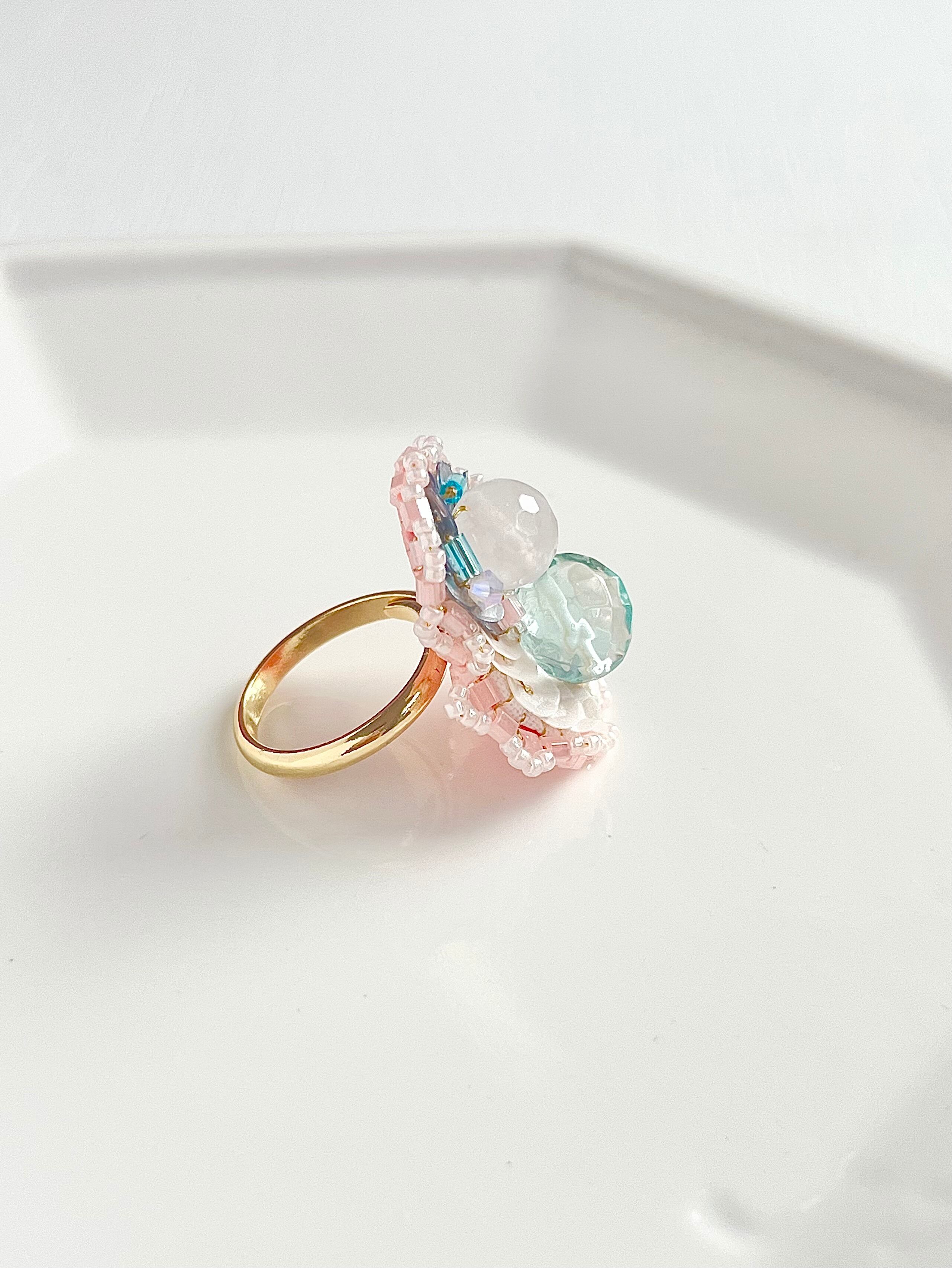 つややかな飴玉のような質感のローズクォーツとグリーンクォーツを遊び心たっぷり上品に仕上げました