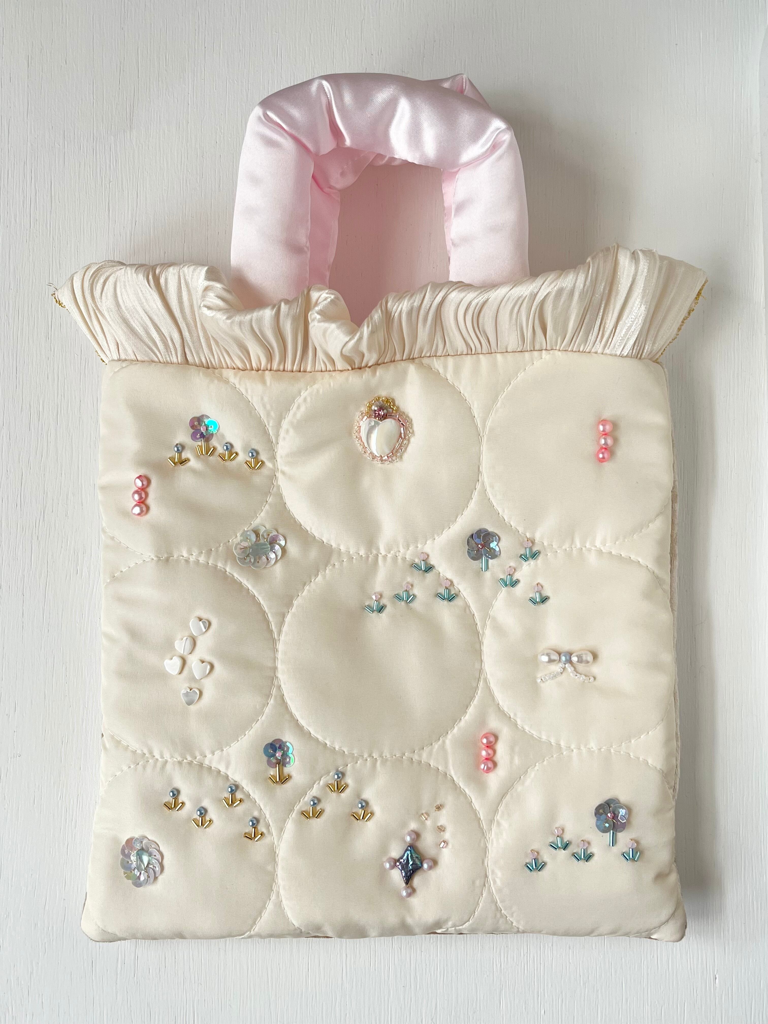 持ち手はサテンのつるっとした手触りで心ときめくアクセサリーのようなばっぐにしたいと思いました
