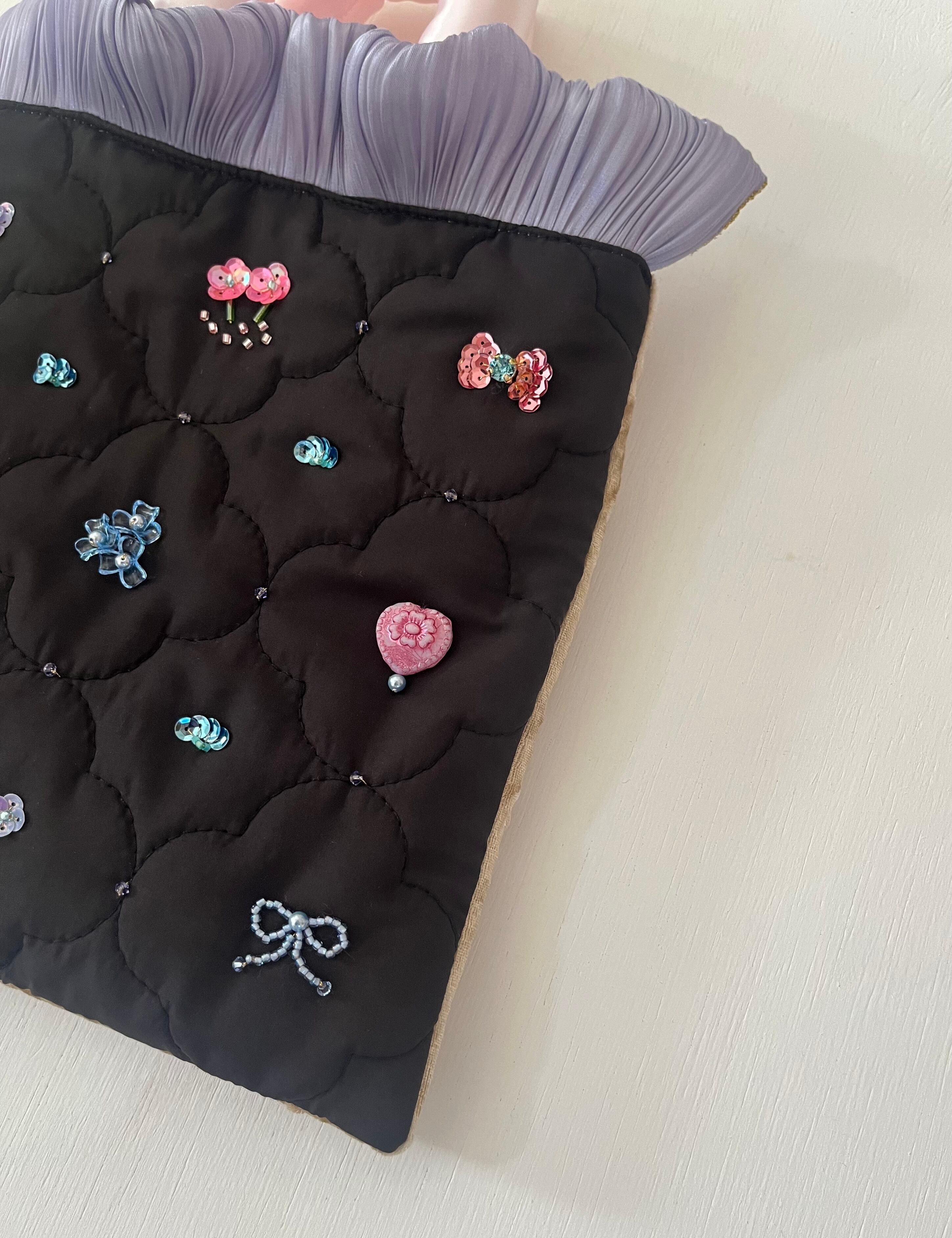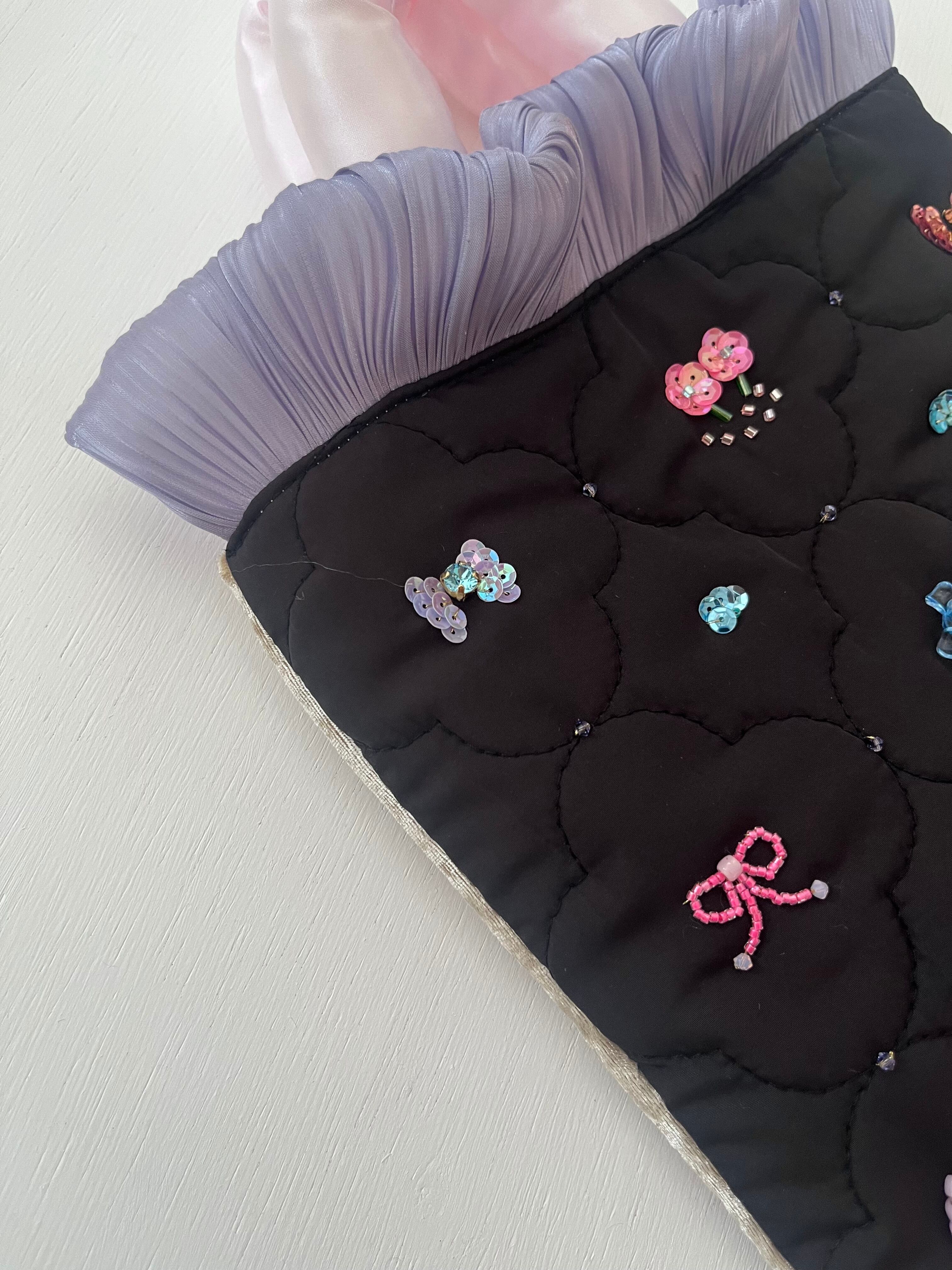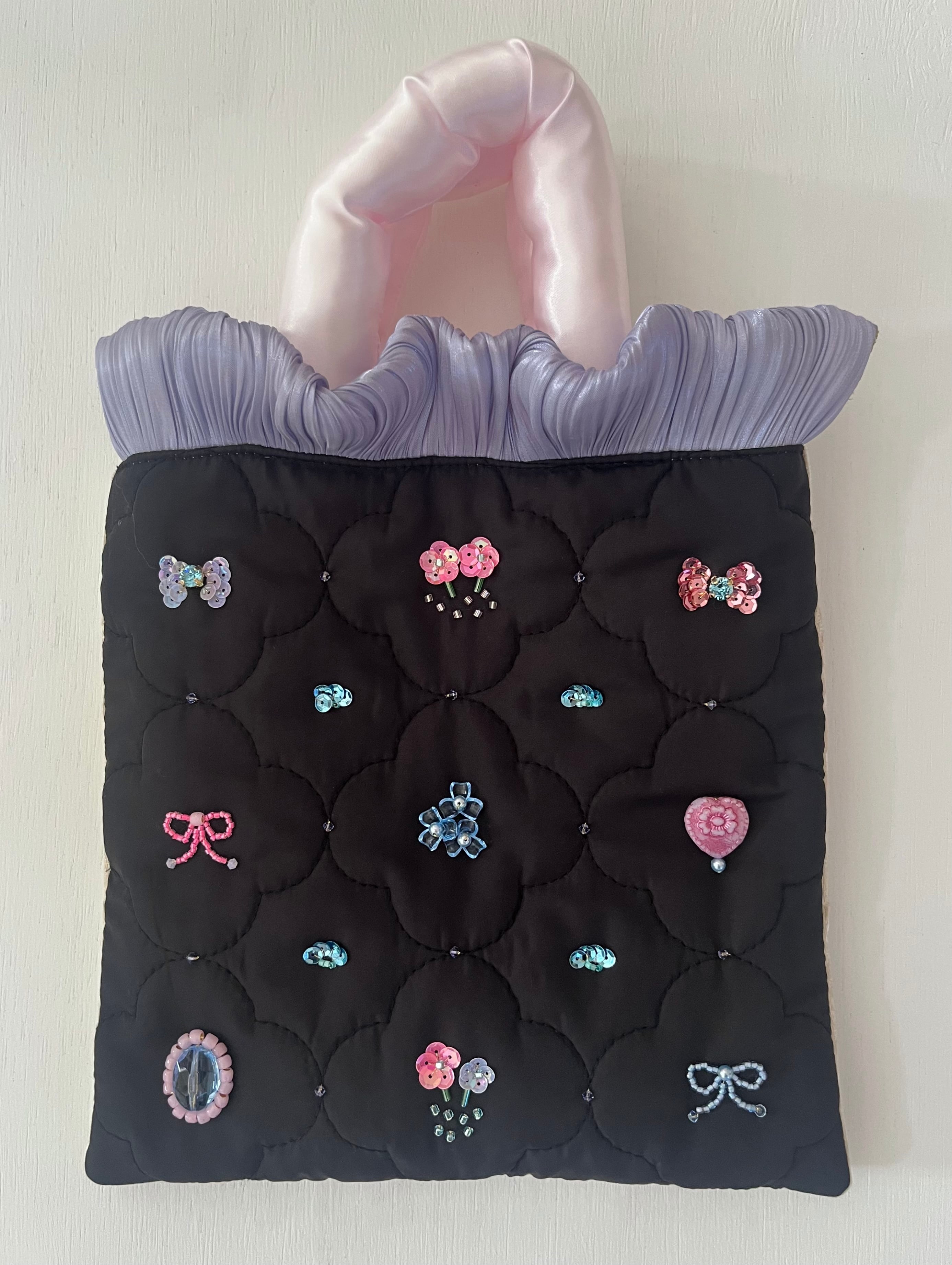 持ち手はサテンのつるっとした手触りで心ときめくアクセサリーのようなばっぐにしたいと思いました
