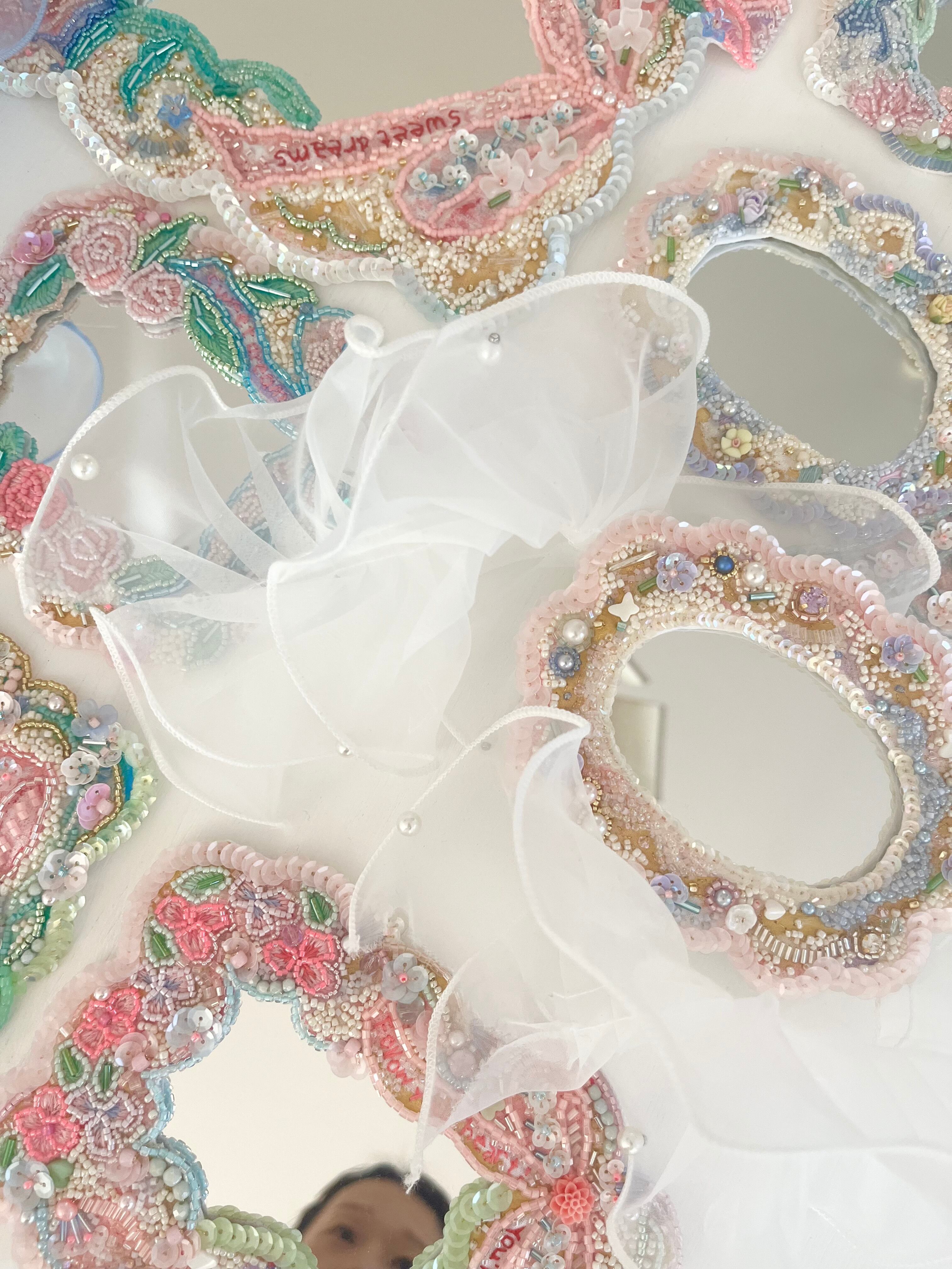 失われた美しいなにか 多くを写さない別世界への入り口 鏡の持つなにか神秘的な雰囲気を 表現したいと思い作り続けているシリーズ フランス産の繊細な色合いのスパンコールをふんだんに使用して ロマンチックな気分の入り口になるよう制作しました ◯素材 コットン生地、金糸、フランス産スパンコール、アクリル絵の具、天然石、ガラスビーズ、裏布にフェルト