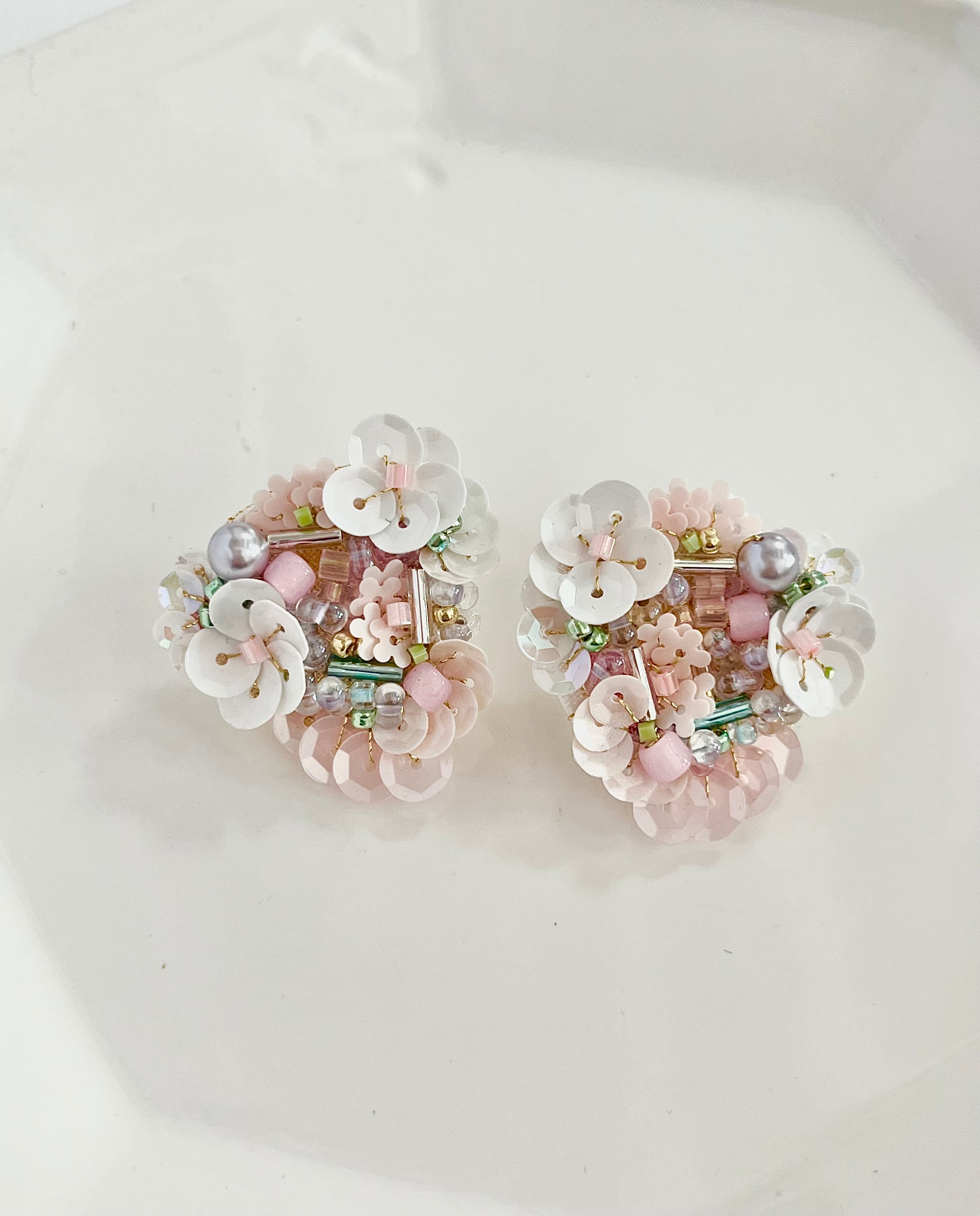 花びら、羽を思わせるようなピンクのスパンコールはフランス産のものを使用しています