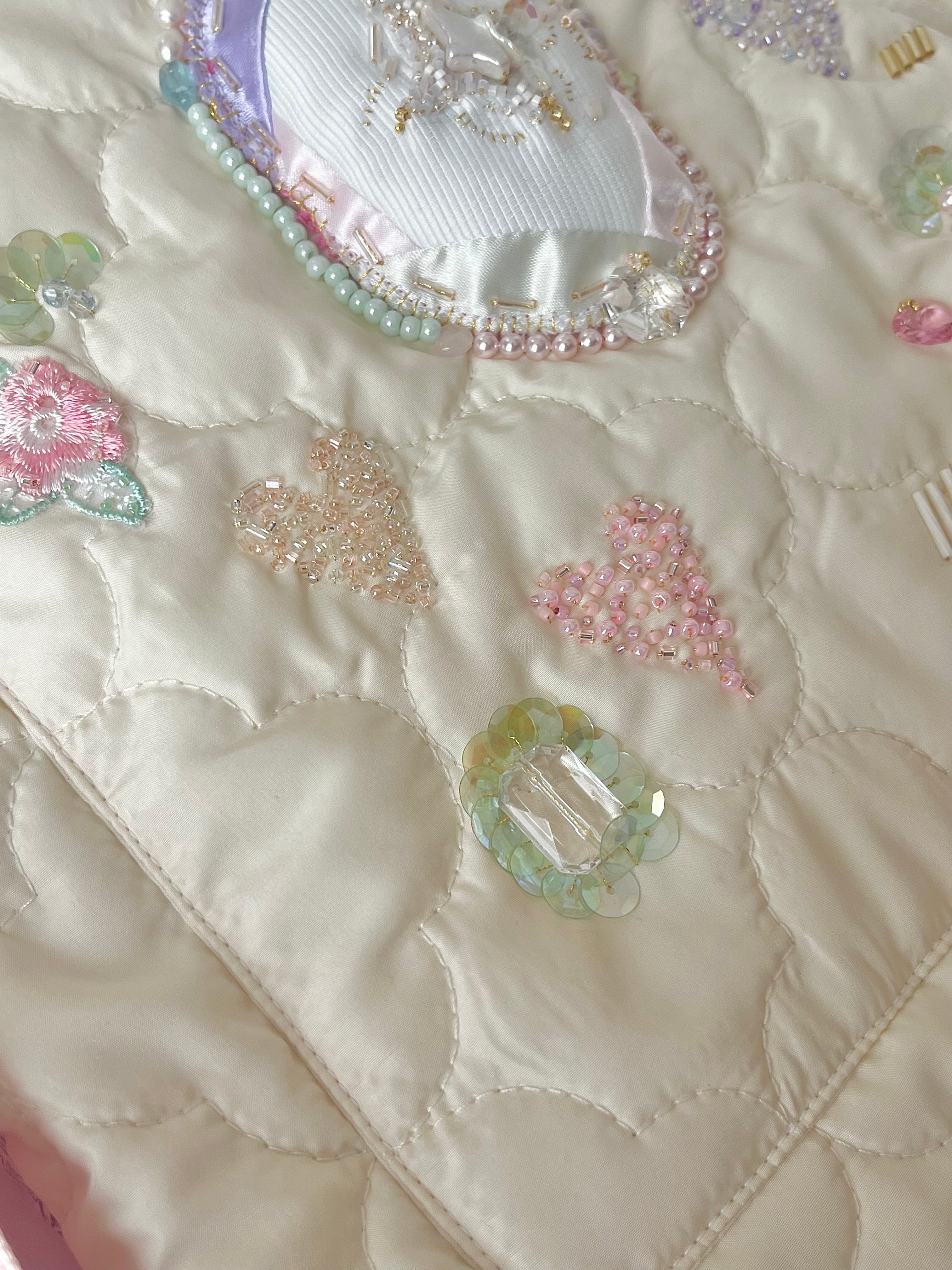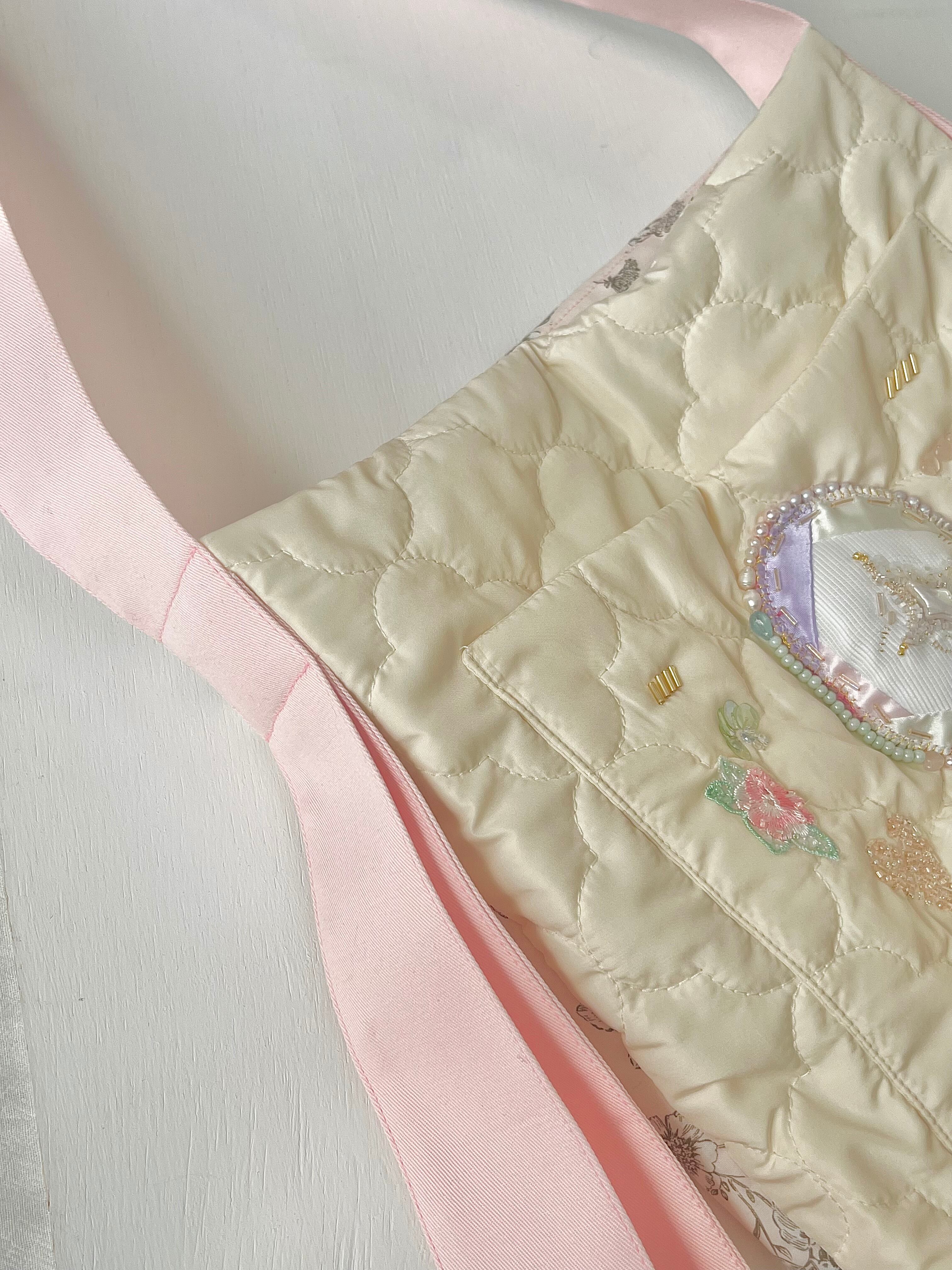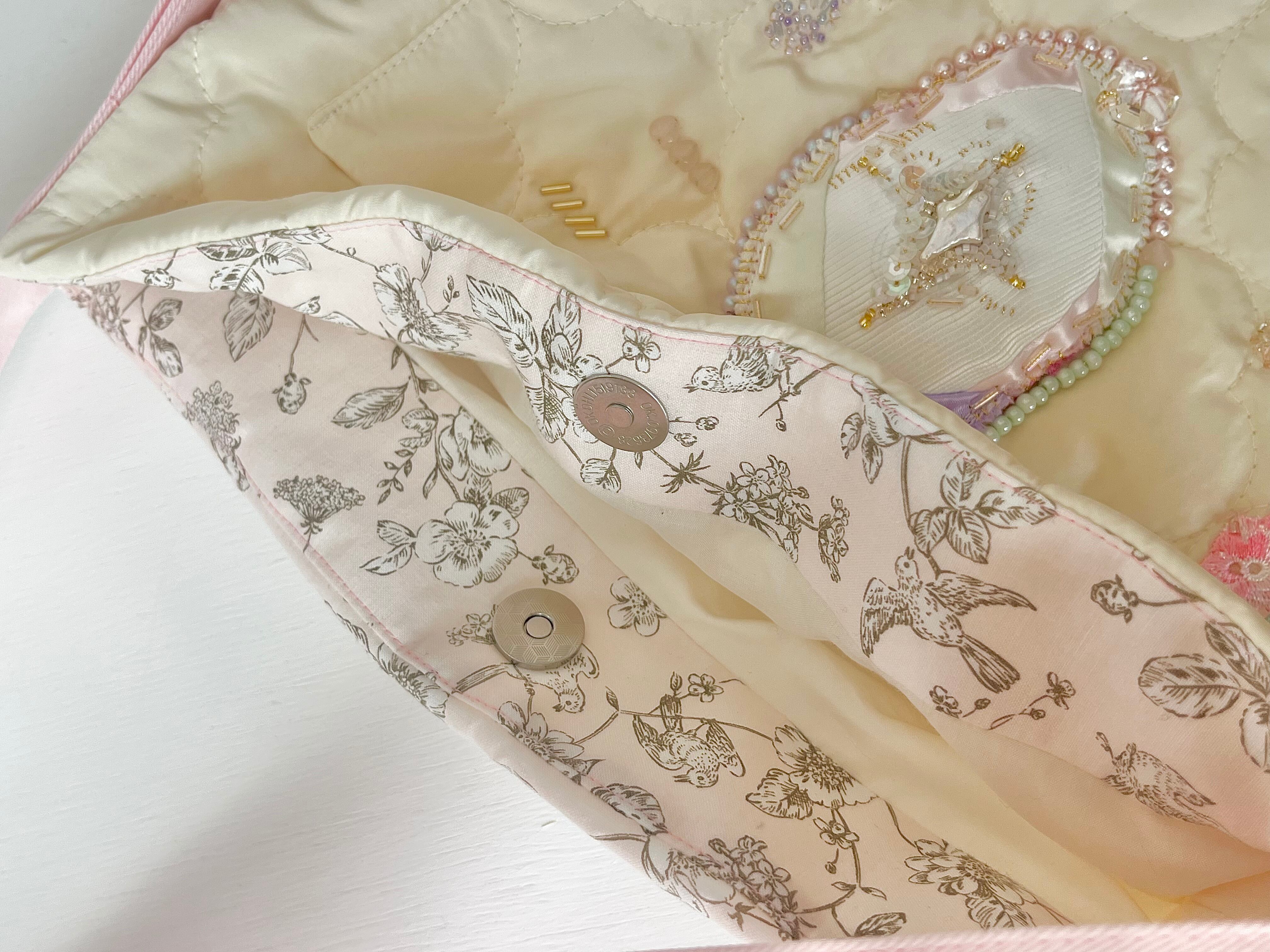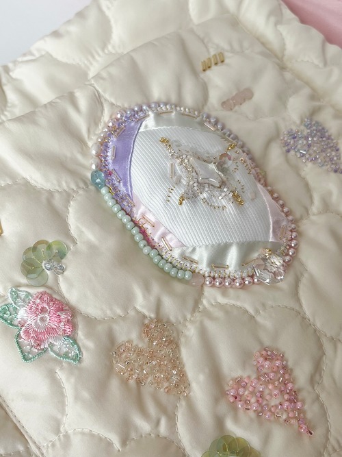 小さく光るガラスビーズ、つやつやのサテン、個性的な天然石など、潜む小女性を丁寧に刺繍して贅沢なポケットを制作。