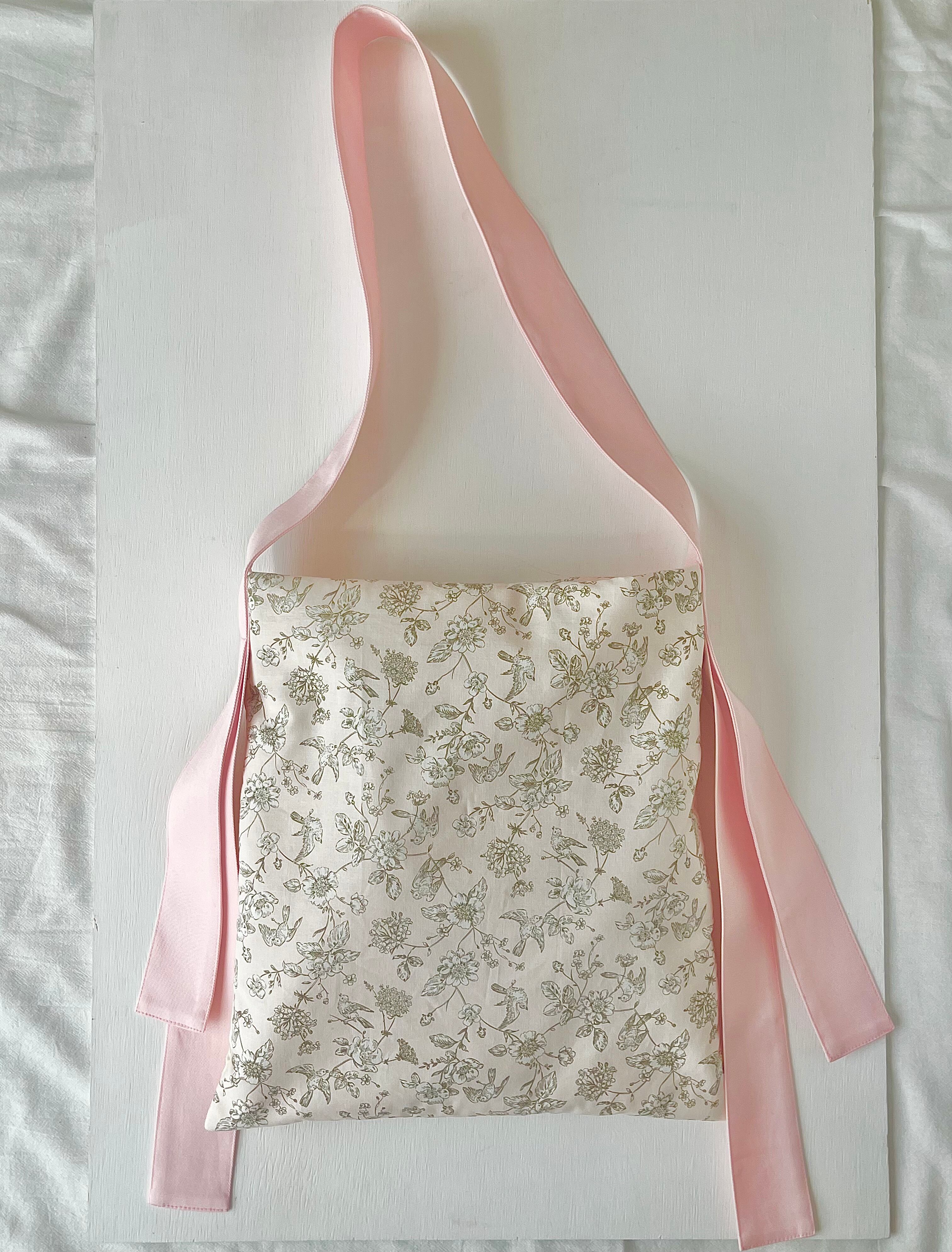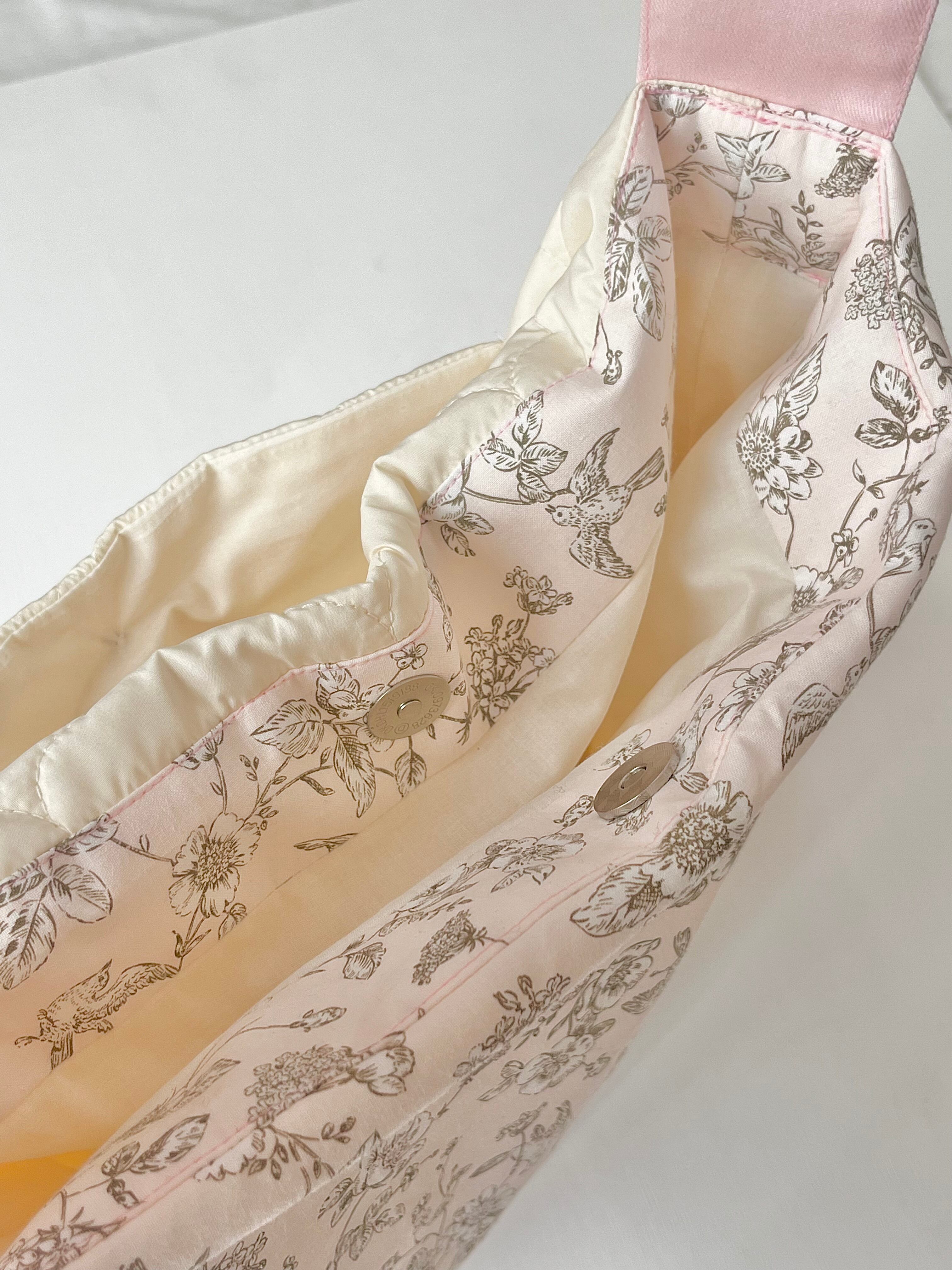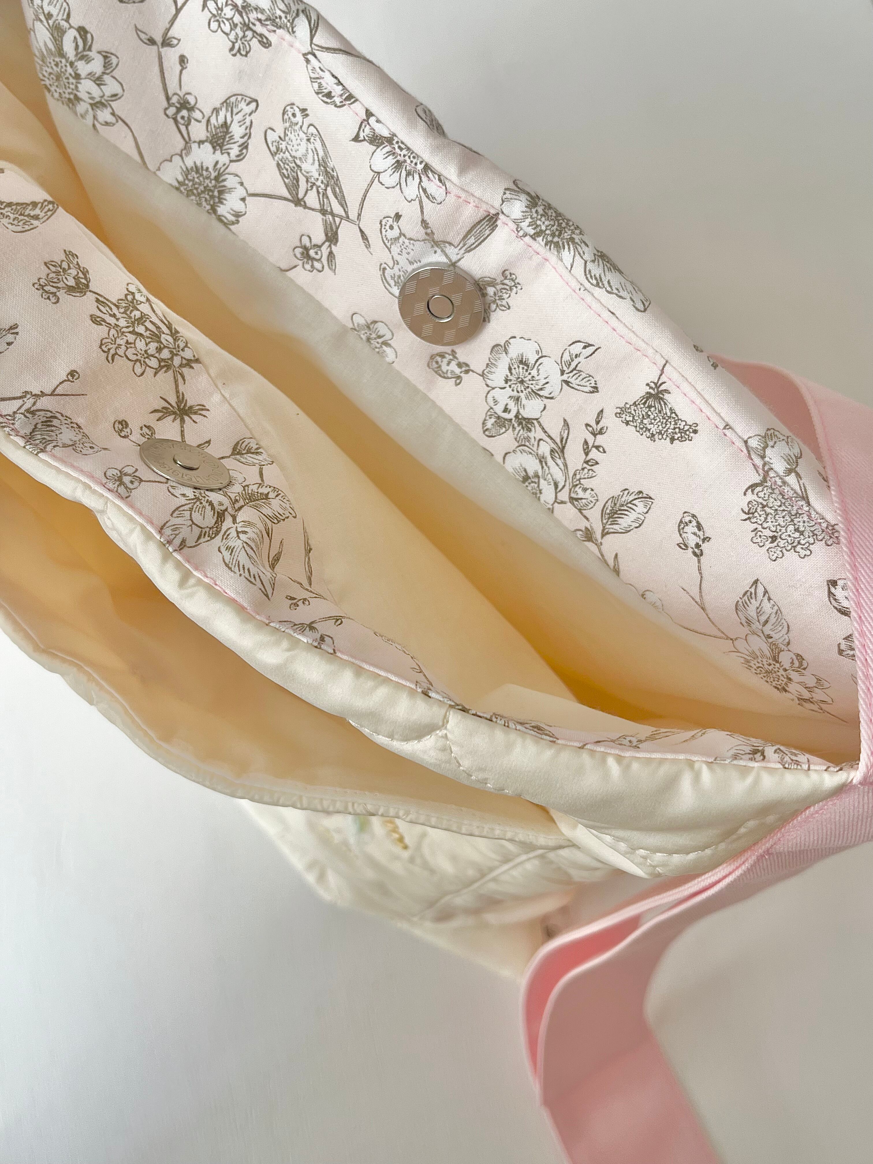 バッグの後ろ姿には、植物と鳥が描かれた美しい柄の生地を合わせてロマンチックな雰囲気に。
