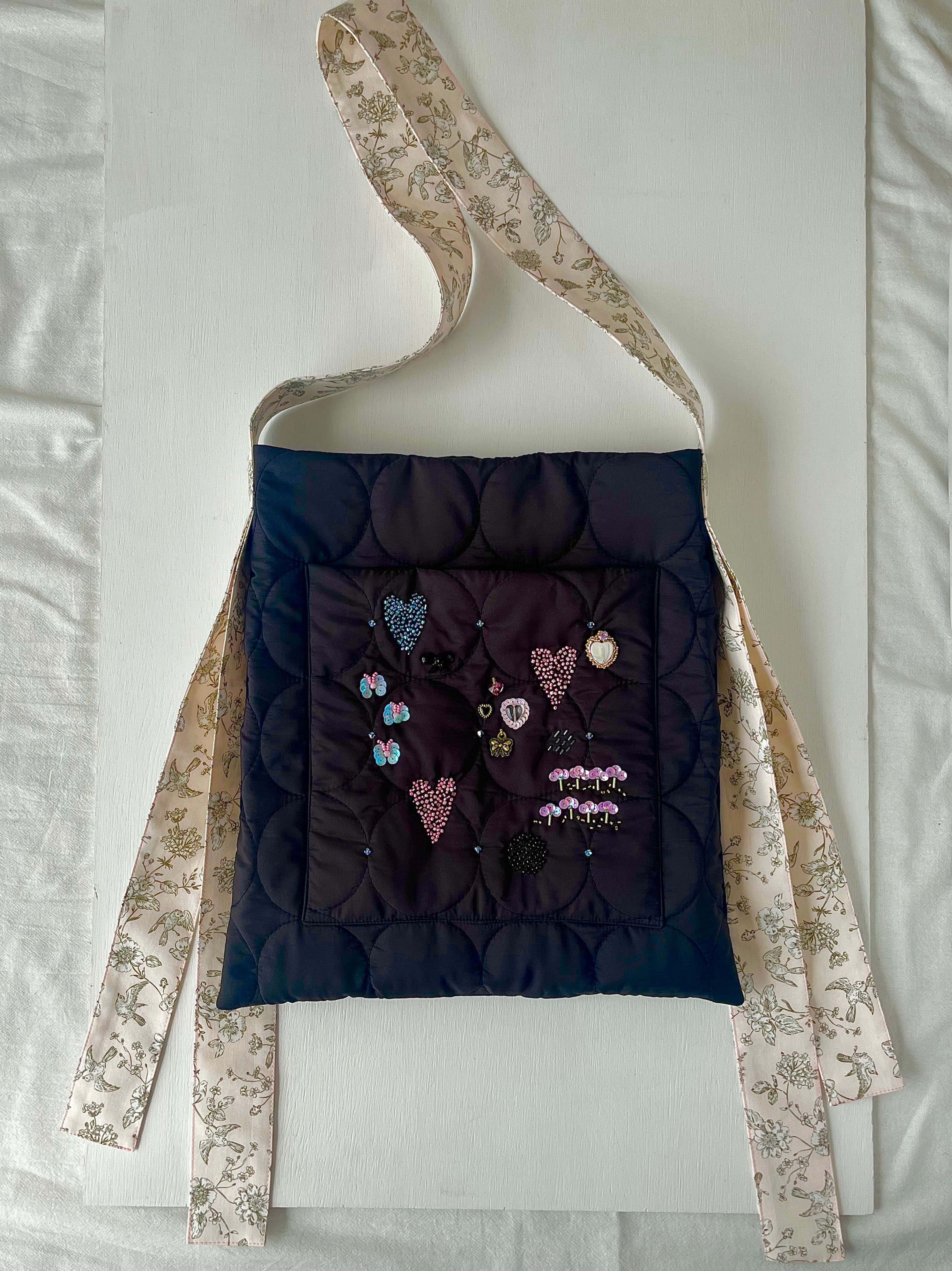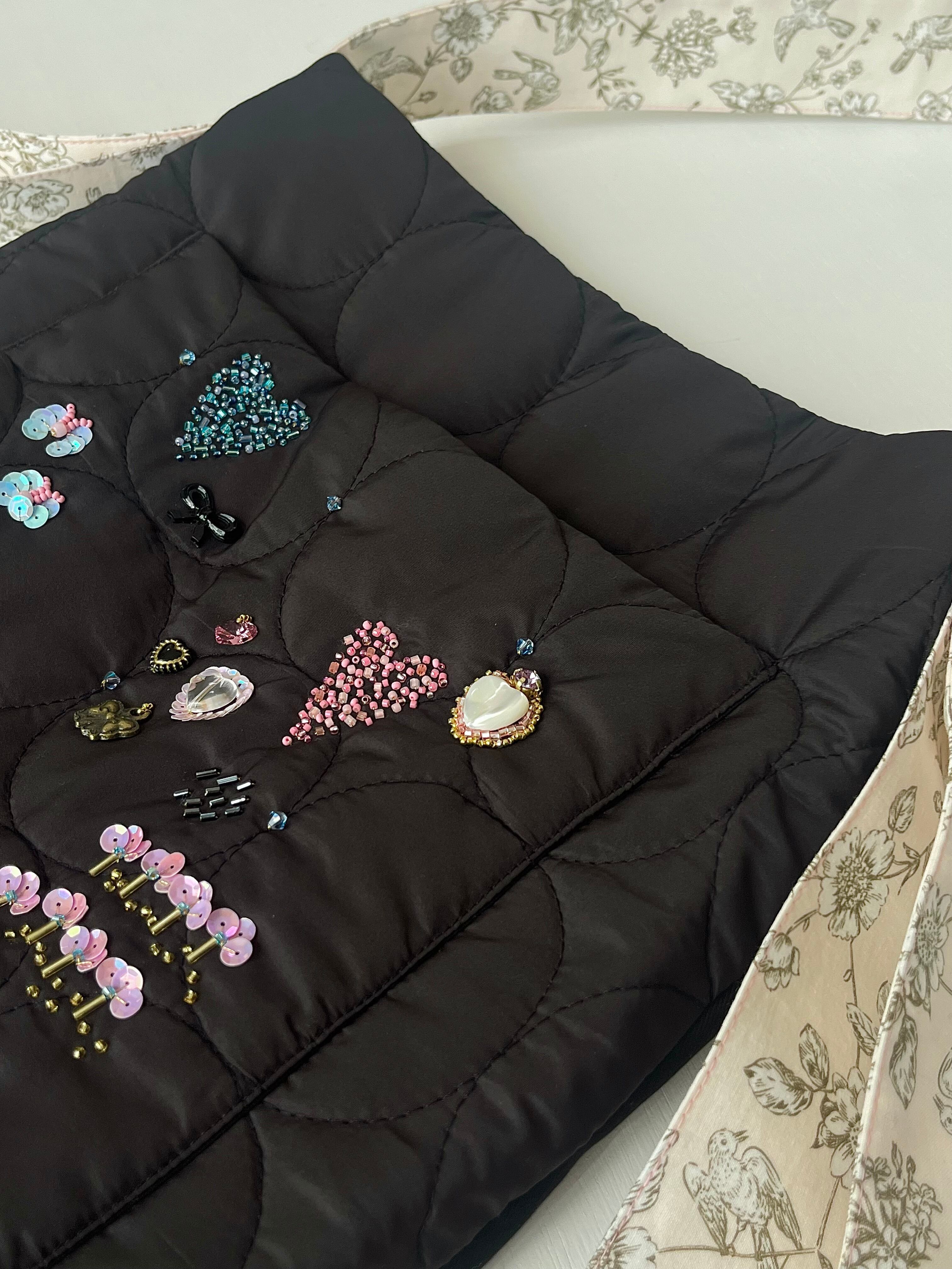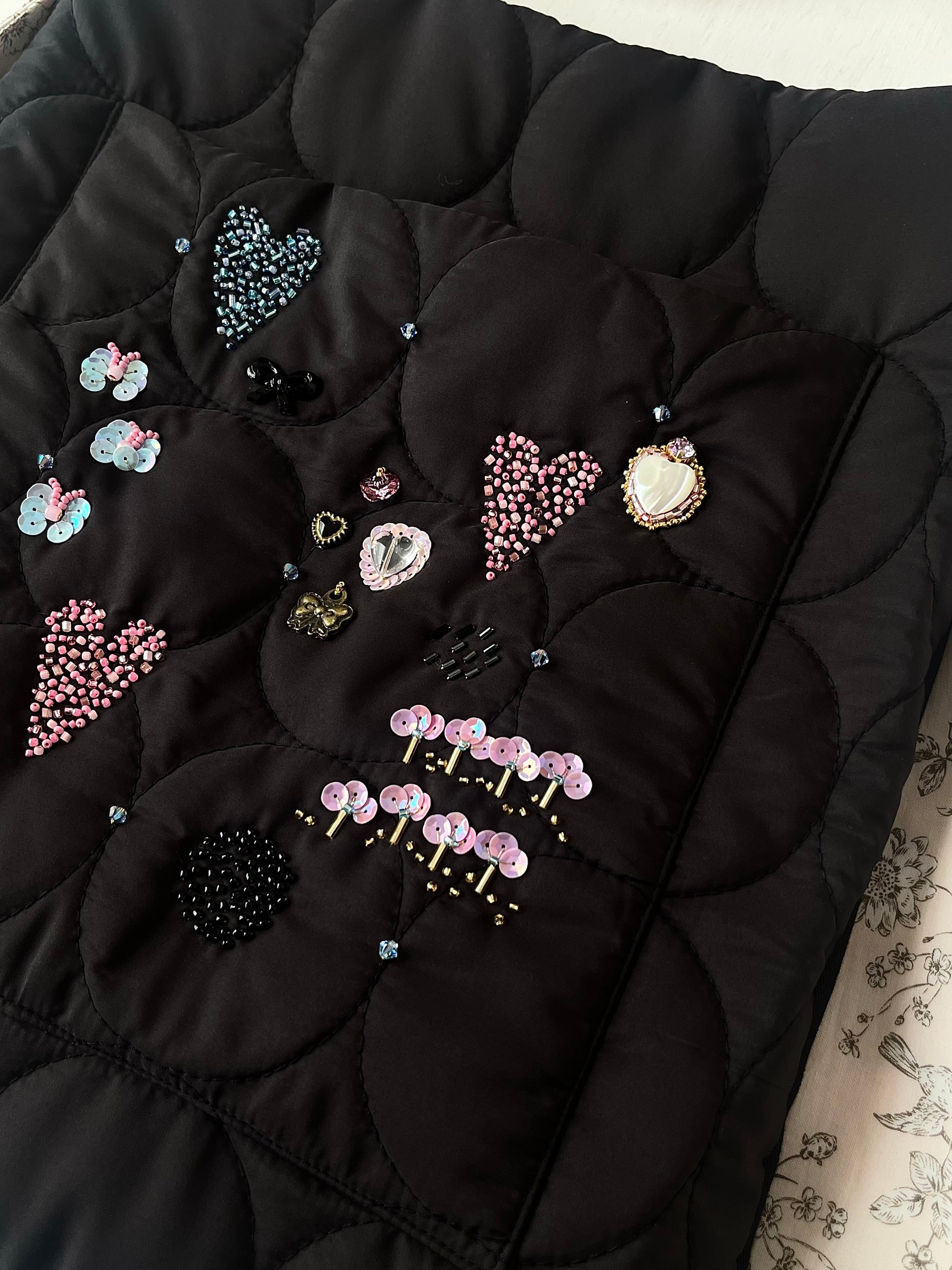 小さく光るガラスビーズ、キュートなおもちゃのビーズ、愛しい天然石など、潜む少女性を表すように丁寧に刺繍して贅沢なポケットを制作。