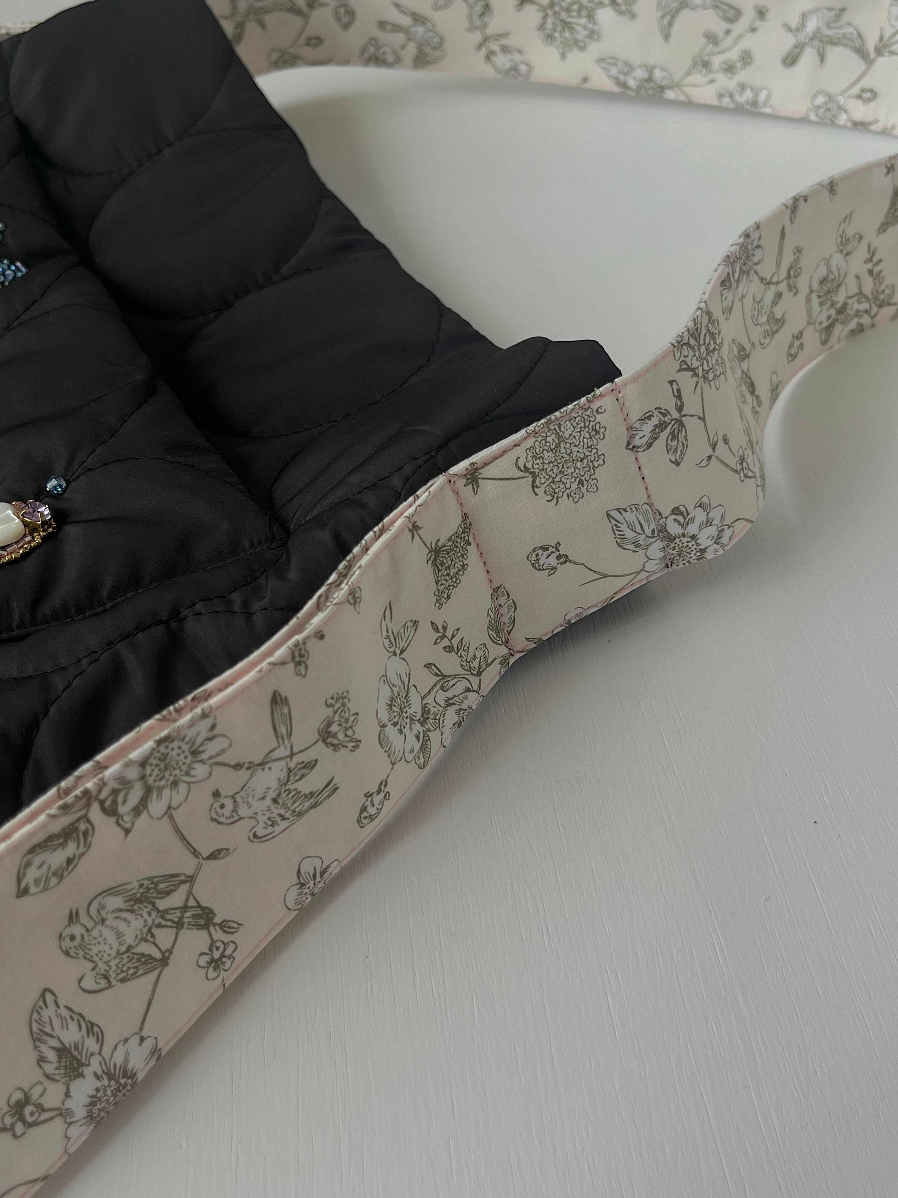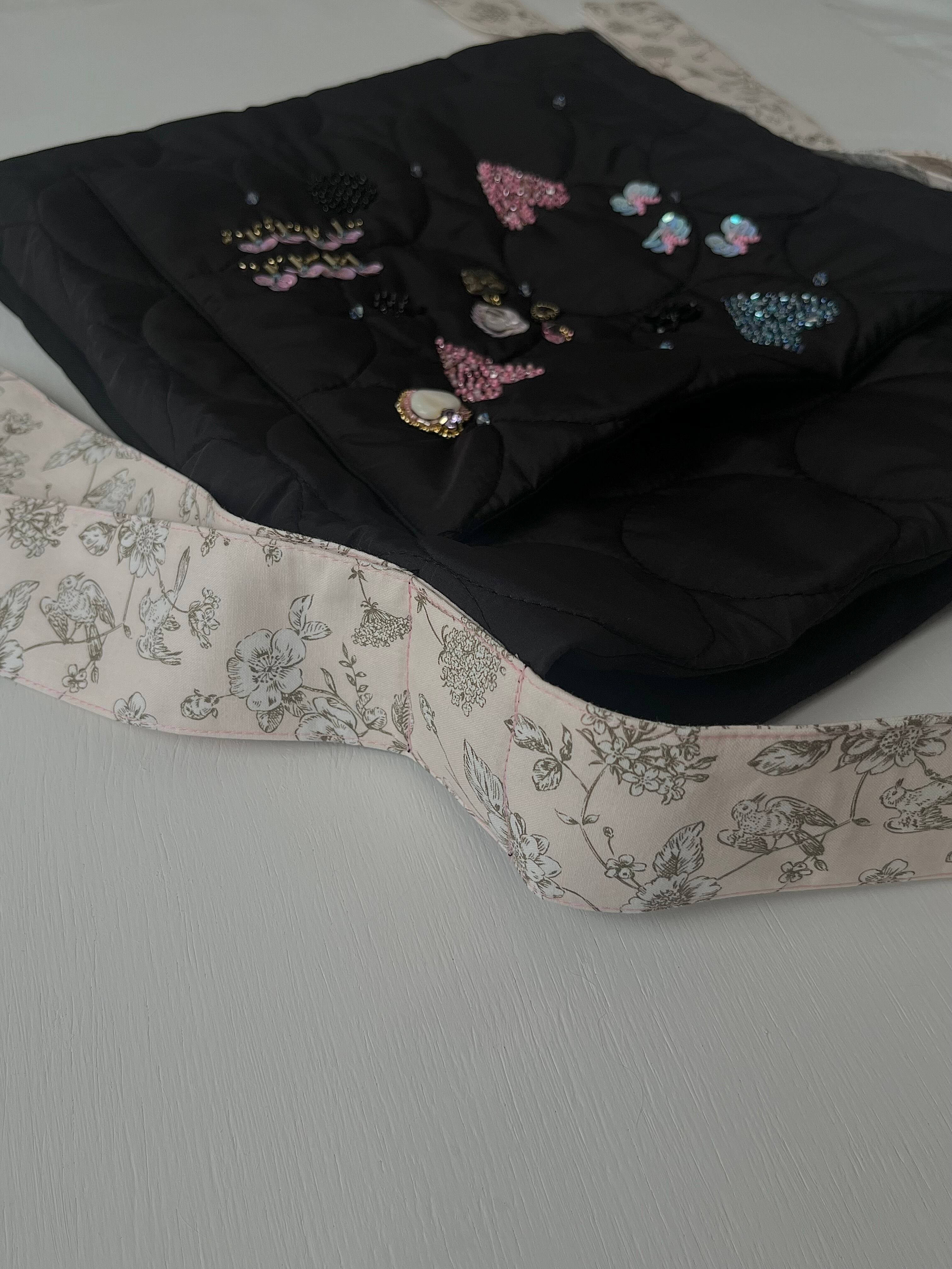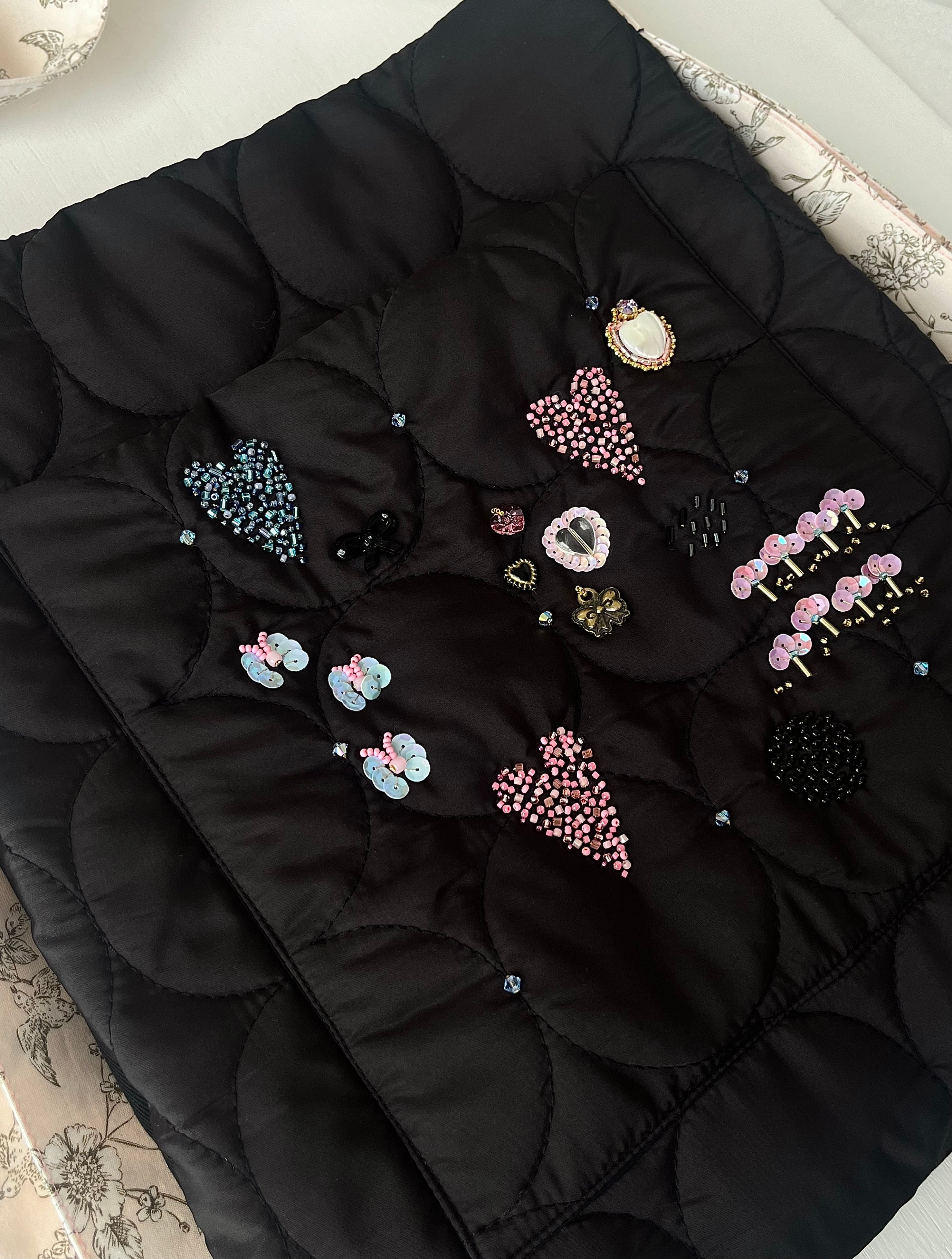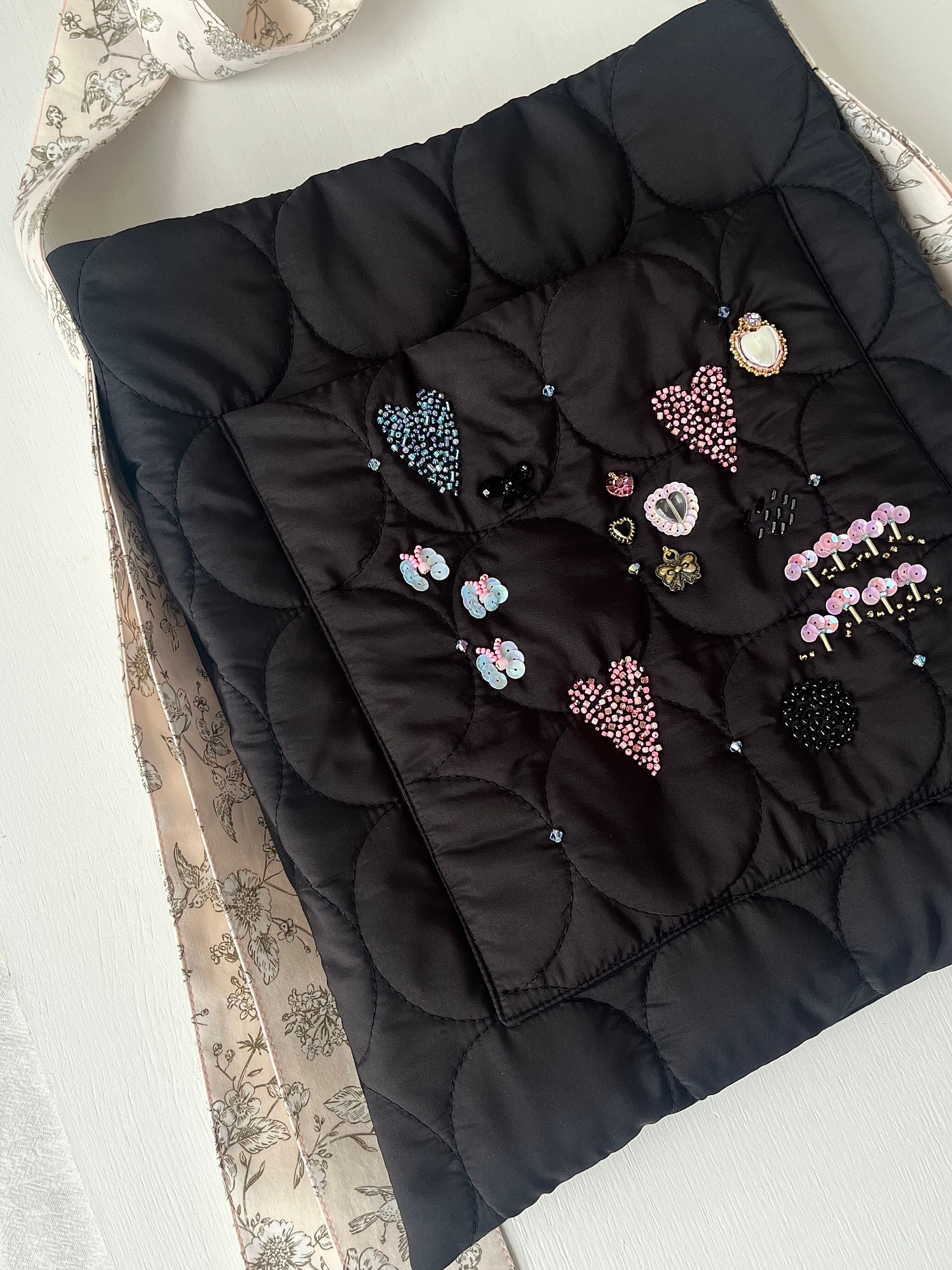小さく光るガラスビーズ、キュートなおもちゃのビーズ、愛しい天然石など、潜む少女性を表すように丁寧に刺繍して贅沢なポケットを制作。