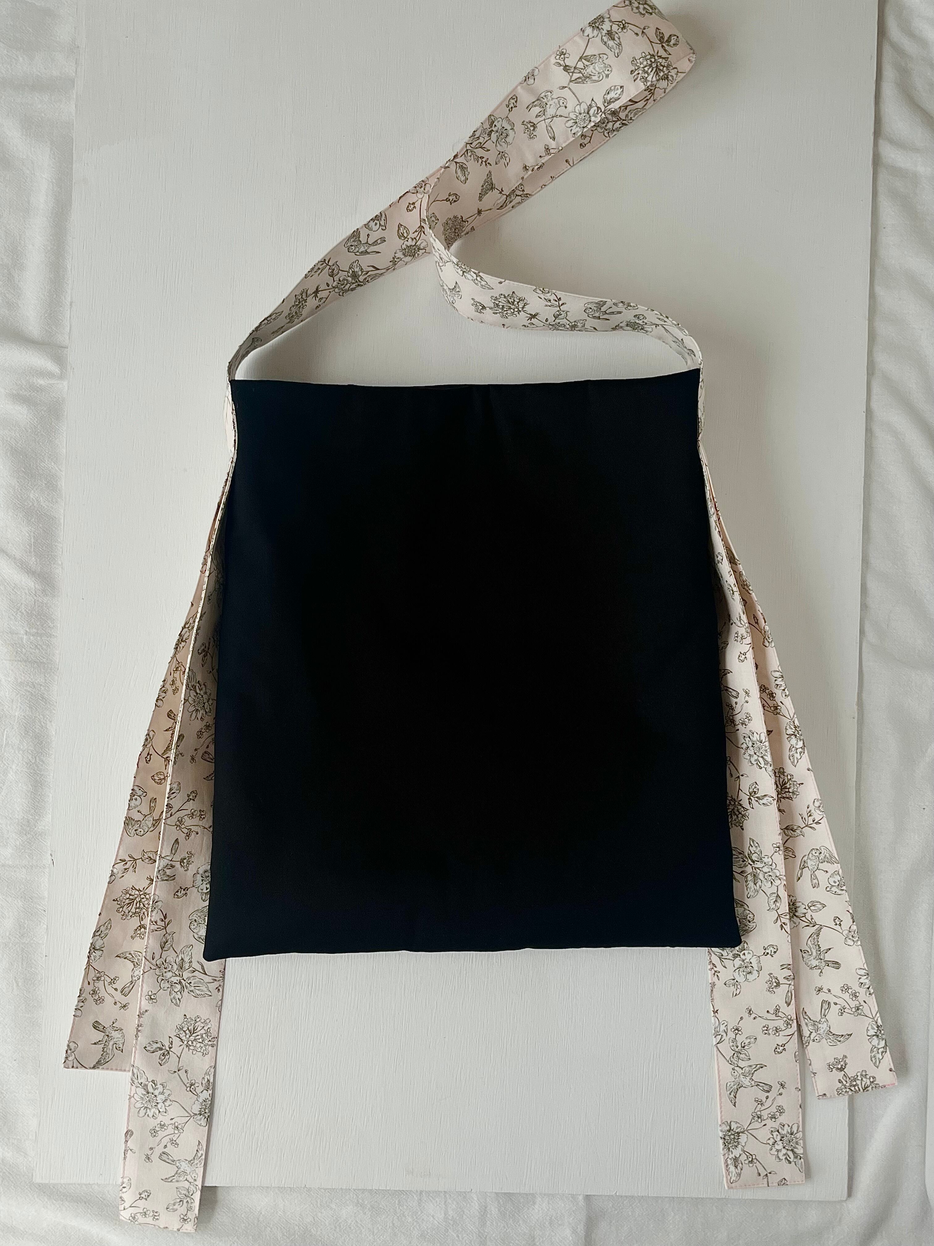 ショルダーリボンには植物と鳥が描かれたロマンチックな生地を合わせてロマンチックな雰囲気に。