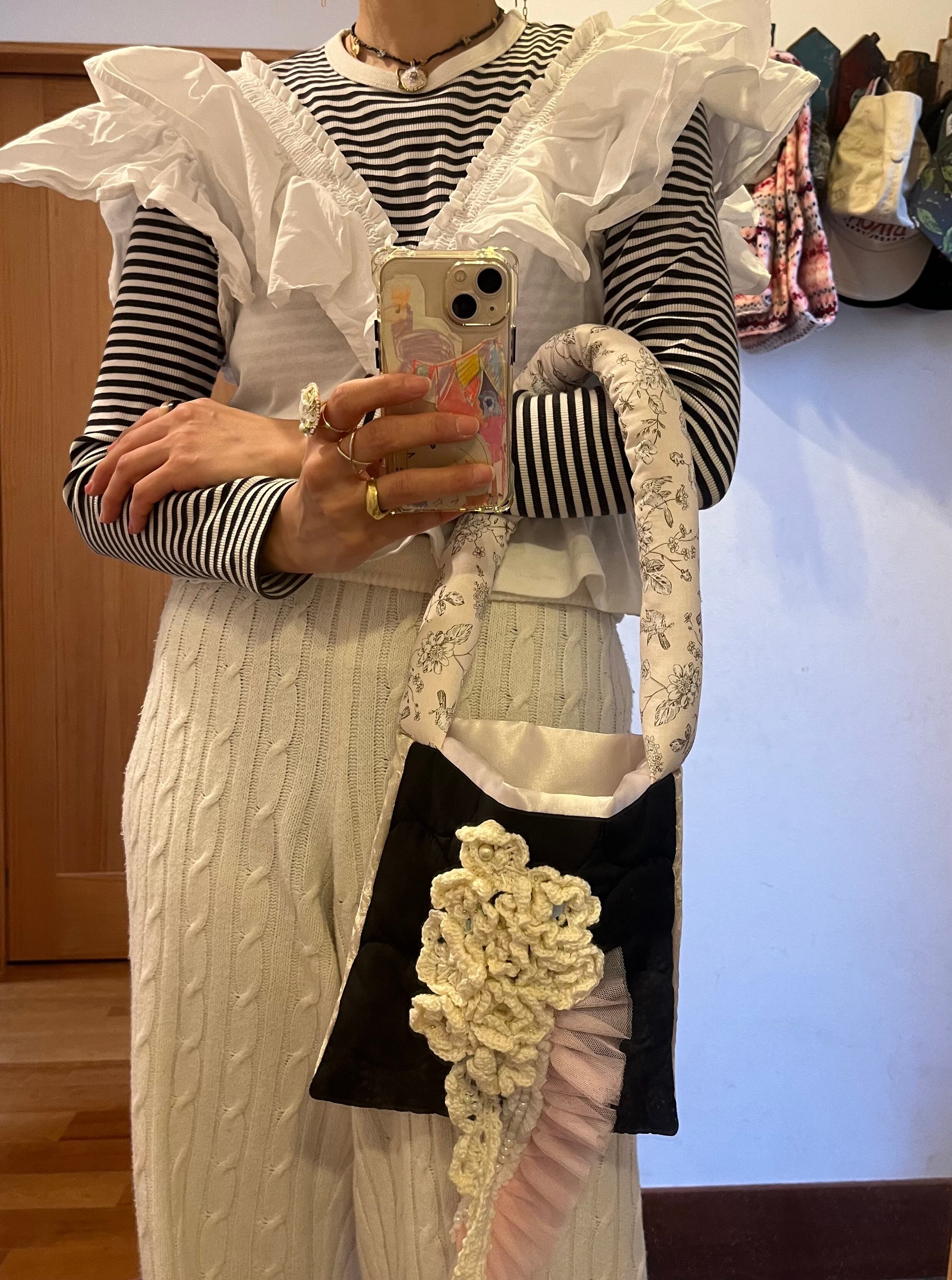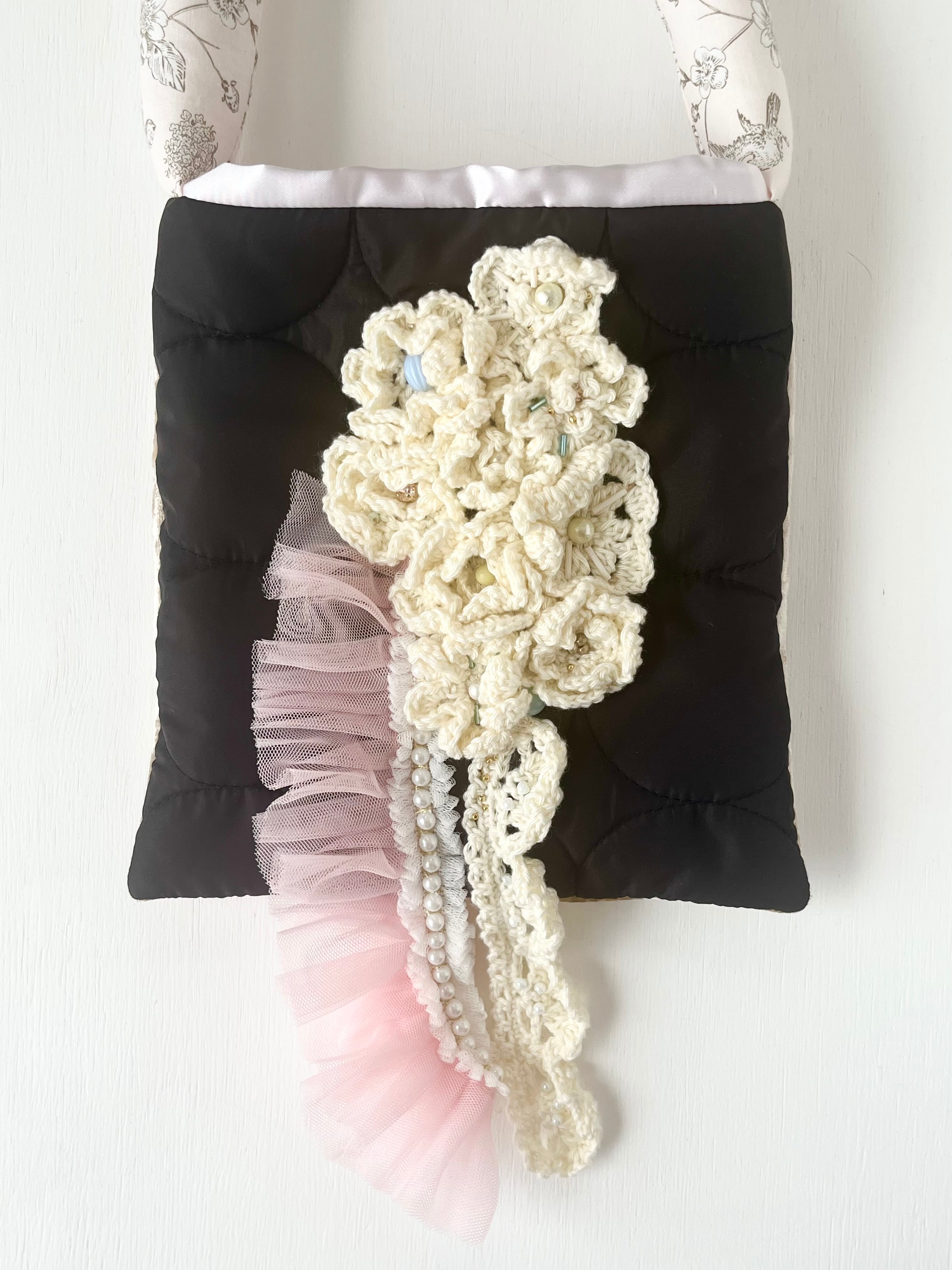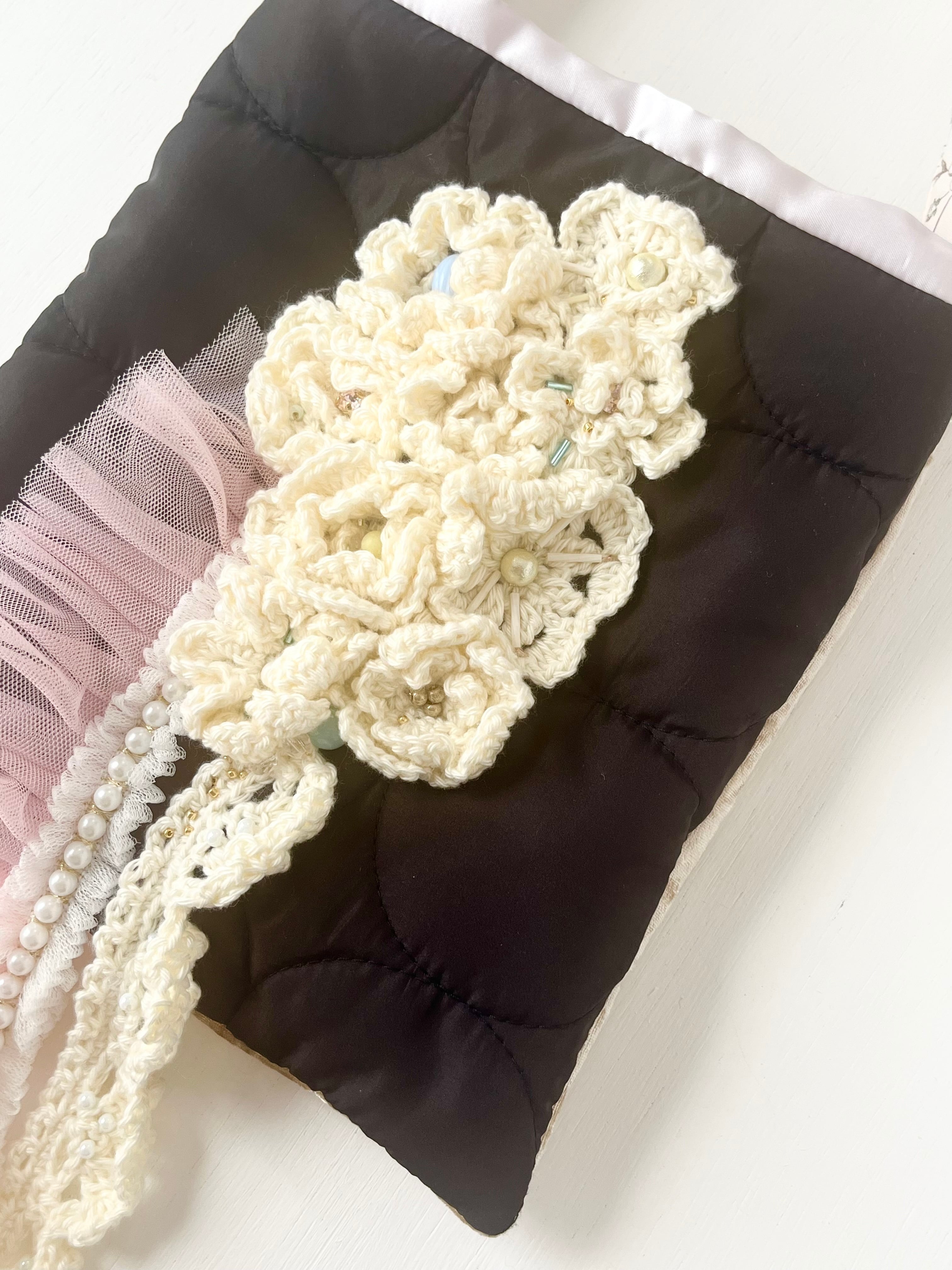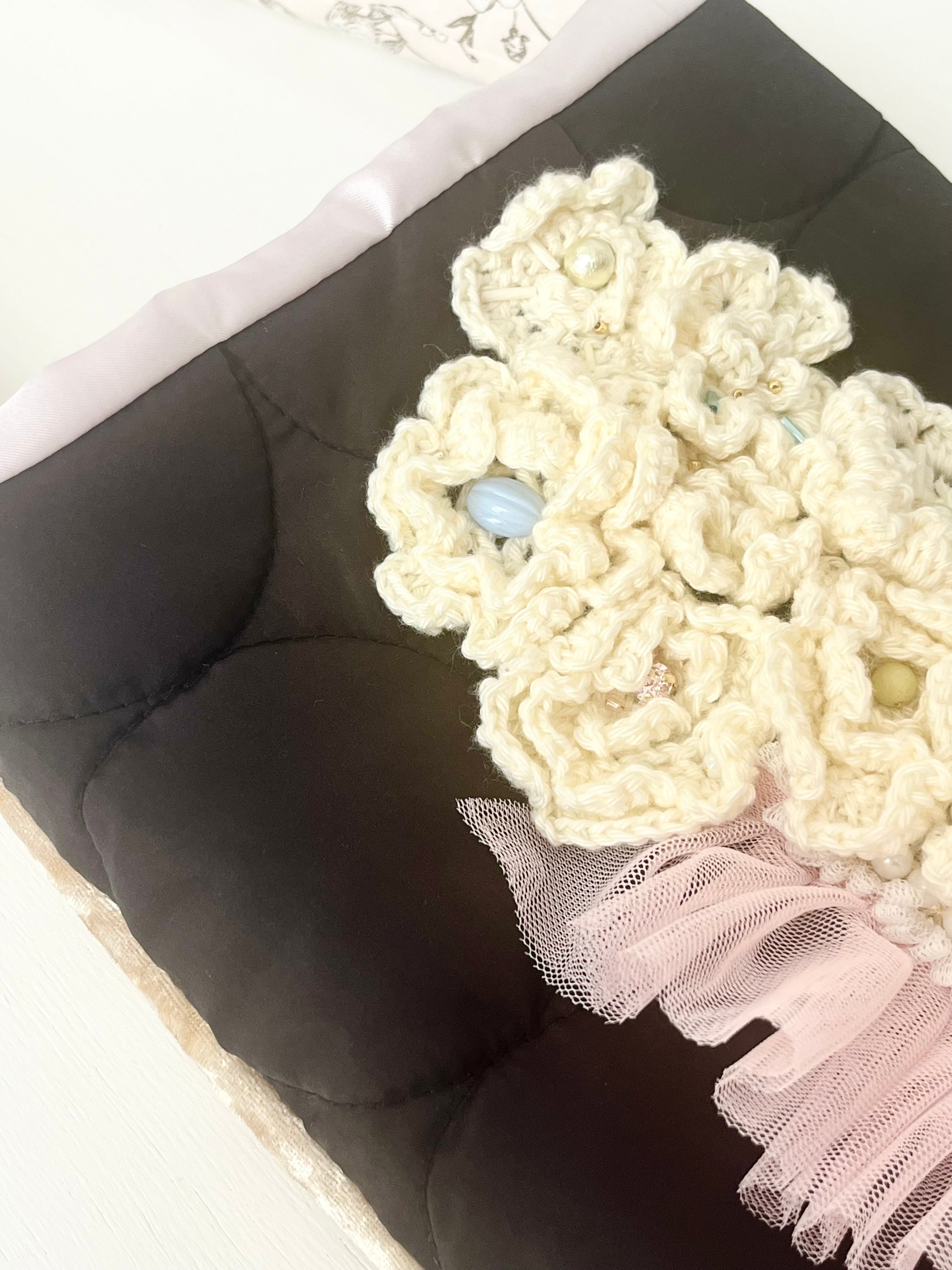 白いお花をたっぷりと編みひとつひとつ丁寧に置いてデザインしたsuumiの小さなおめかしばっぐ