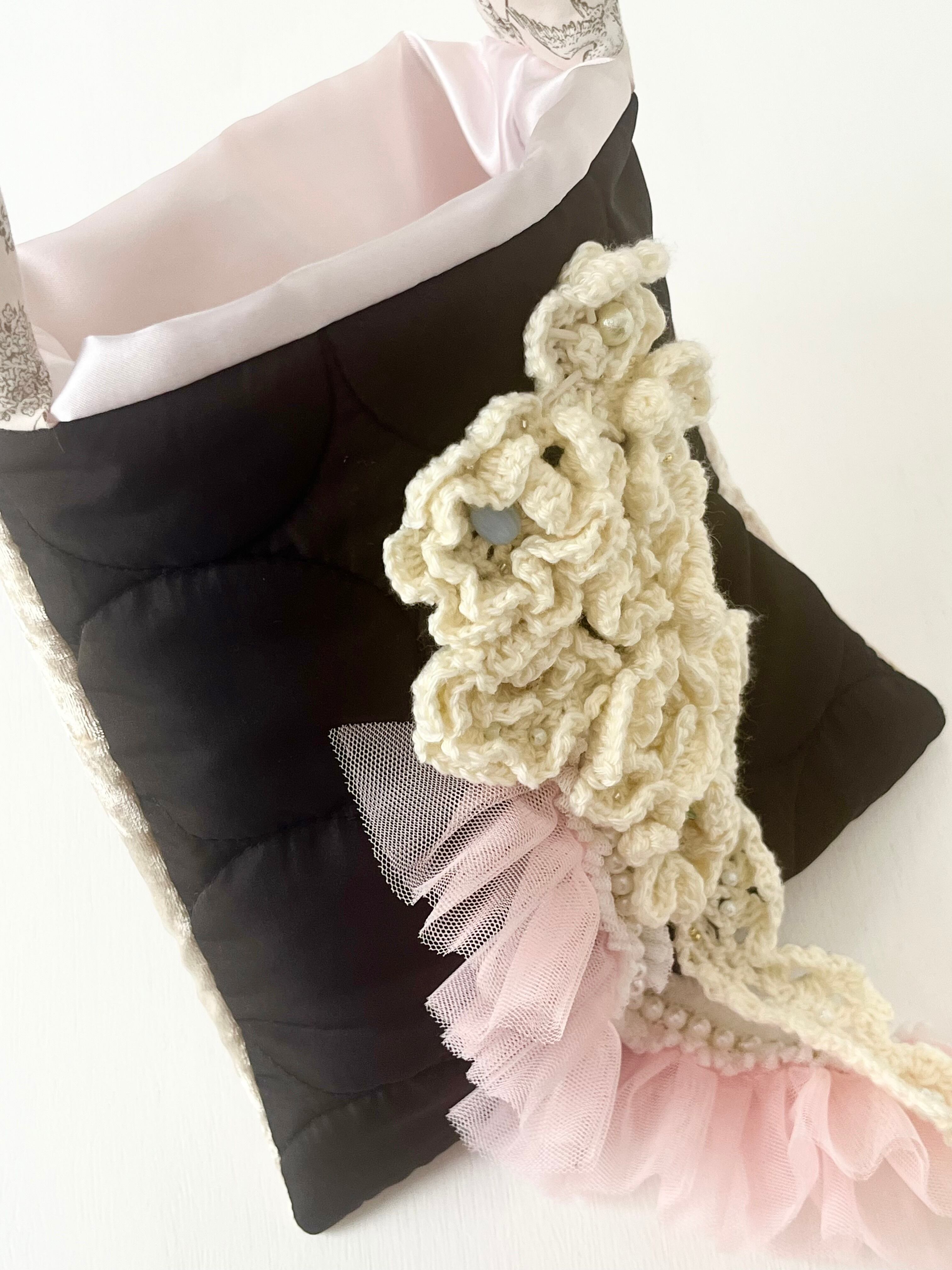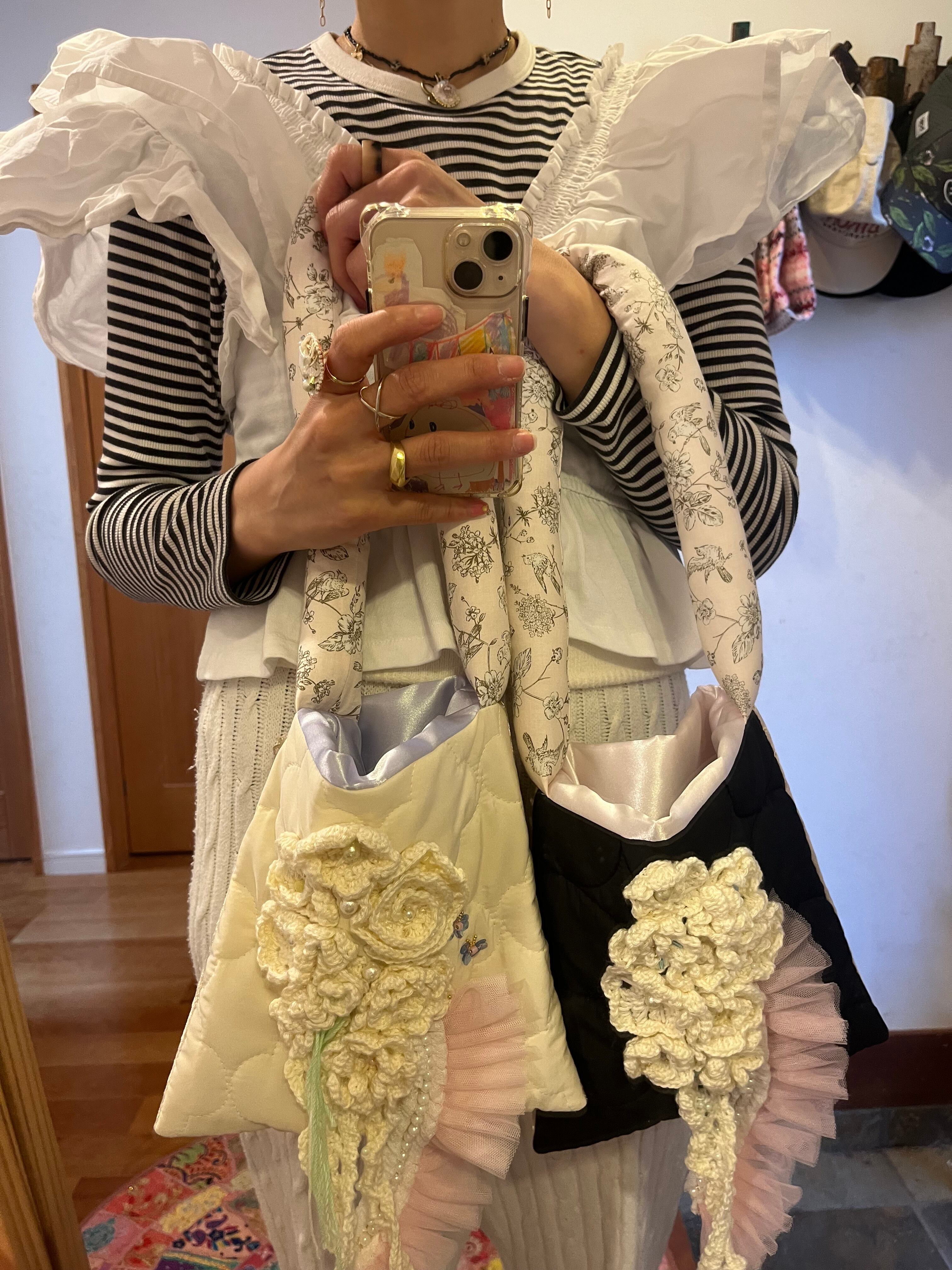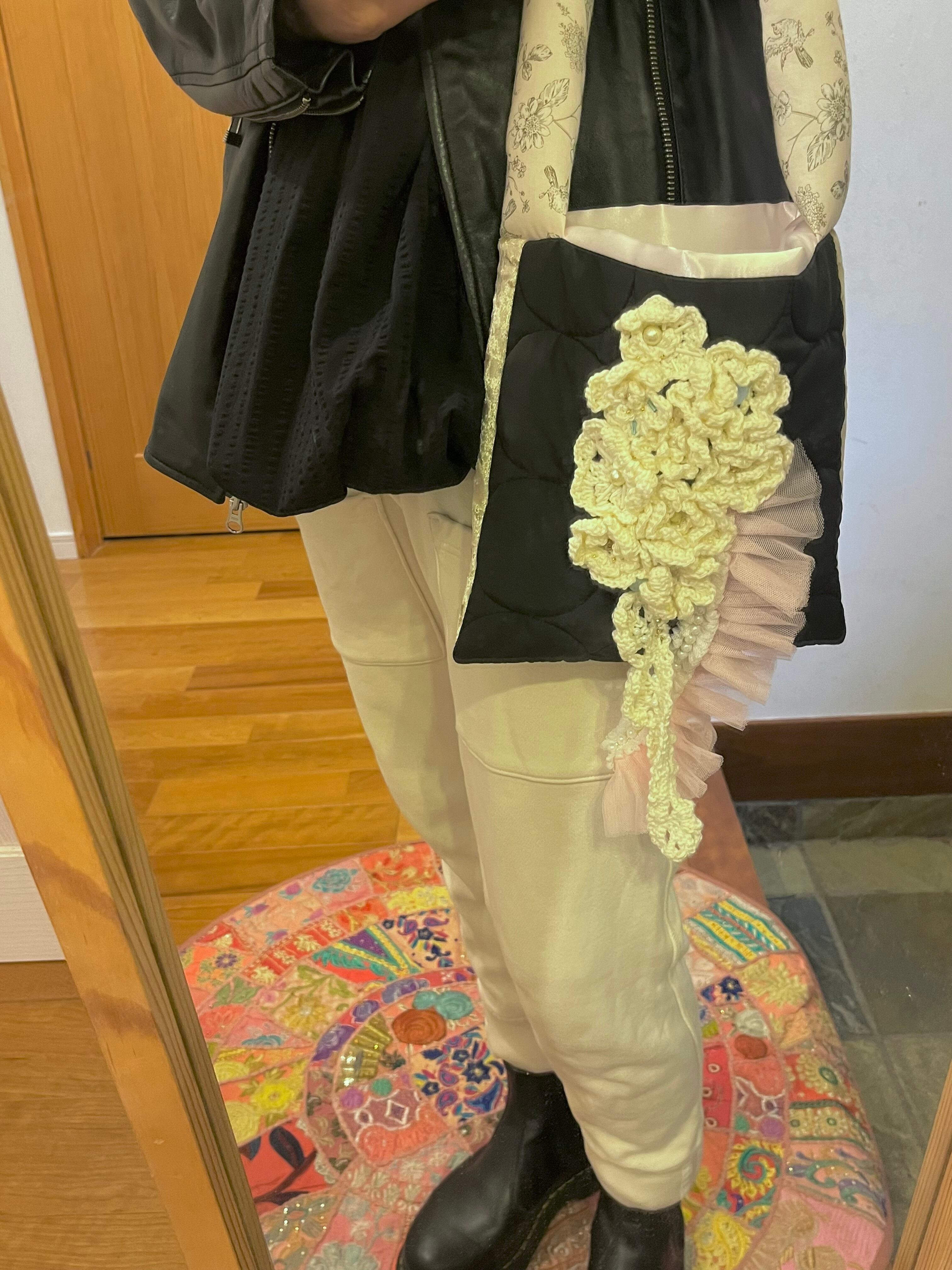 白いお花をたっぷりと編みひとつひとつ丁寧に置いてデザインしたsuumiの小さなおめかしばっぐ