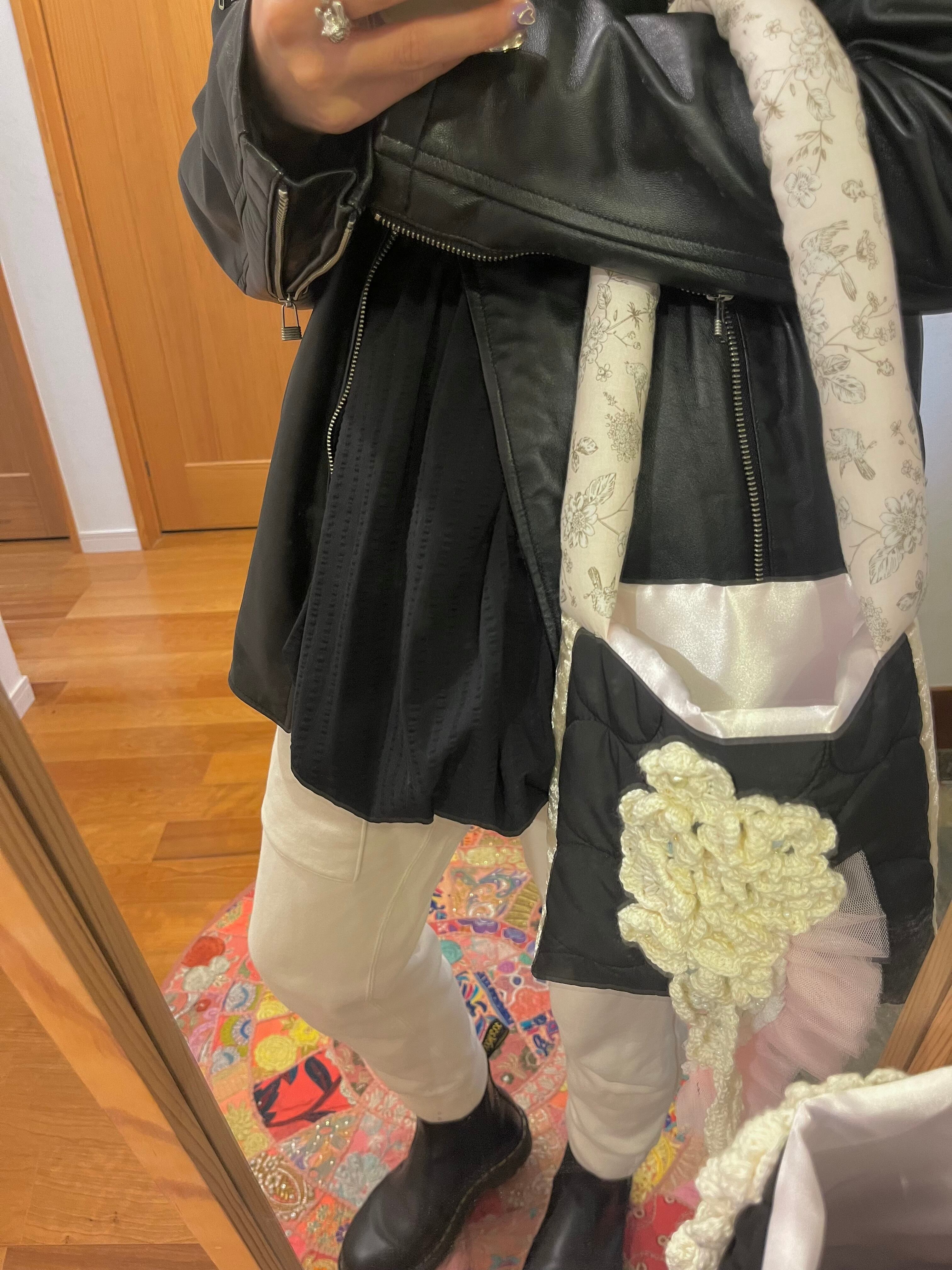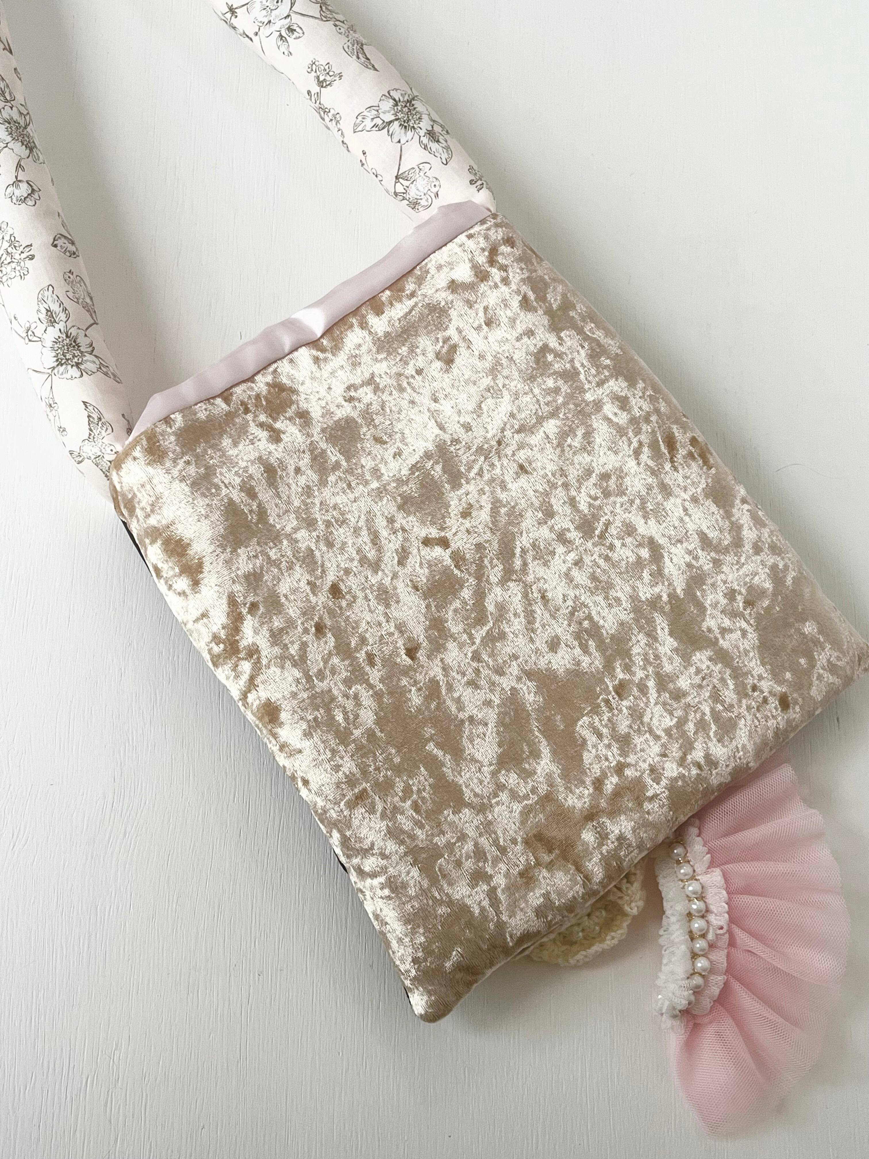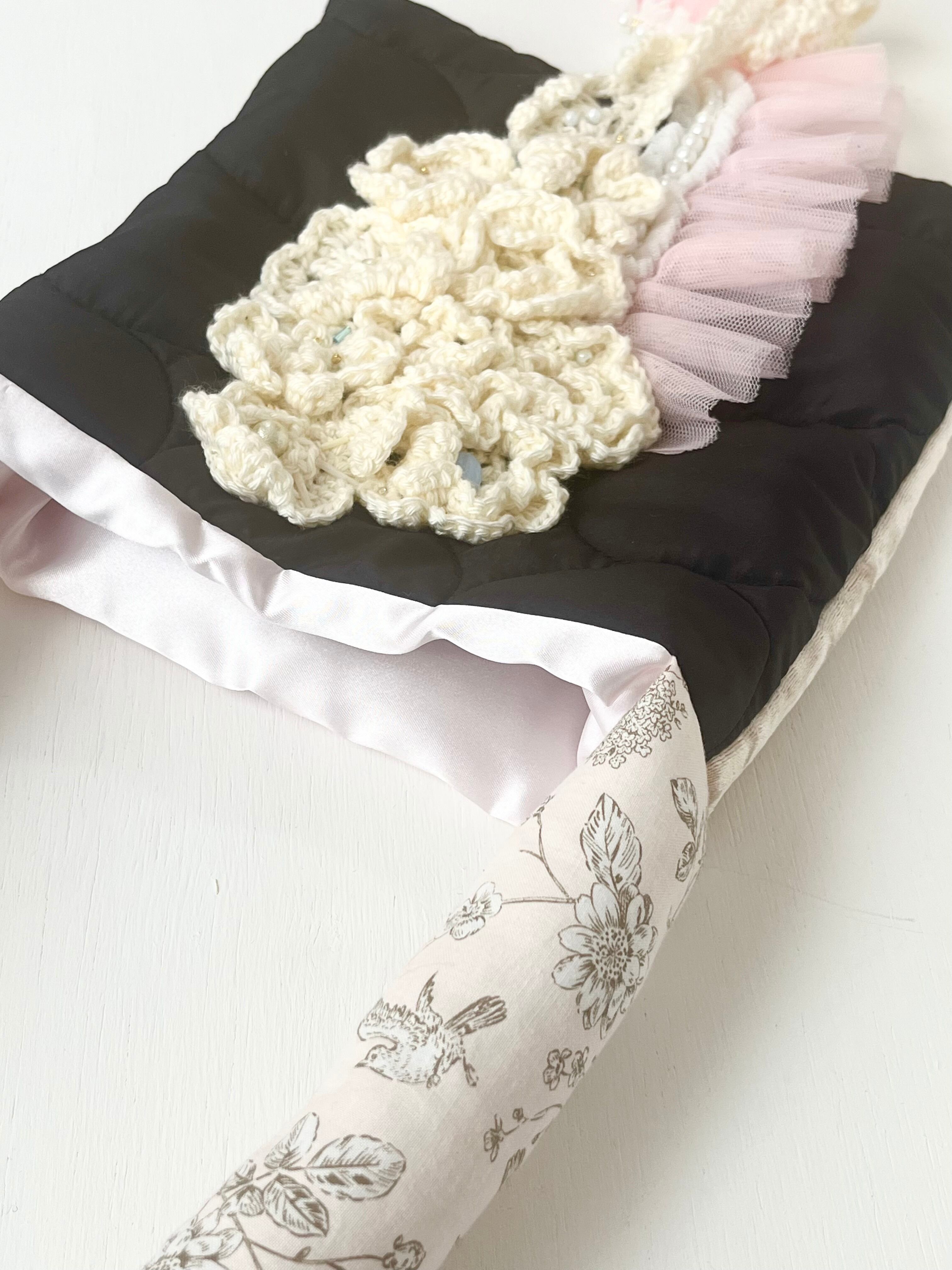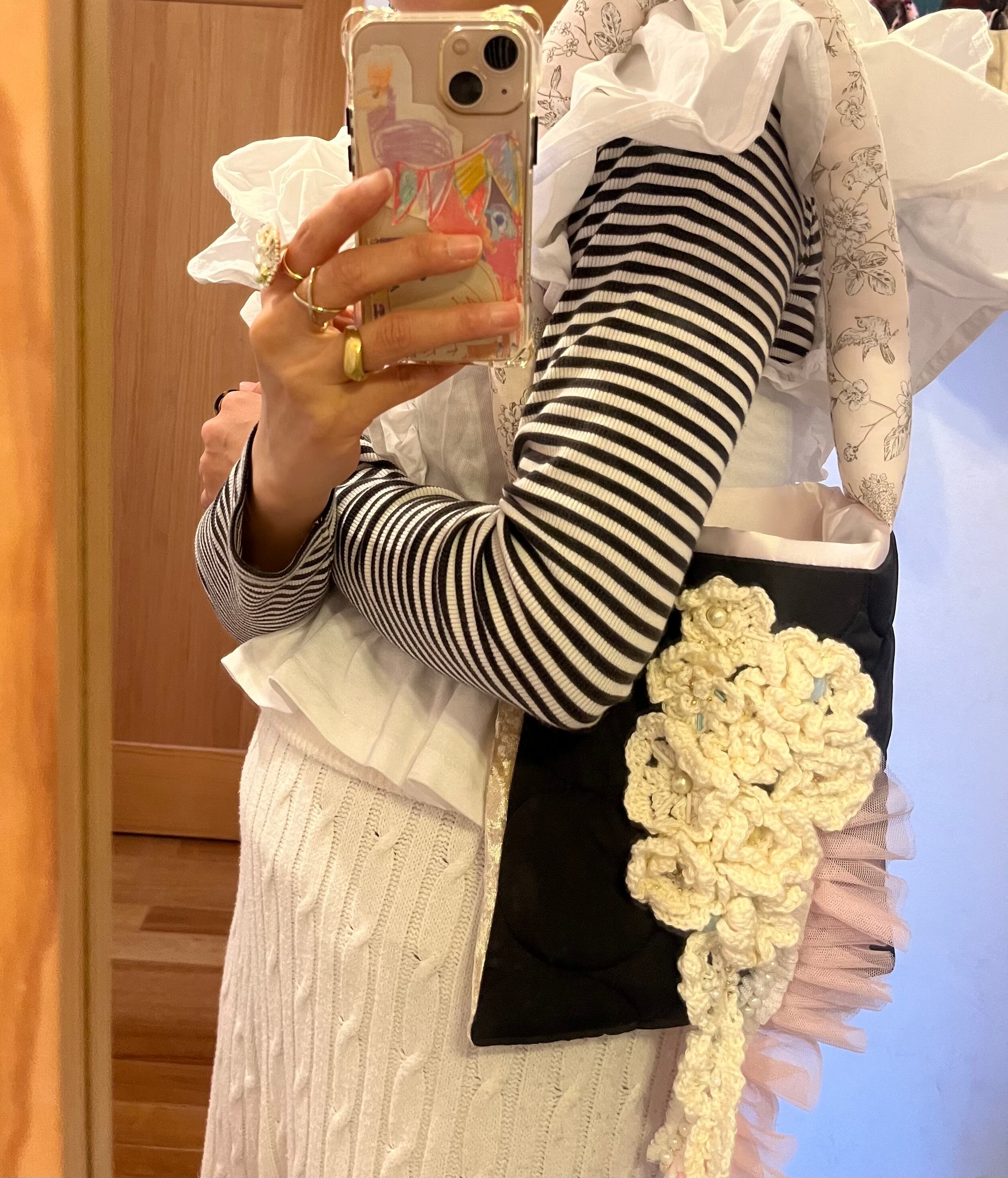 白いお花をたっぷりと編みひとつひとつ丁寧に置いてデザインしたsuumiの小さなおめかしばっぐ