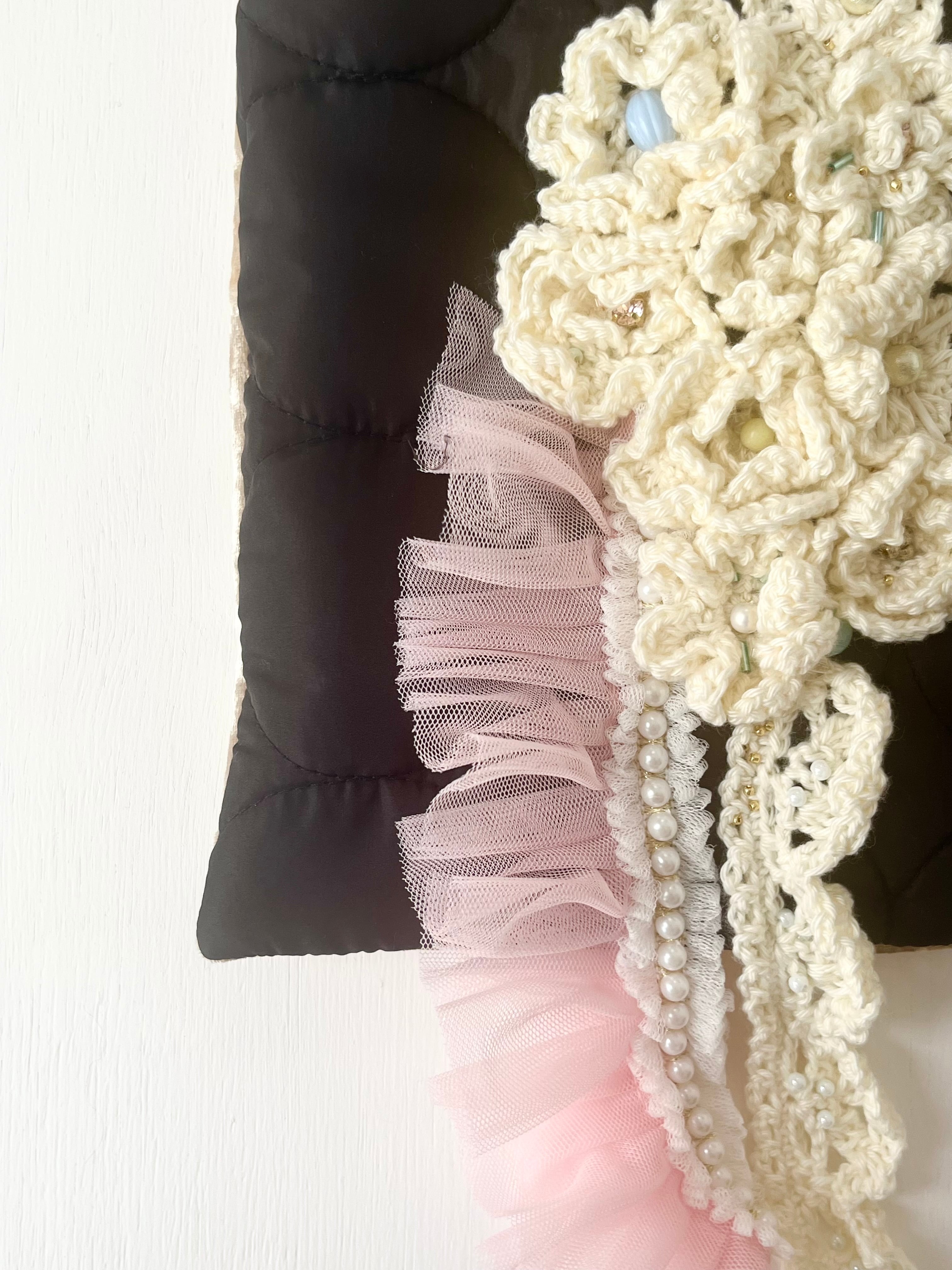 チュールレース、天然石やささやかな刺繍を飾ったひとつひとつ違うお作りでショートケーキのように甘く仕上げました