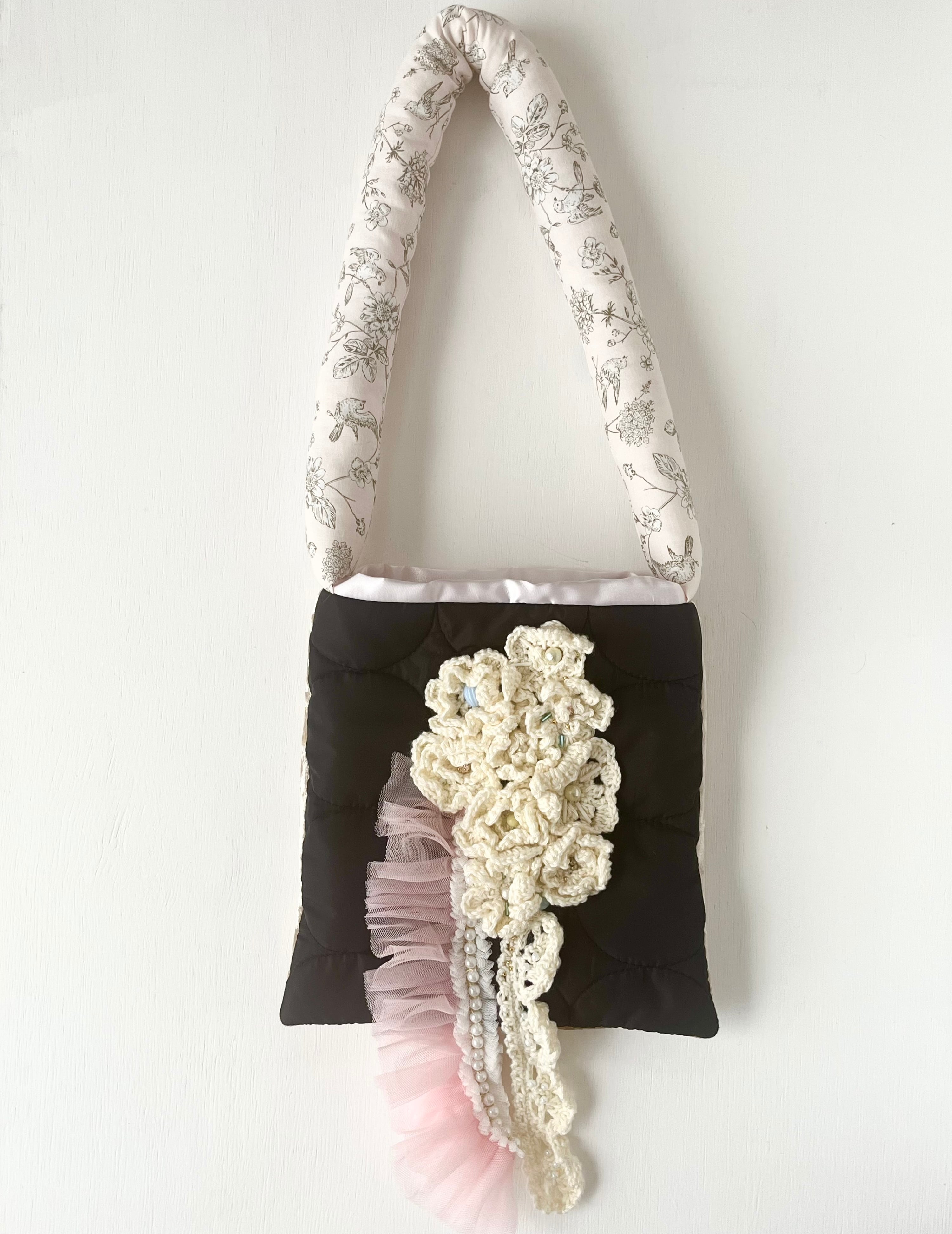植物と鳥が描かれた美しい生地を採用したハンドルは、コットンで中綿を入れており心地よい使い心地です