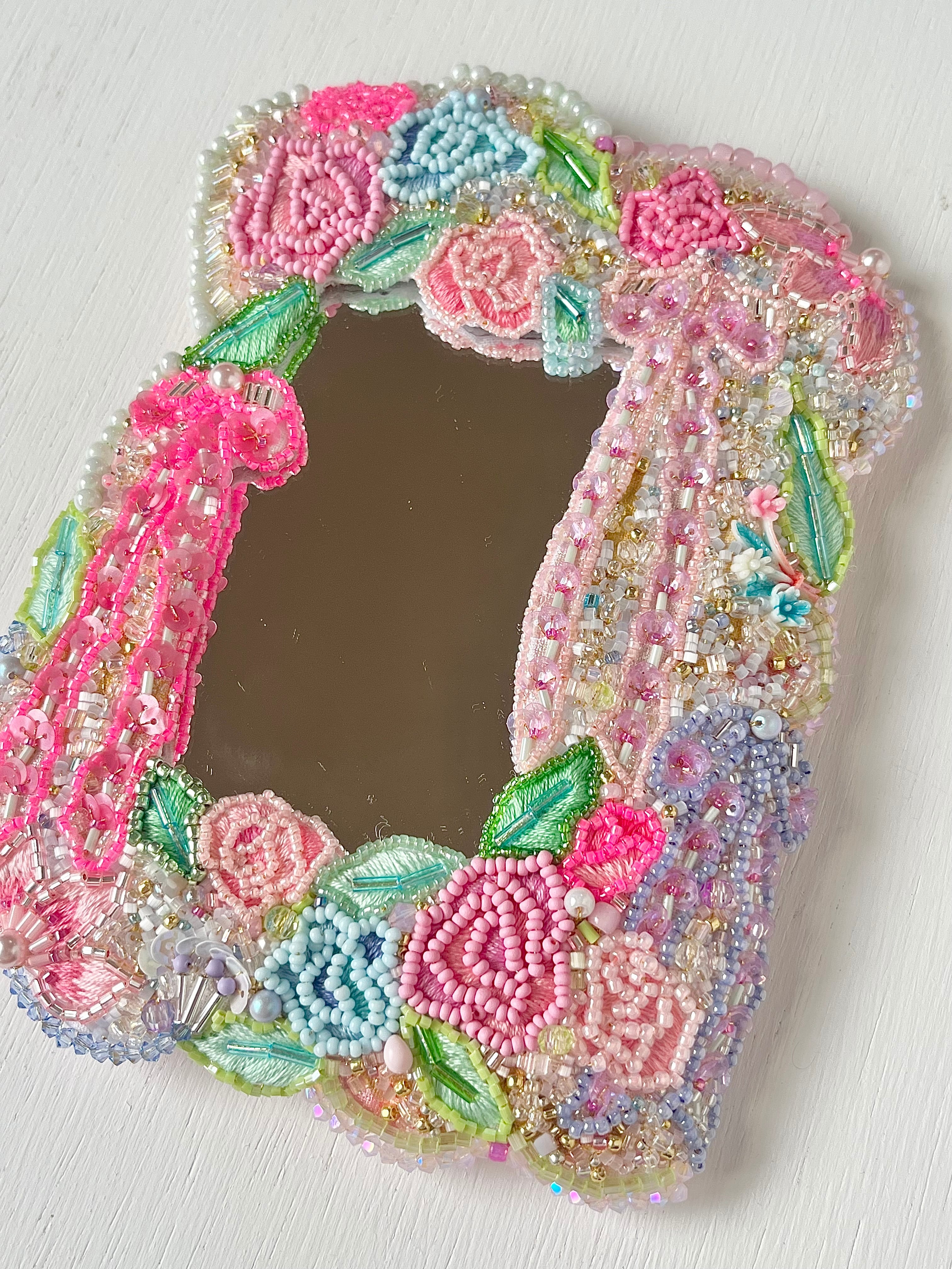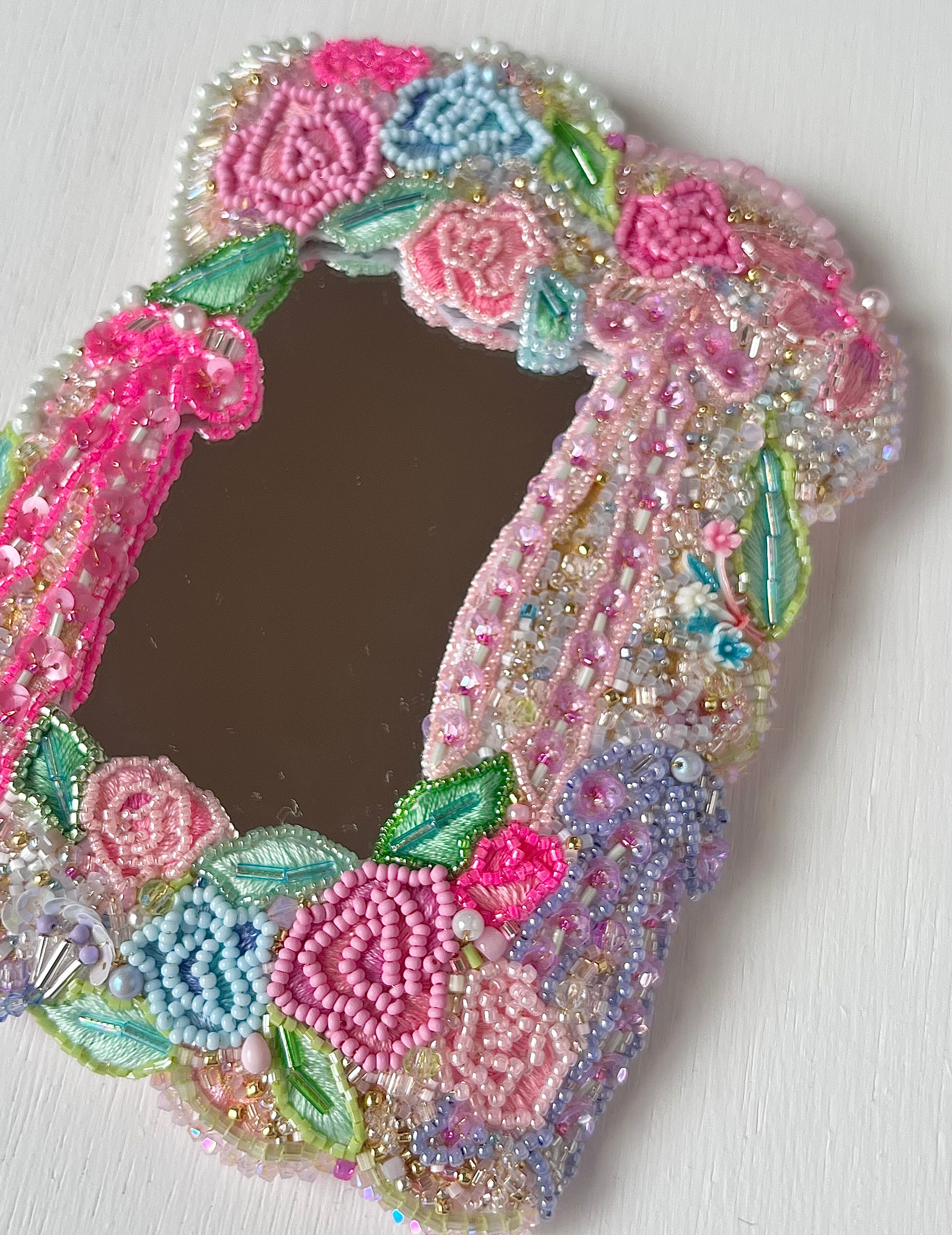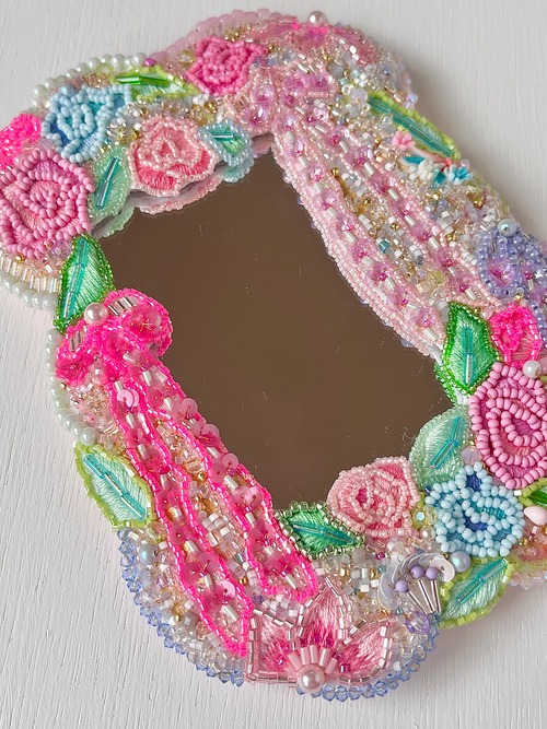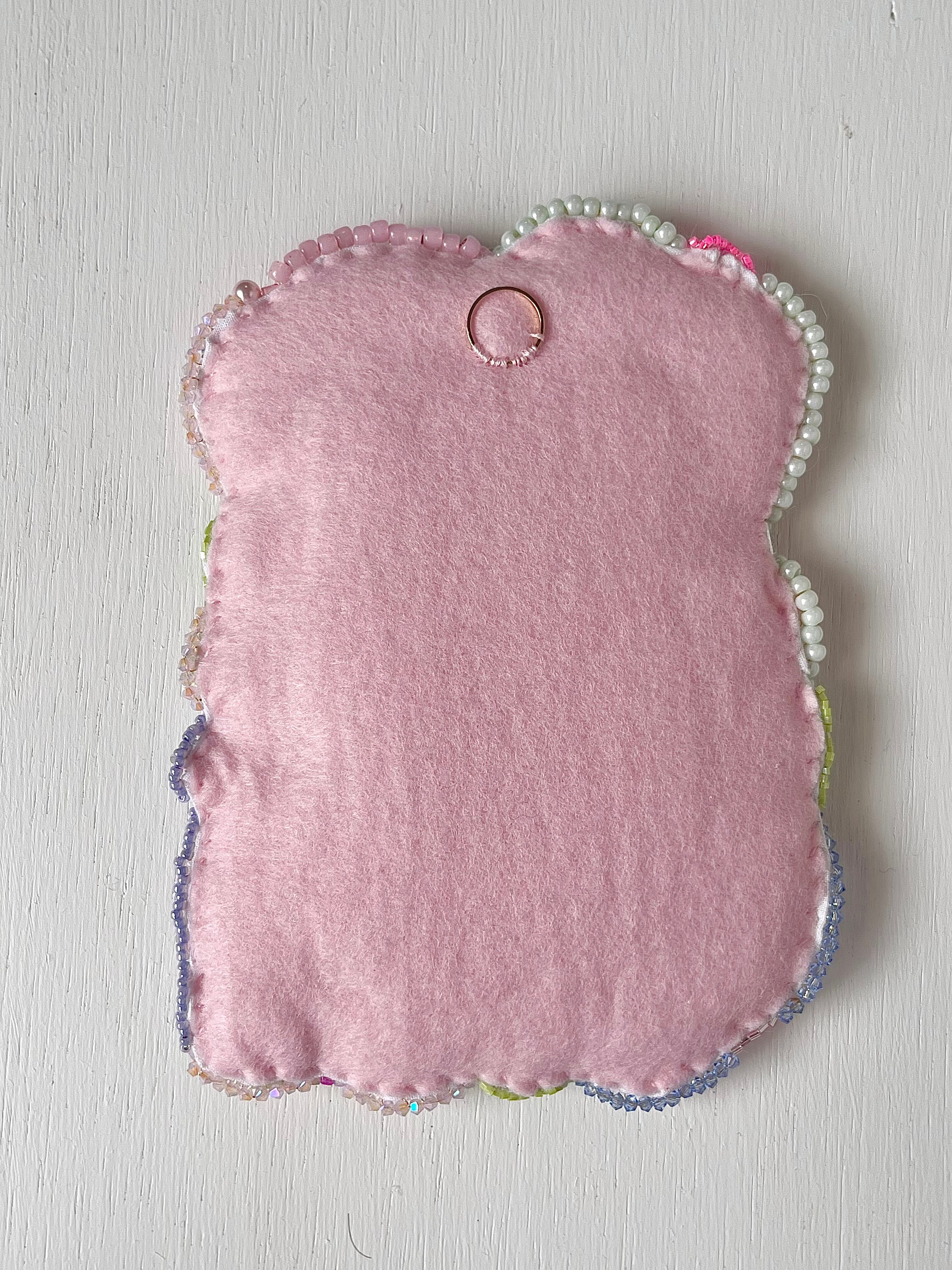 コットン生地、金糸、フランス産スパンコール、アクリル絵の具、天然石、ガラスビーズ、裏布にフェルト