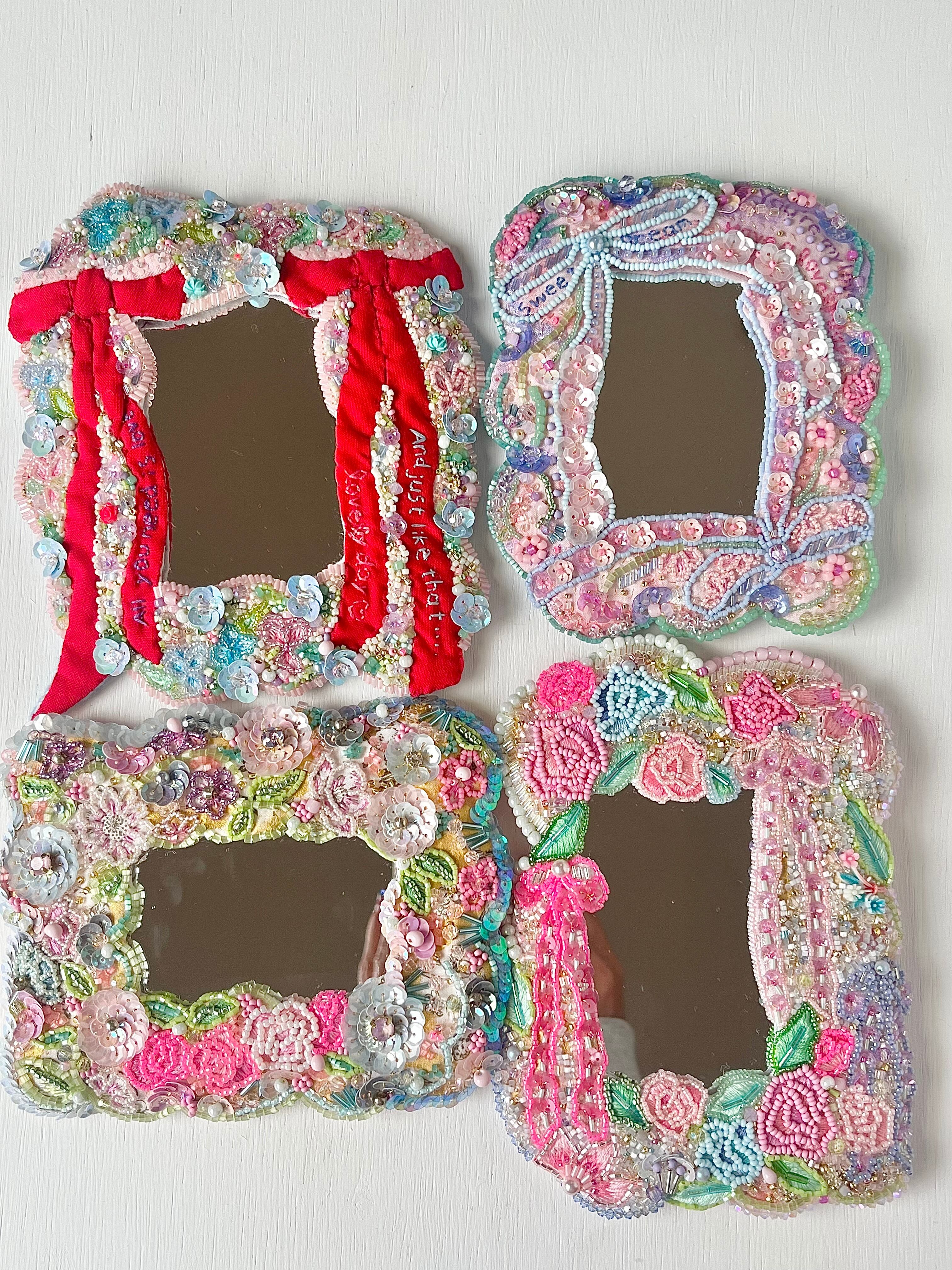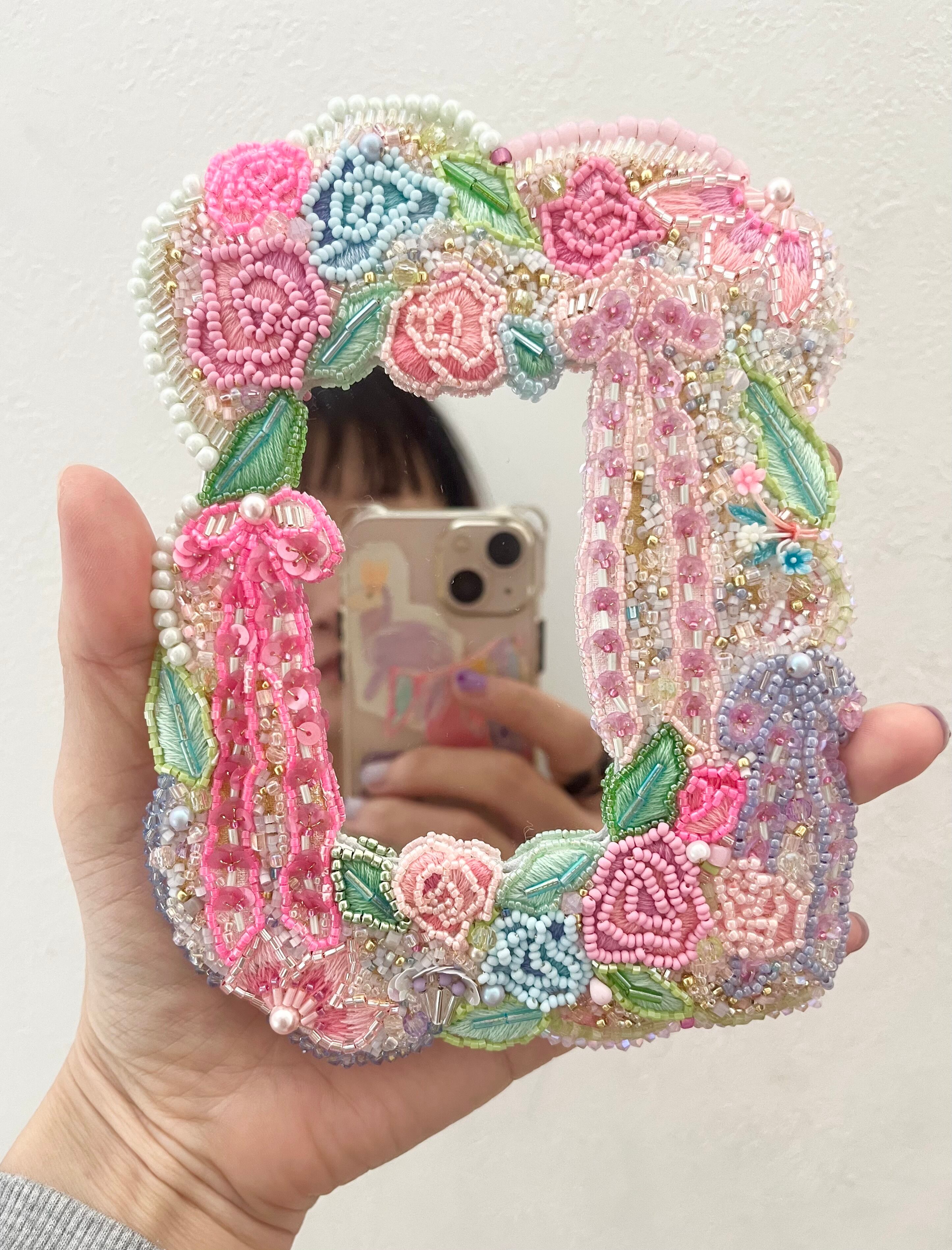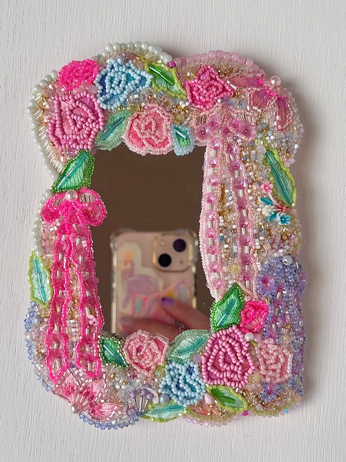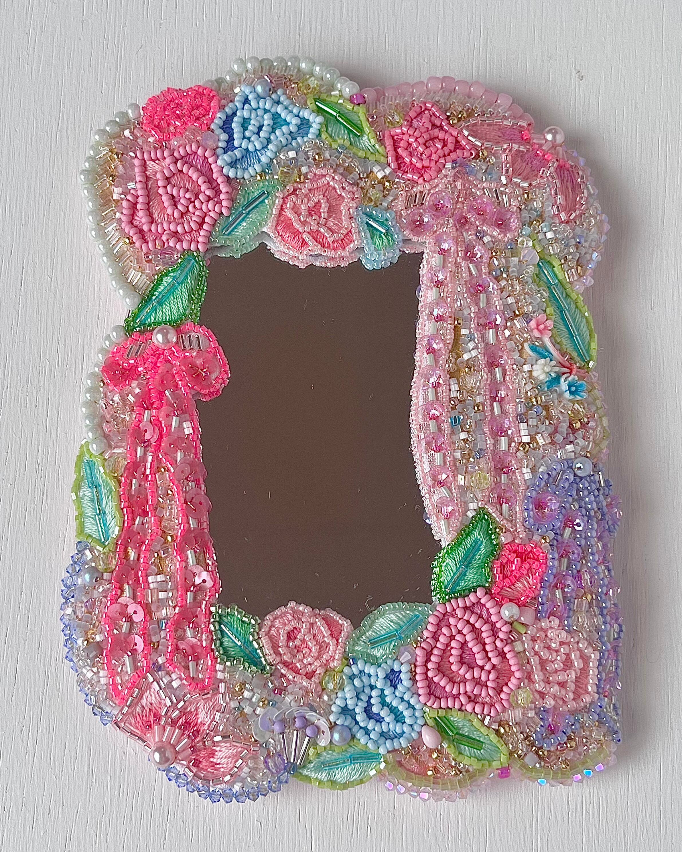 コットン生地、金糸、フランス産スパンコール、アクリル絵の具、天然石、ガラスビーズ、裏布にフェルト
