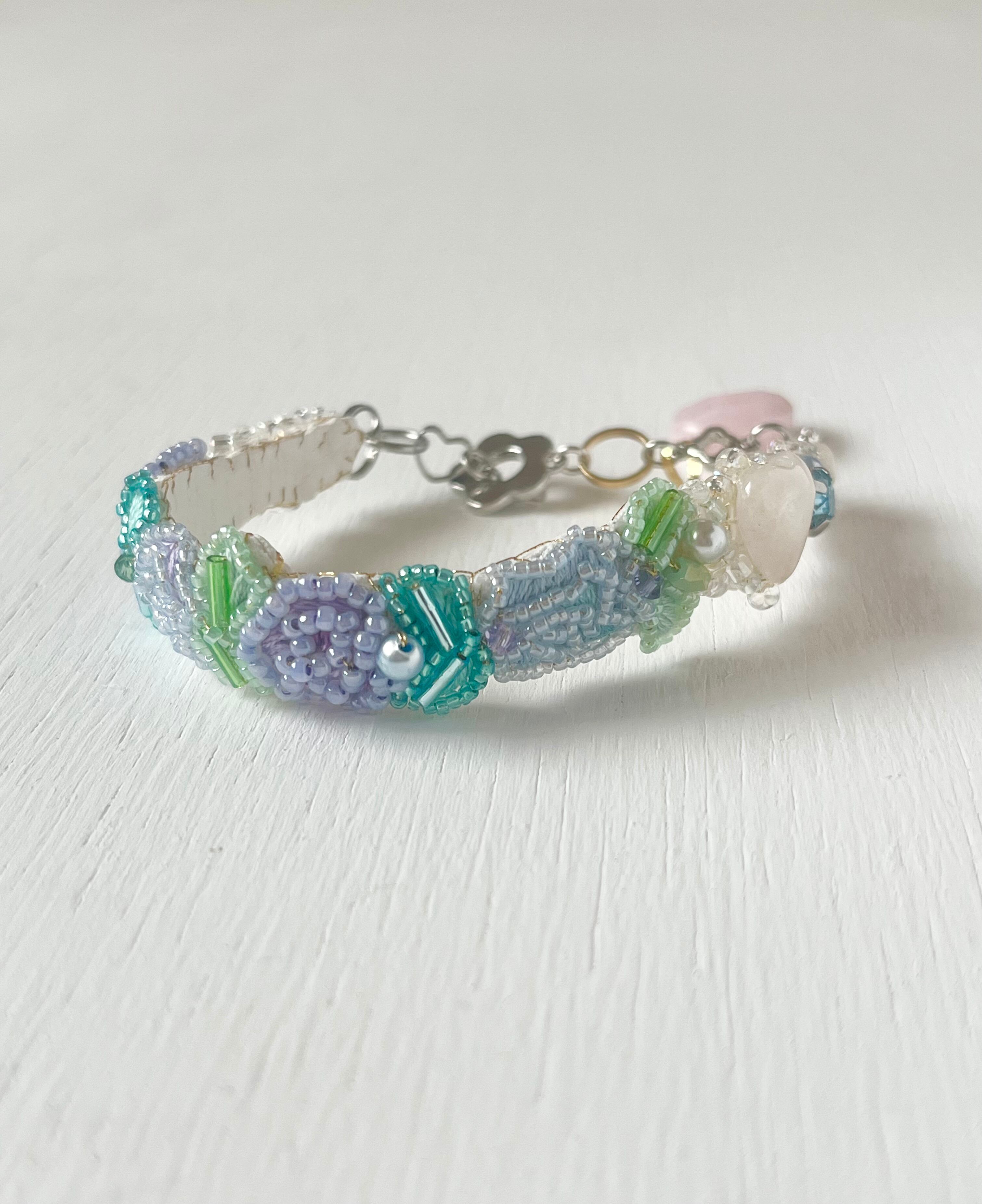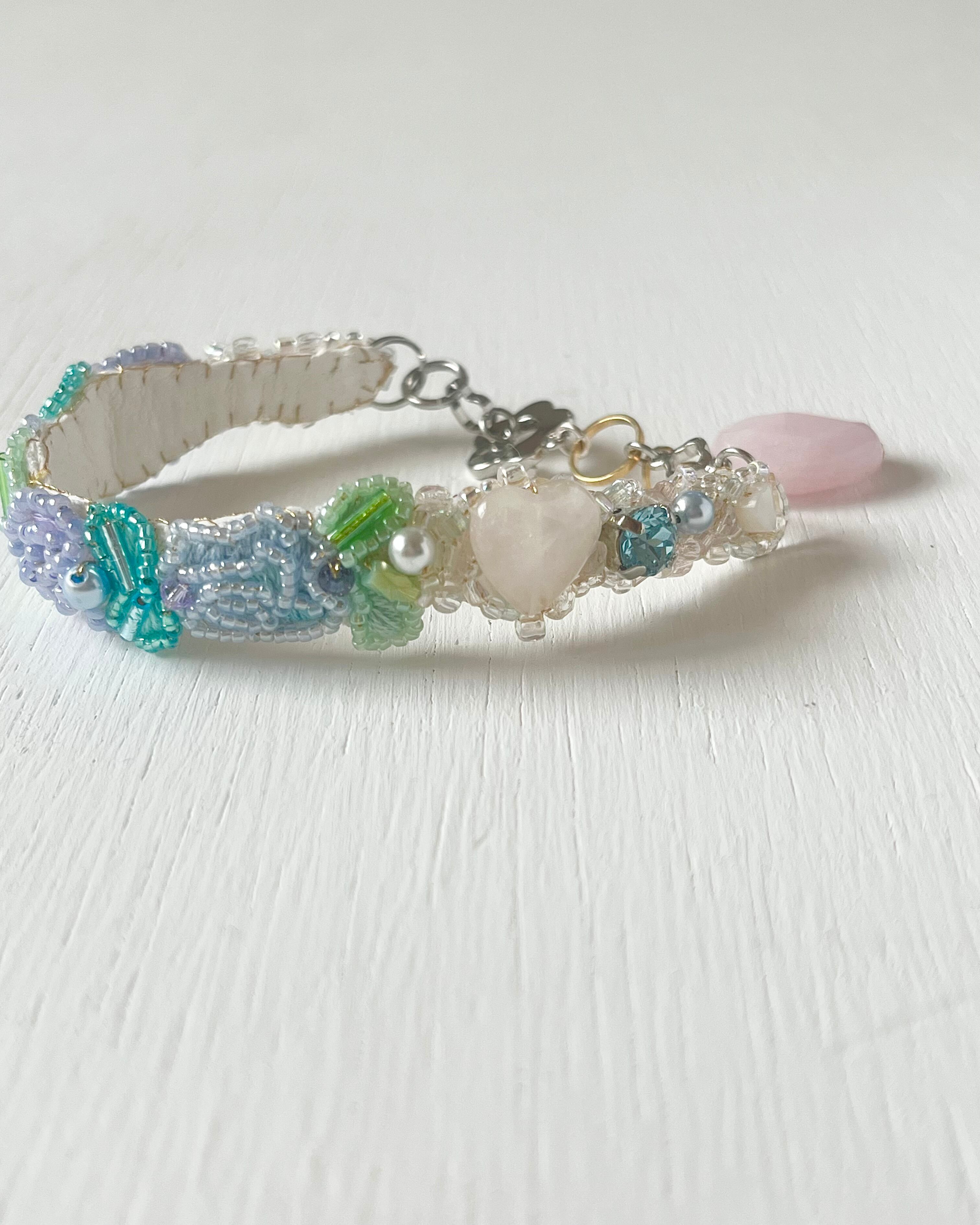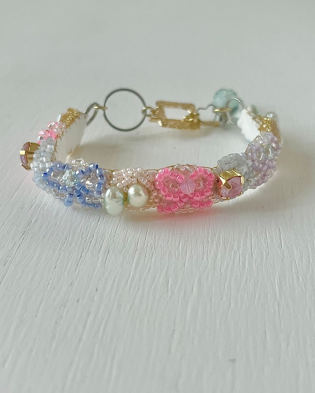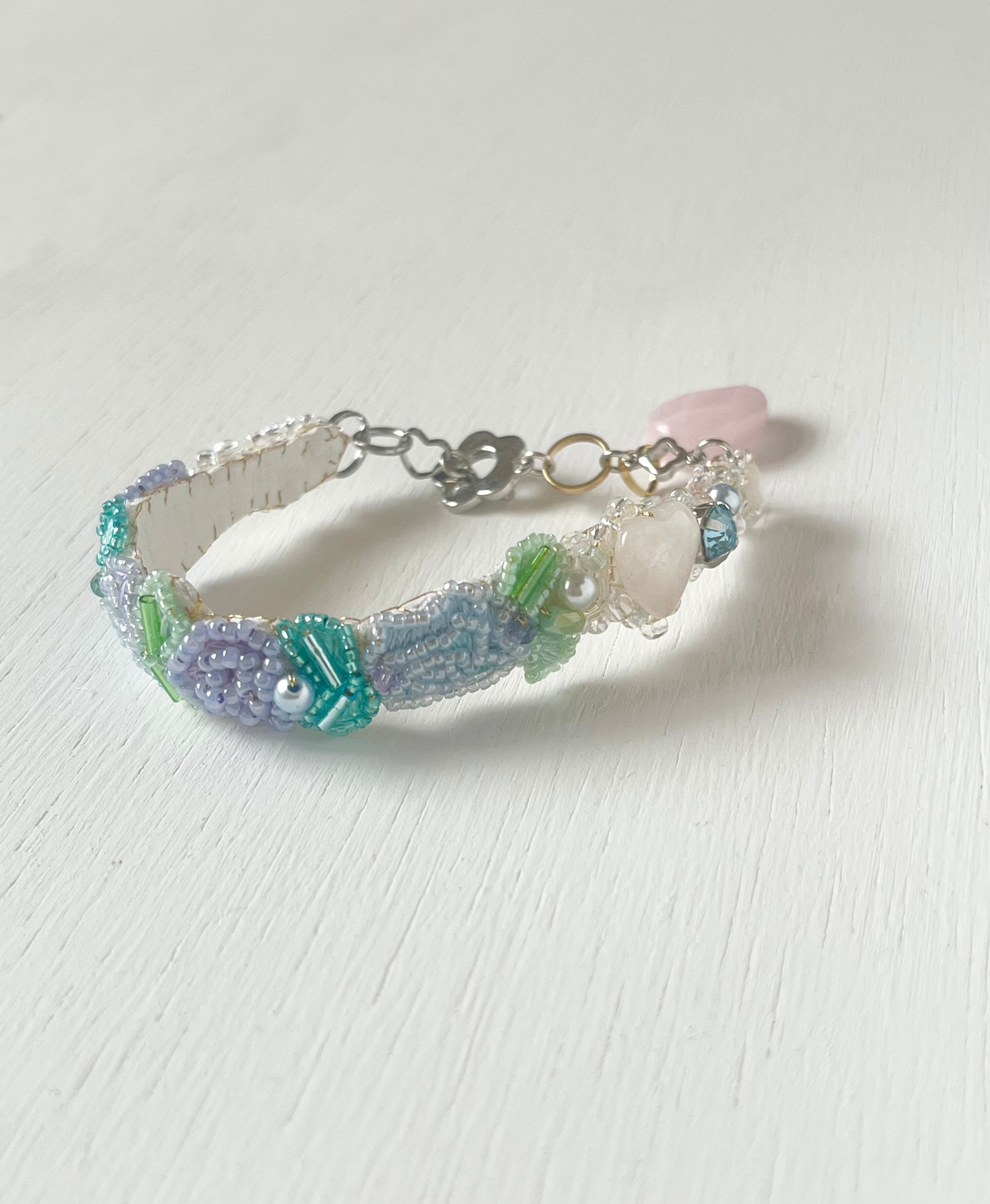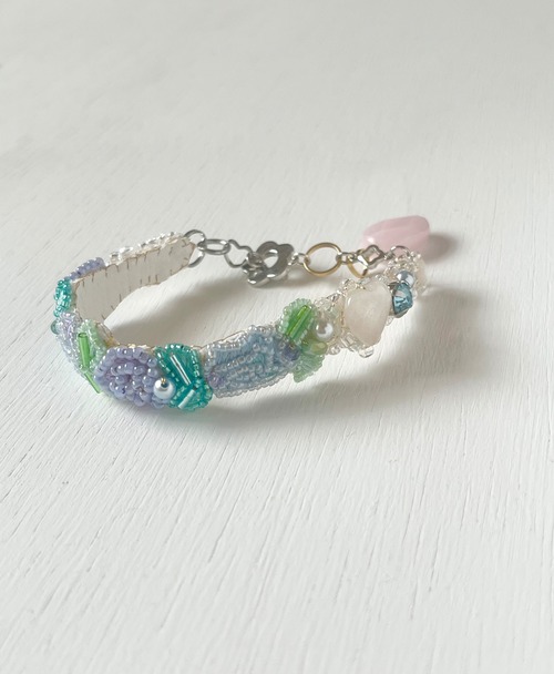 シロツメクサをつなげて花輪にしていくようにひとつひとつ丁寧にすすめているブレスレットのシリーズです
