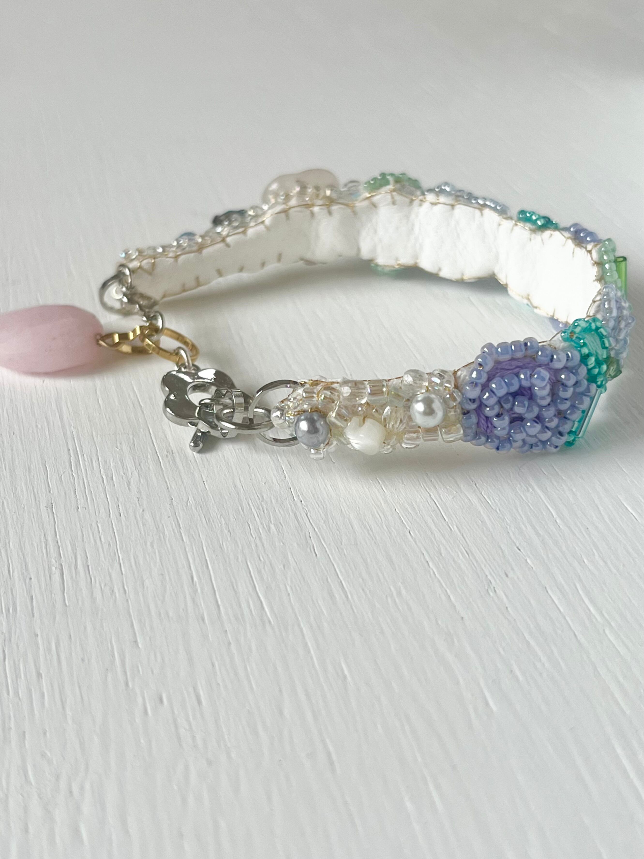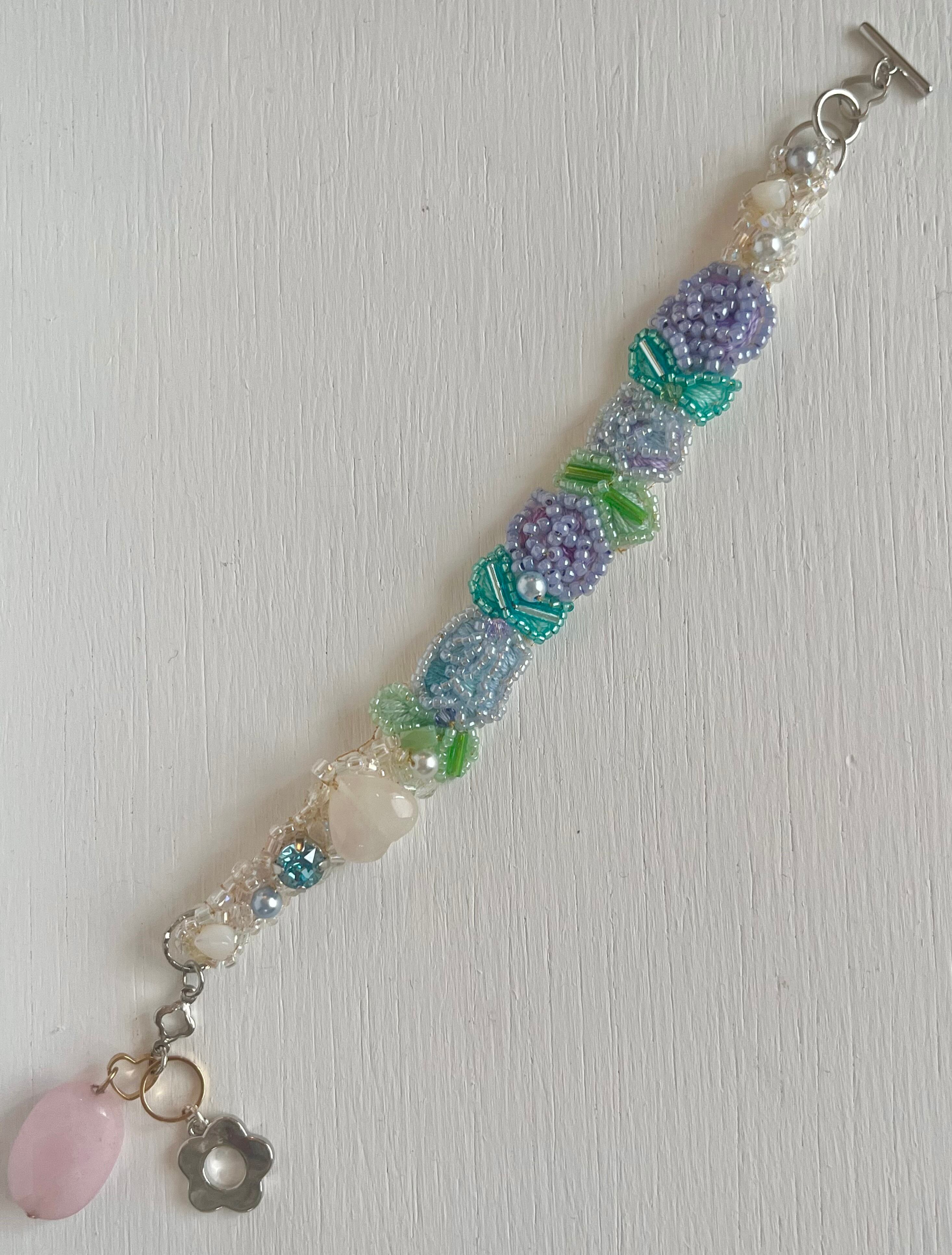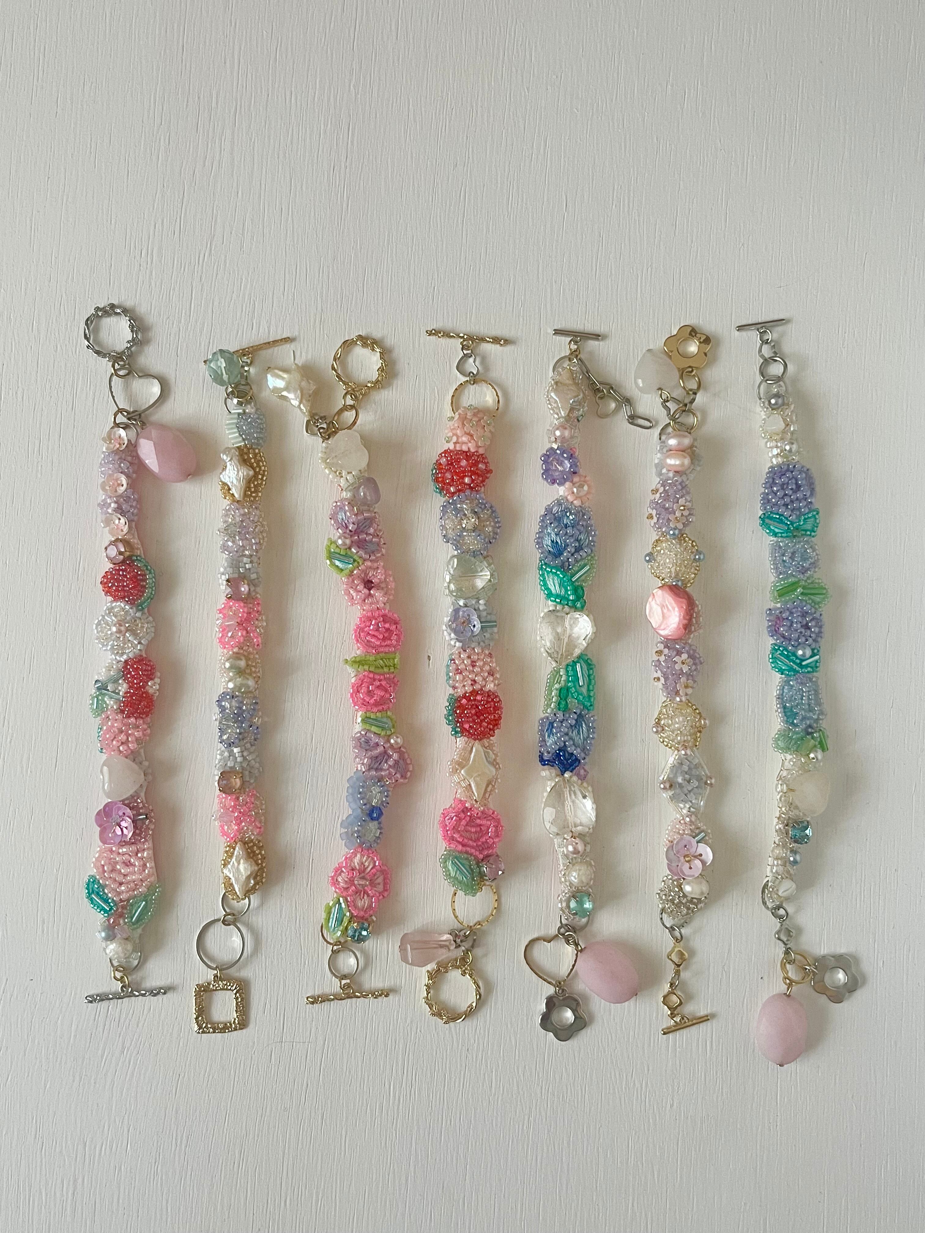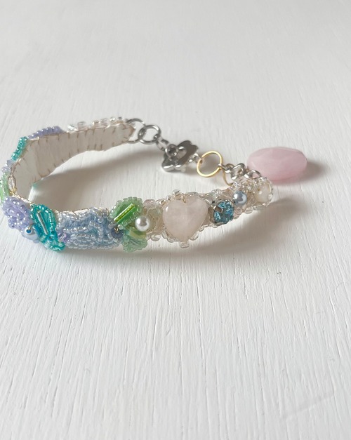 シロツメクサをつなげて花輪にしていくようにひとつひとつ丁寧にすすめているブレスレットのシリーズです