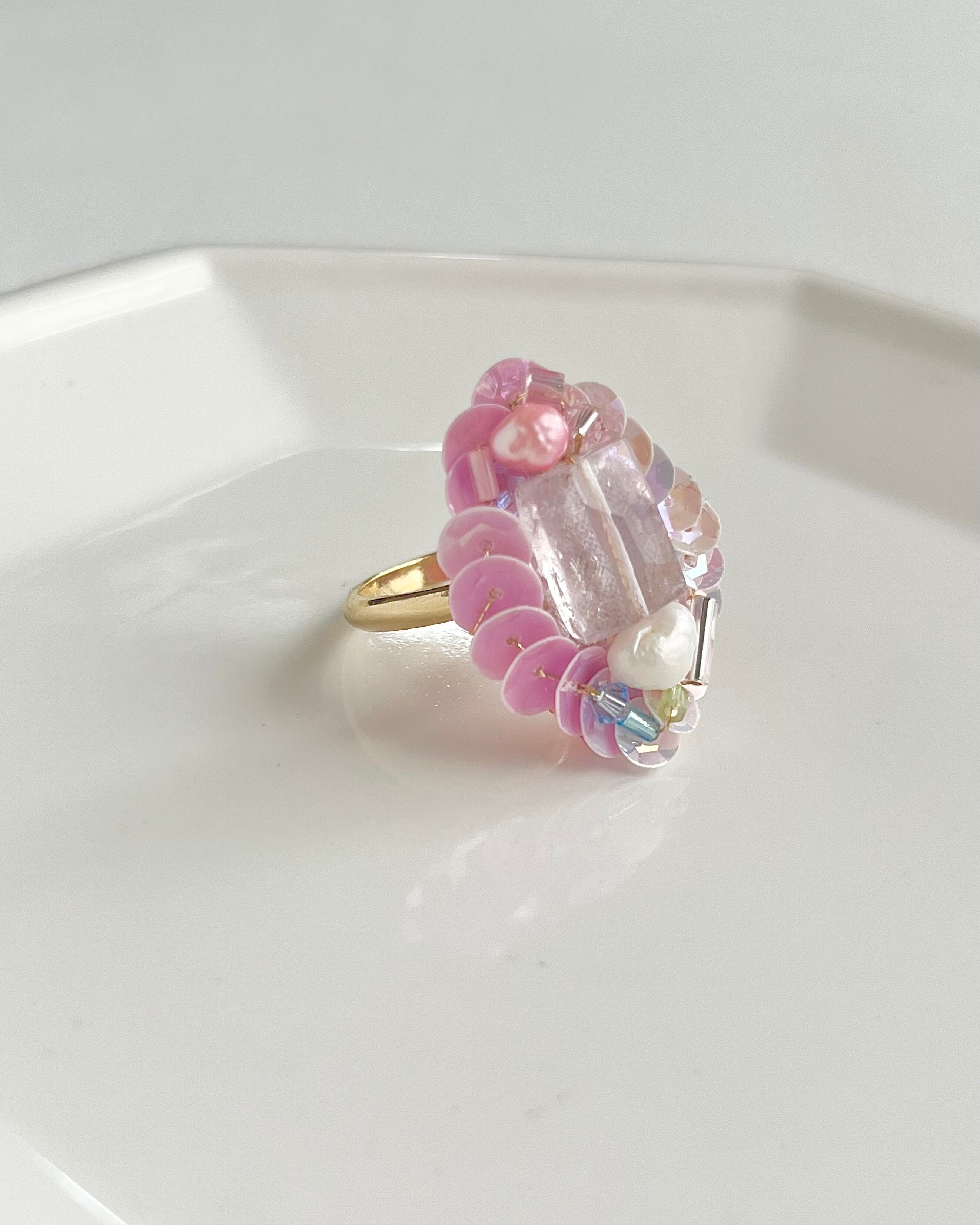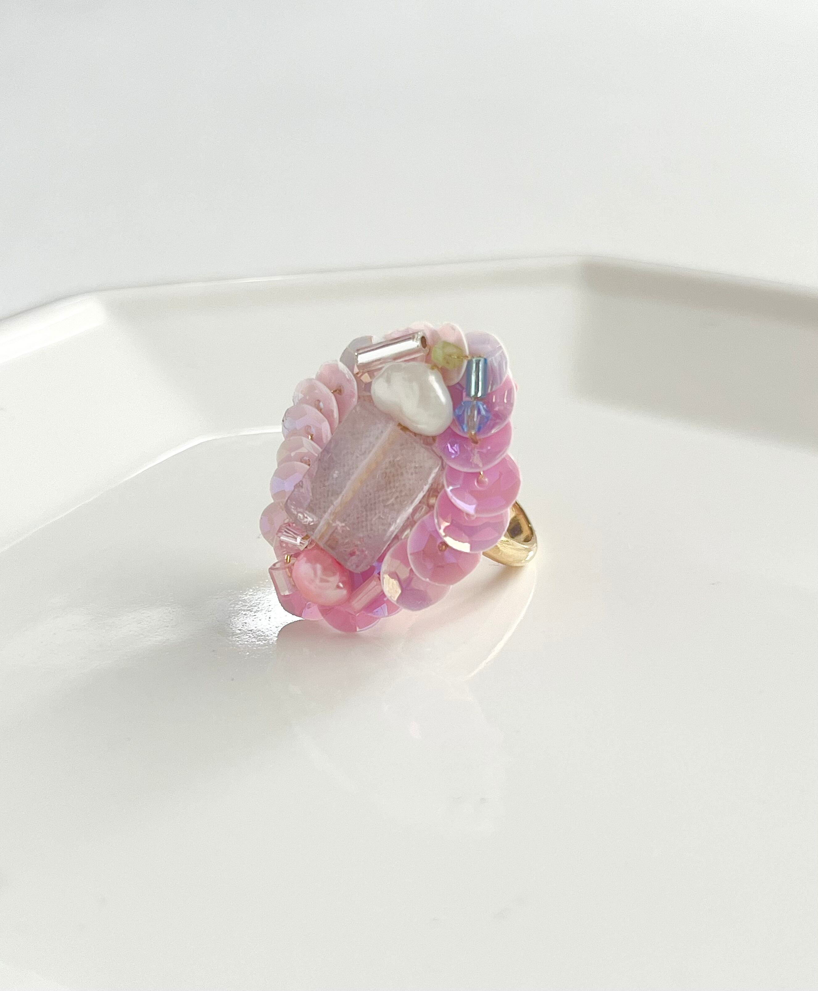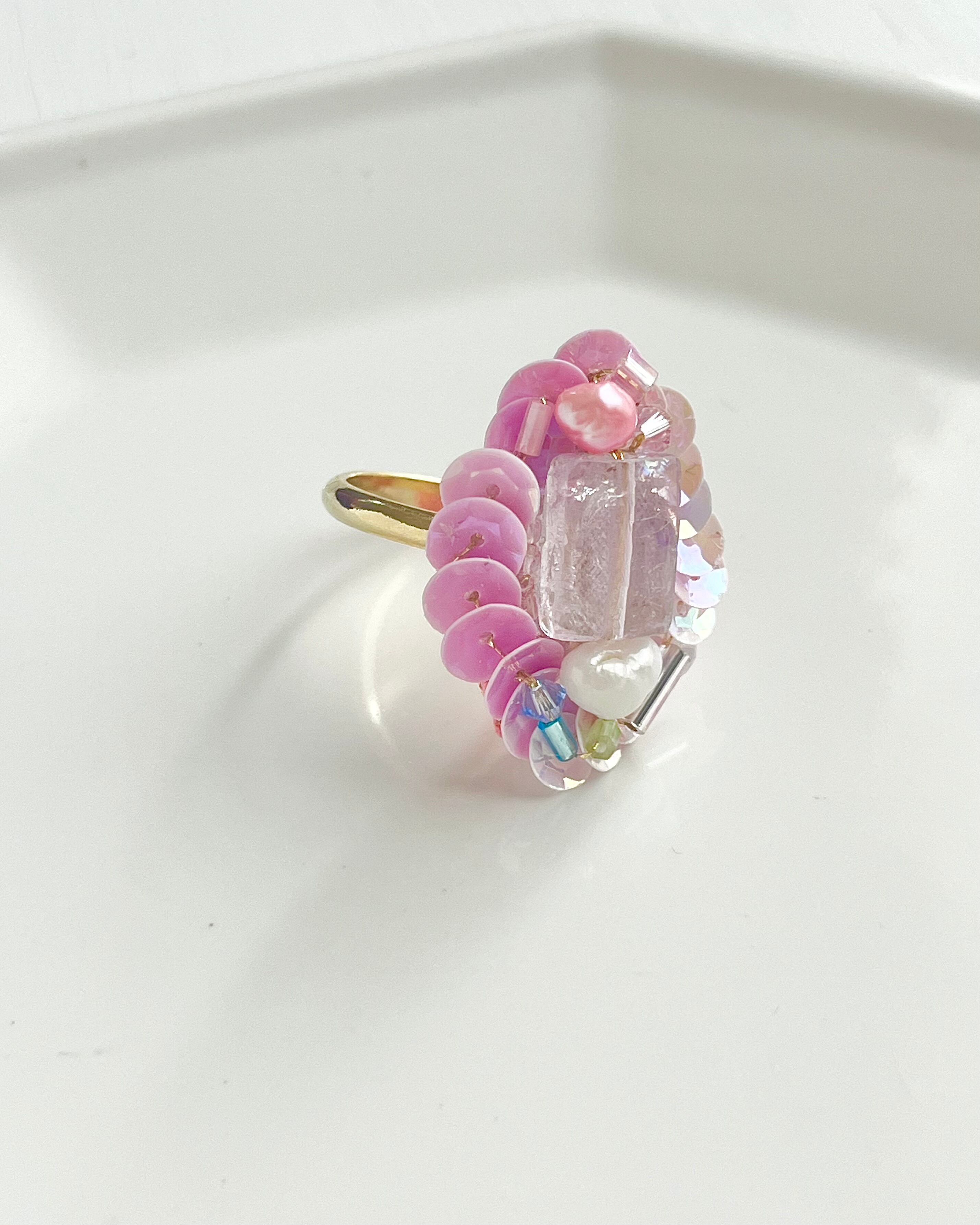 まわりに施したロマンチックなカラーのスパンコールはフランス産のものを使用しています