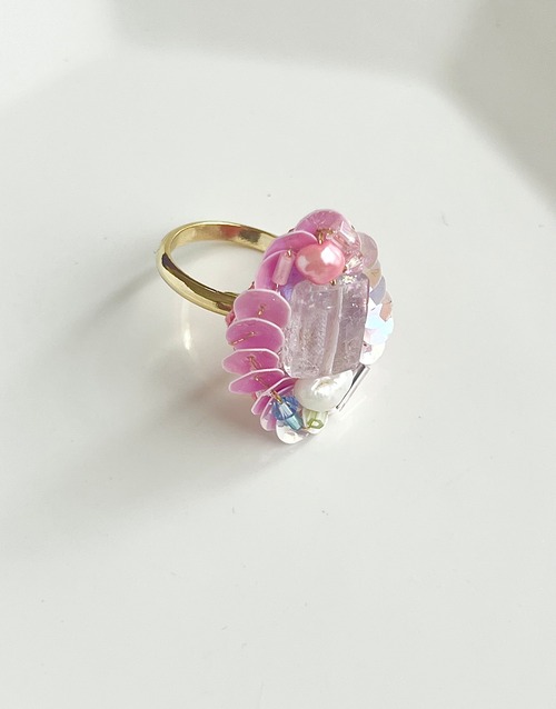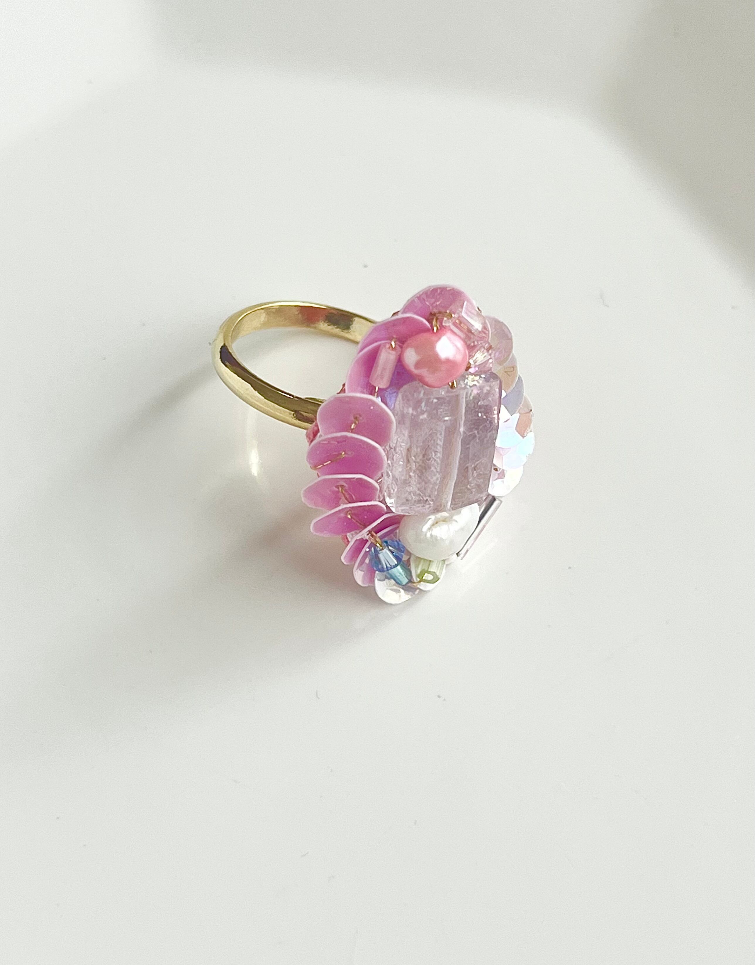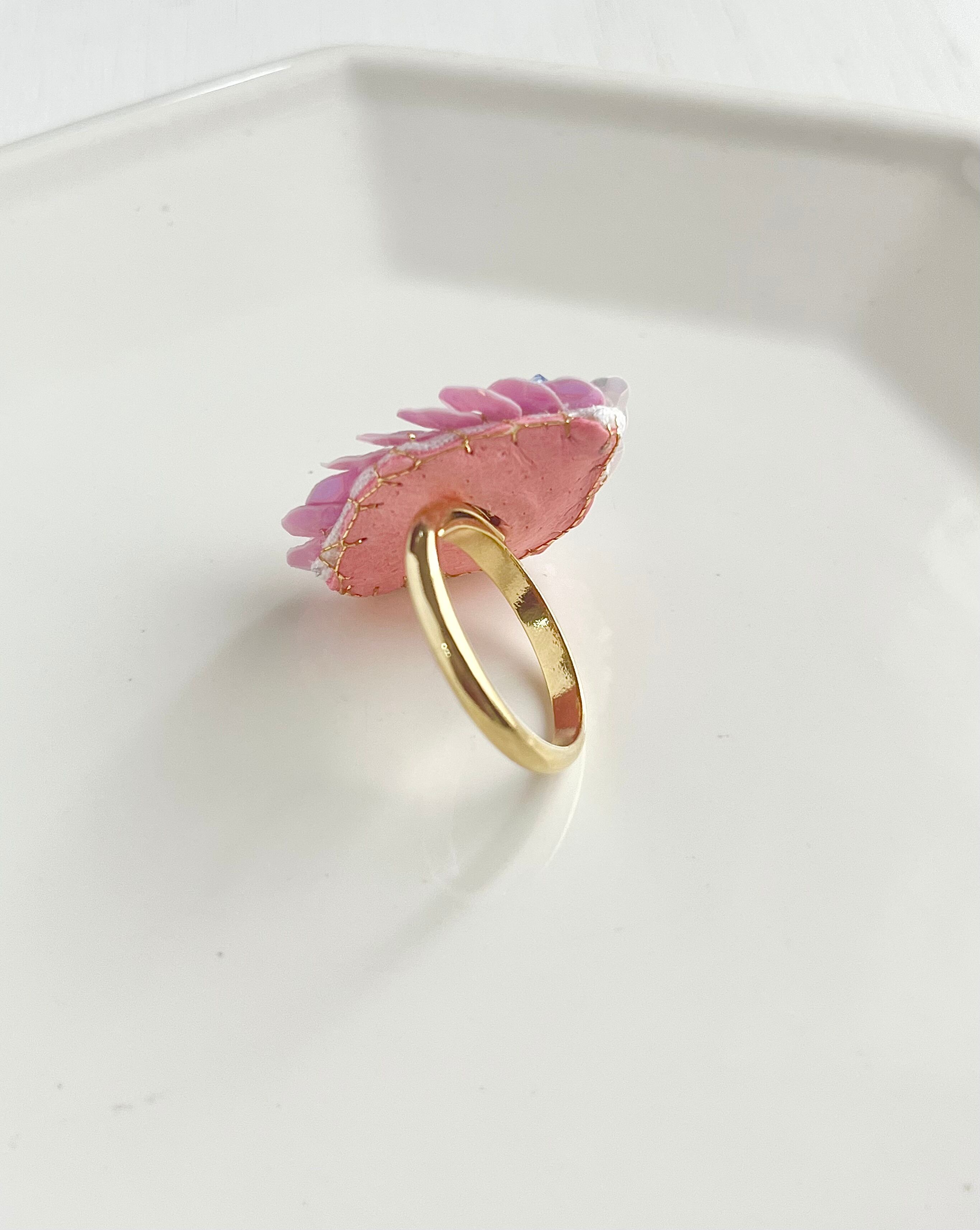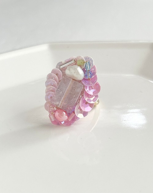 まわりに施したロマンチックなカラーのスパンコールはフランス産のものを使用しています