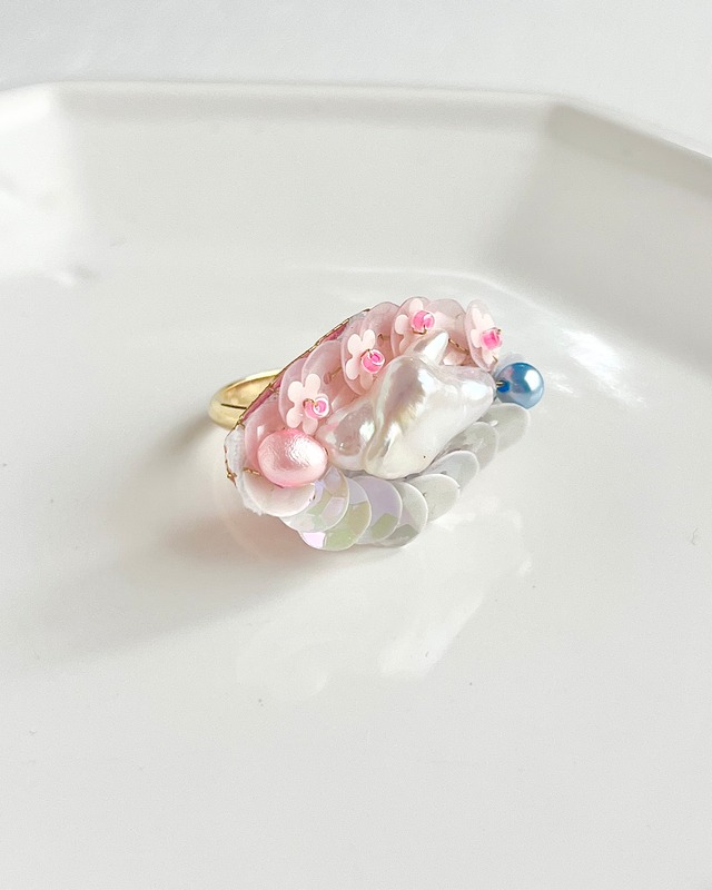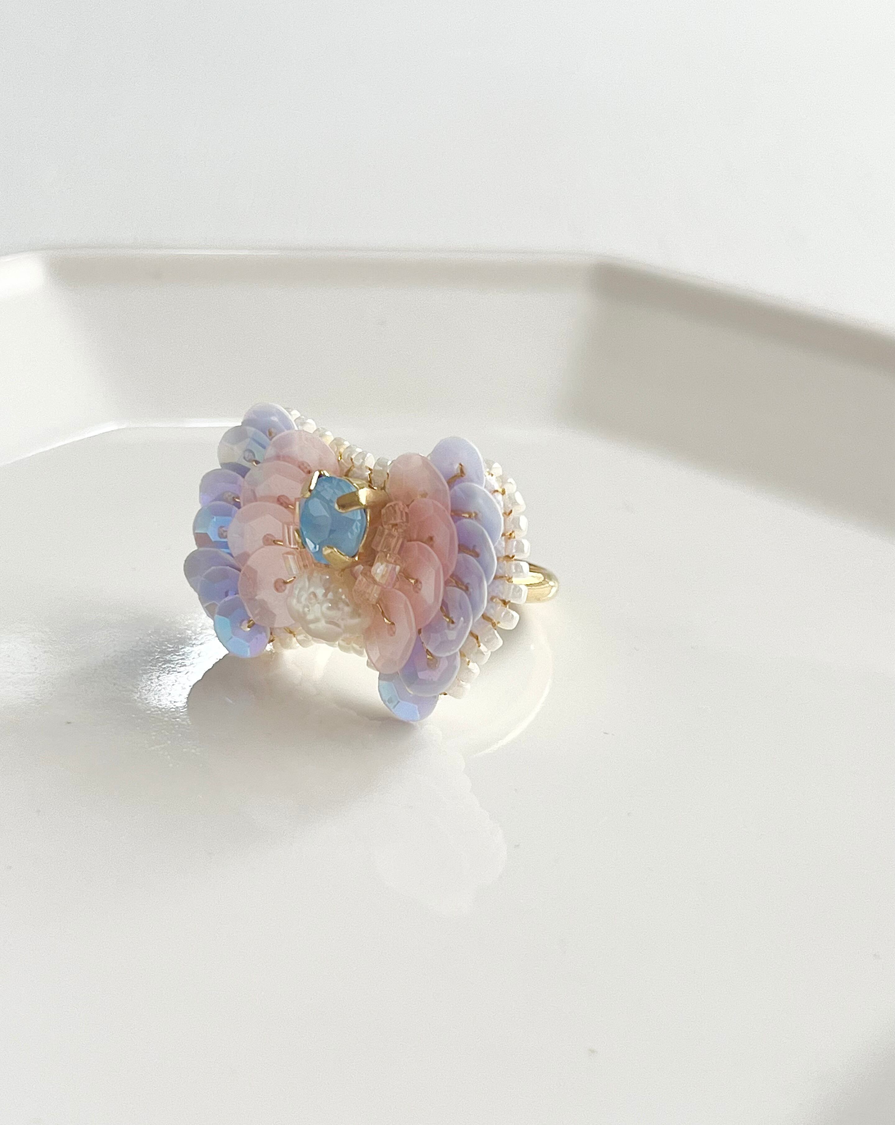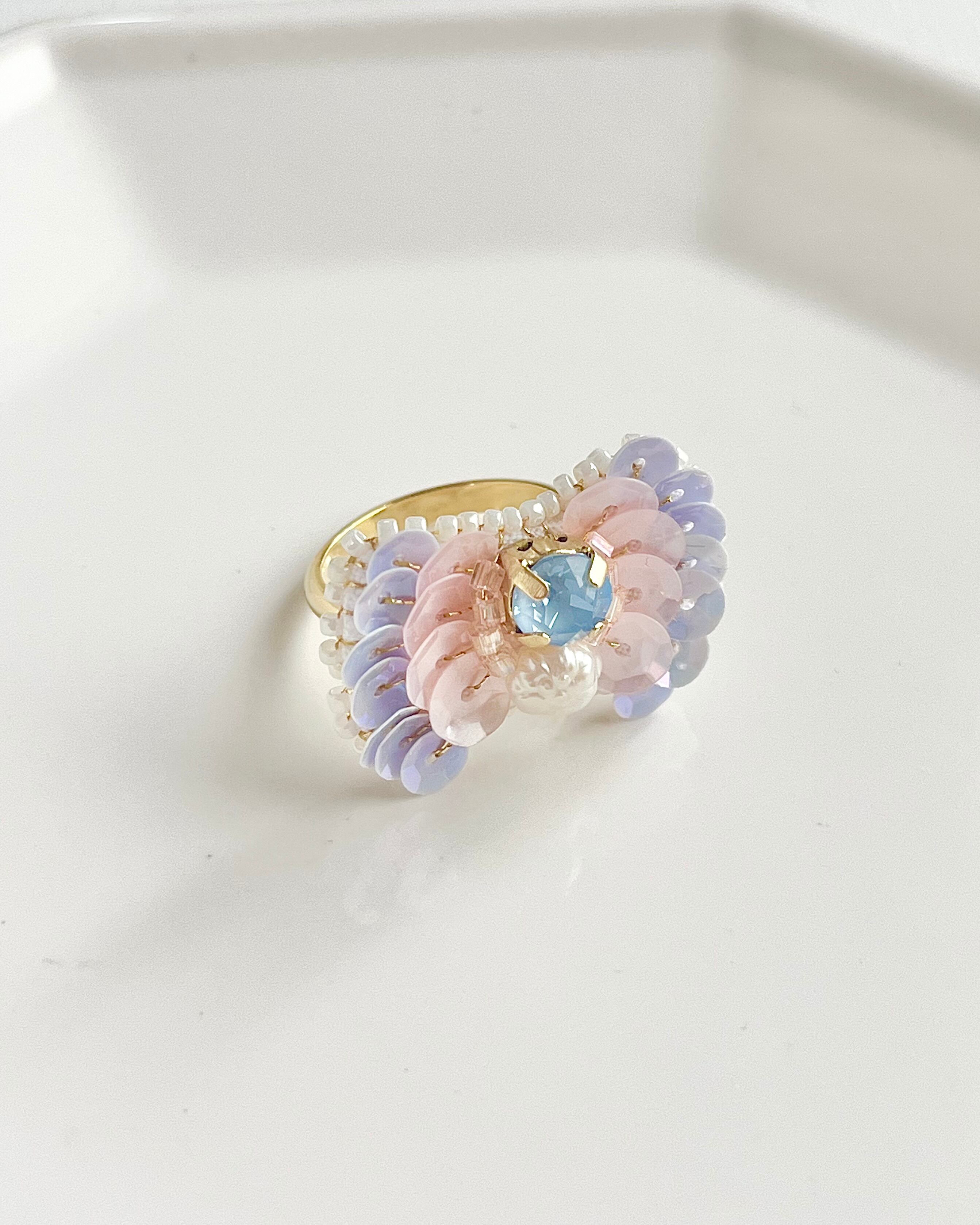 まわりに施したロマンチックなカラーのスパンコールはフランス産のものを使用しています