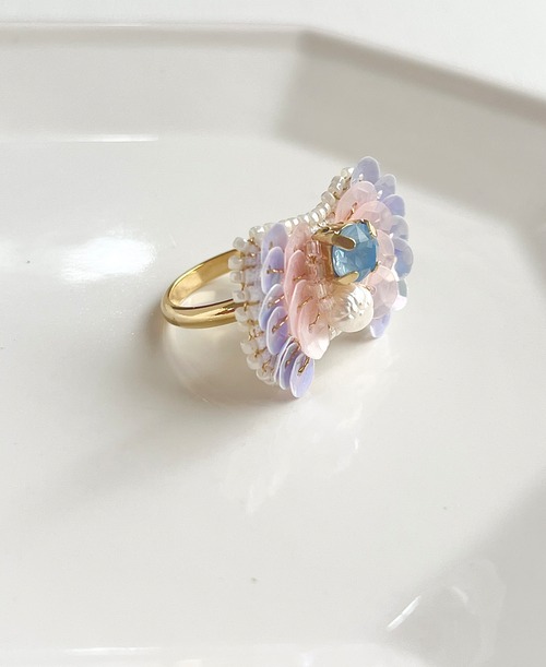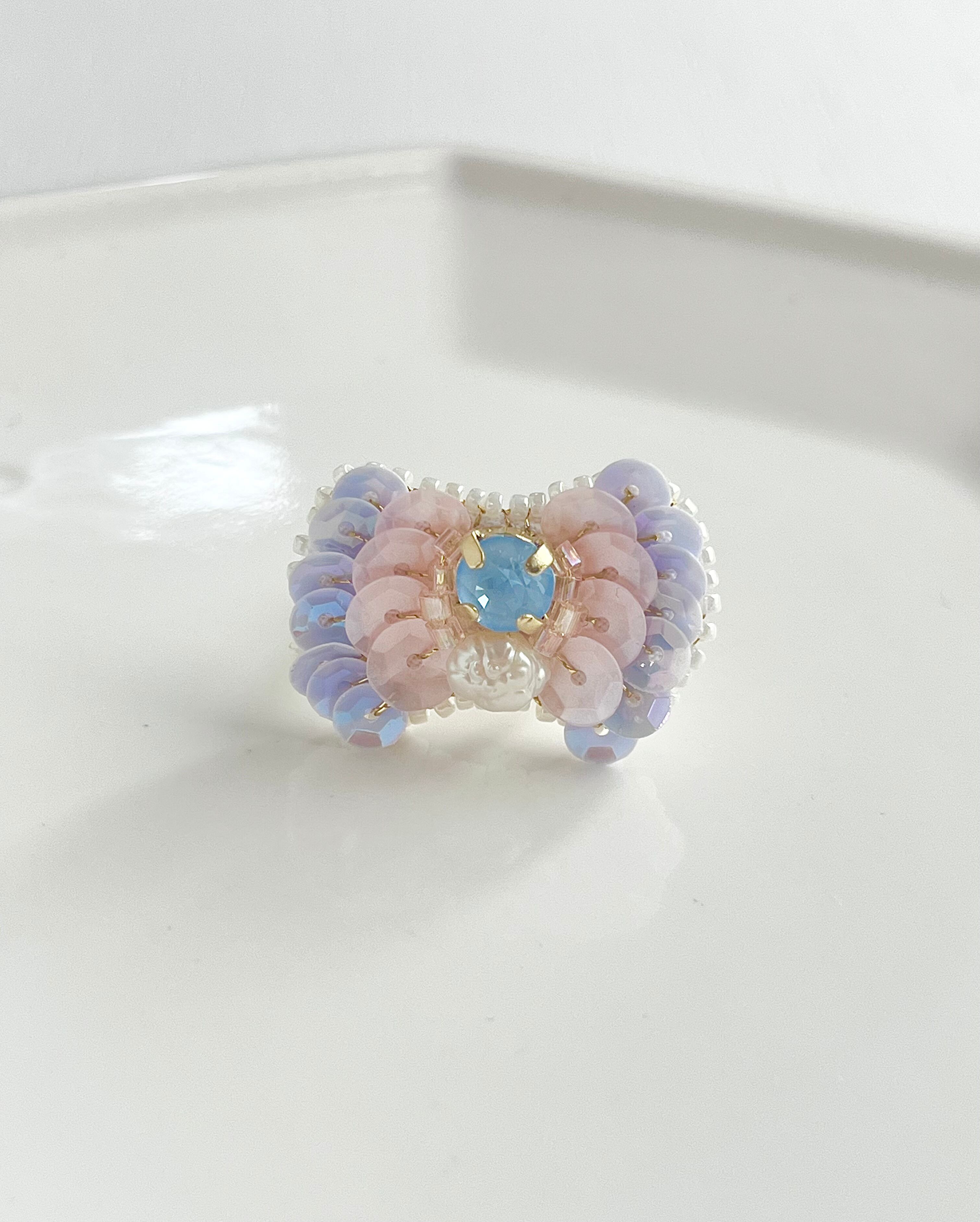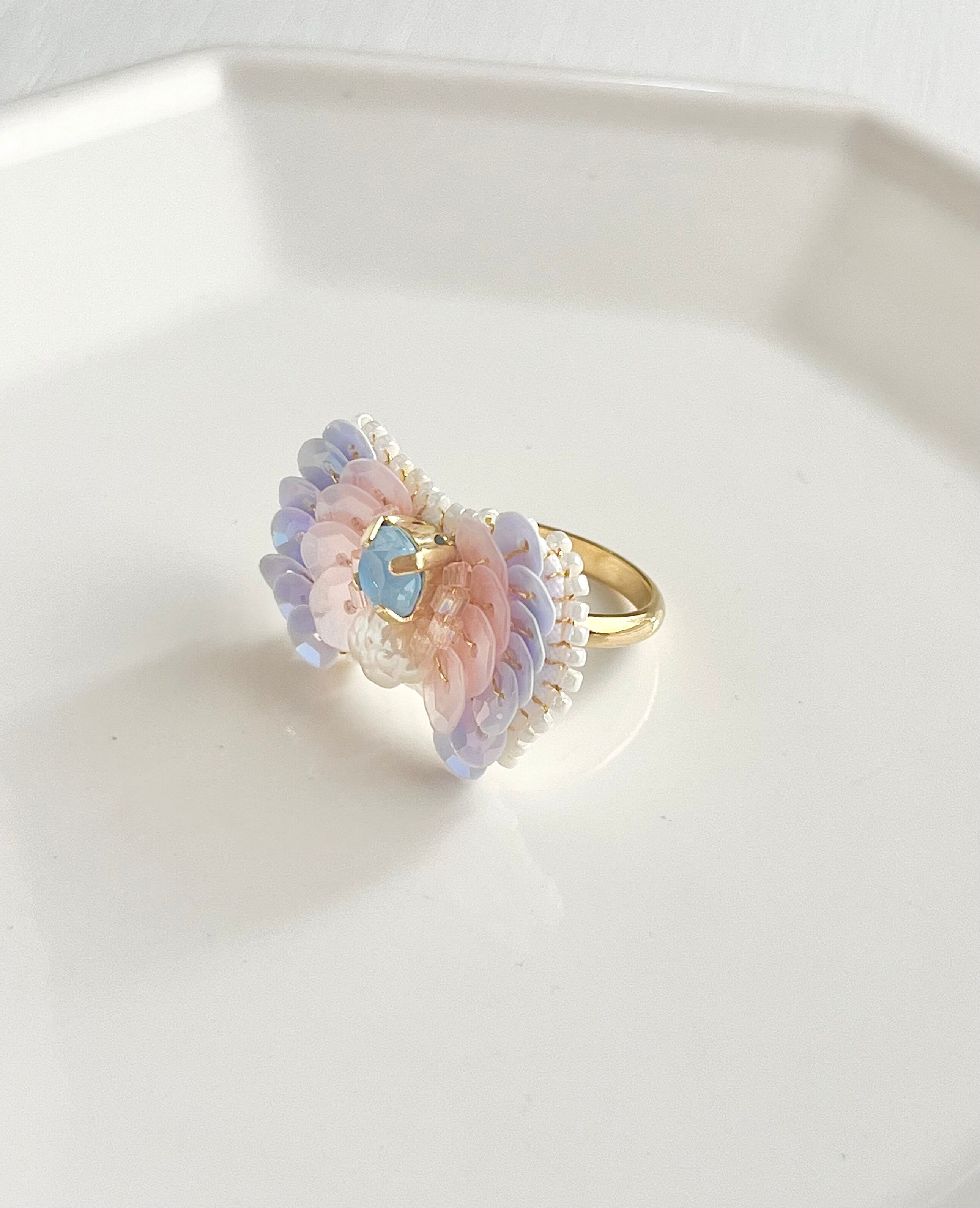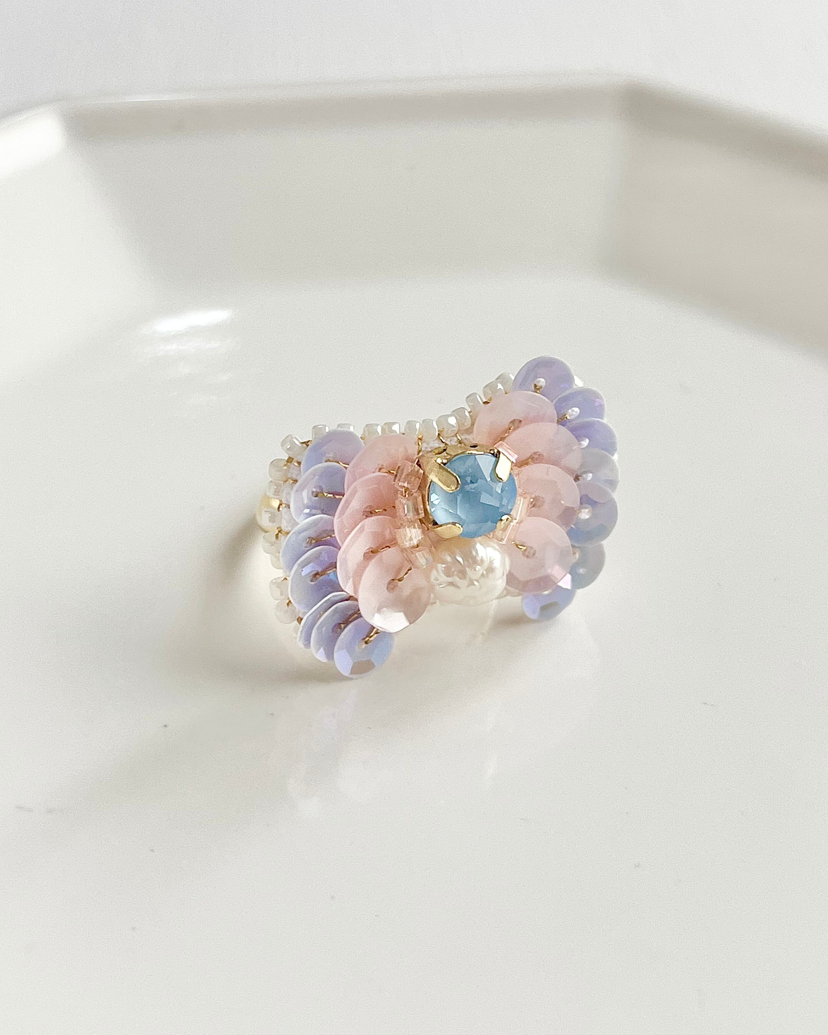 まわりに施したロマンチックなカラーのスパンコールはフランス産のものを使用しています
