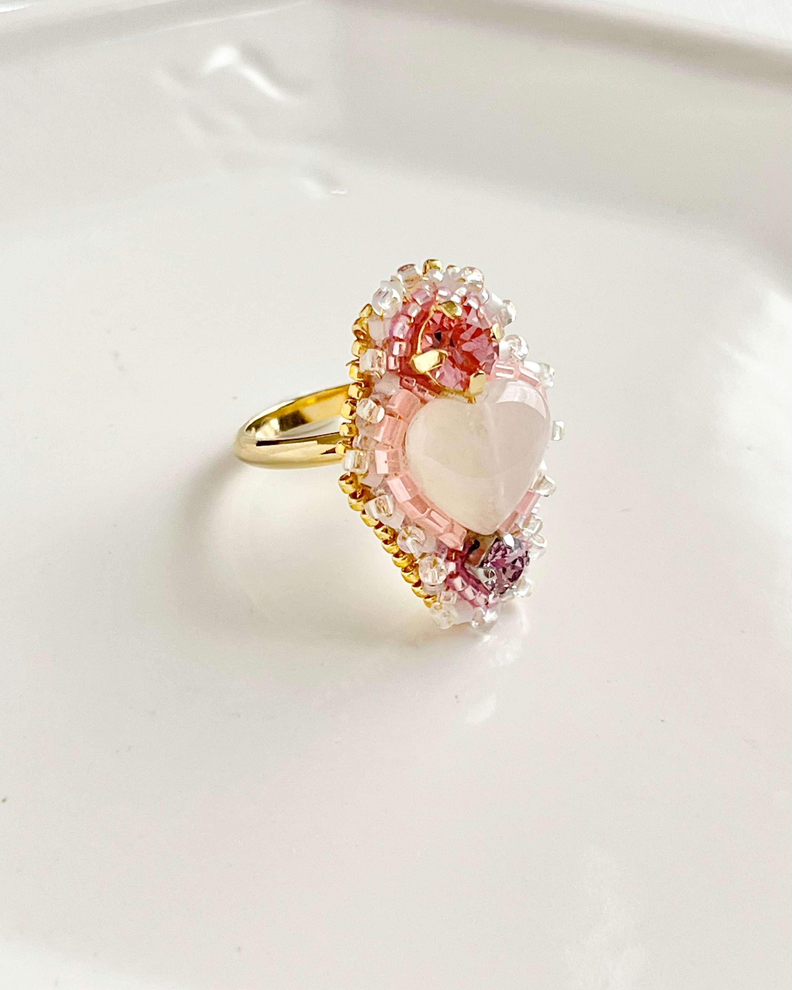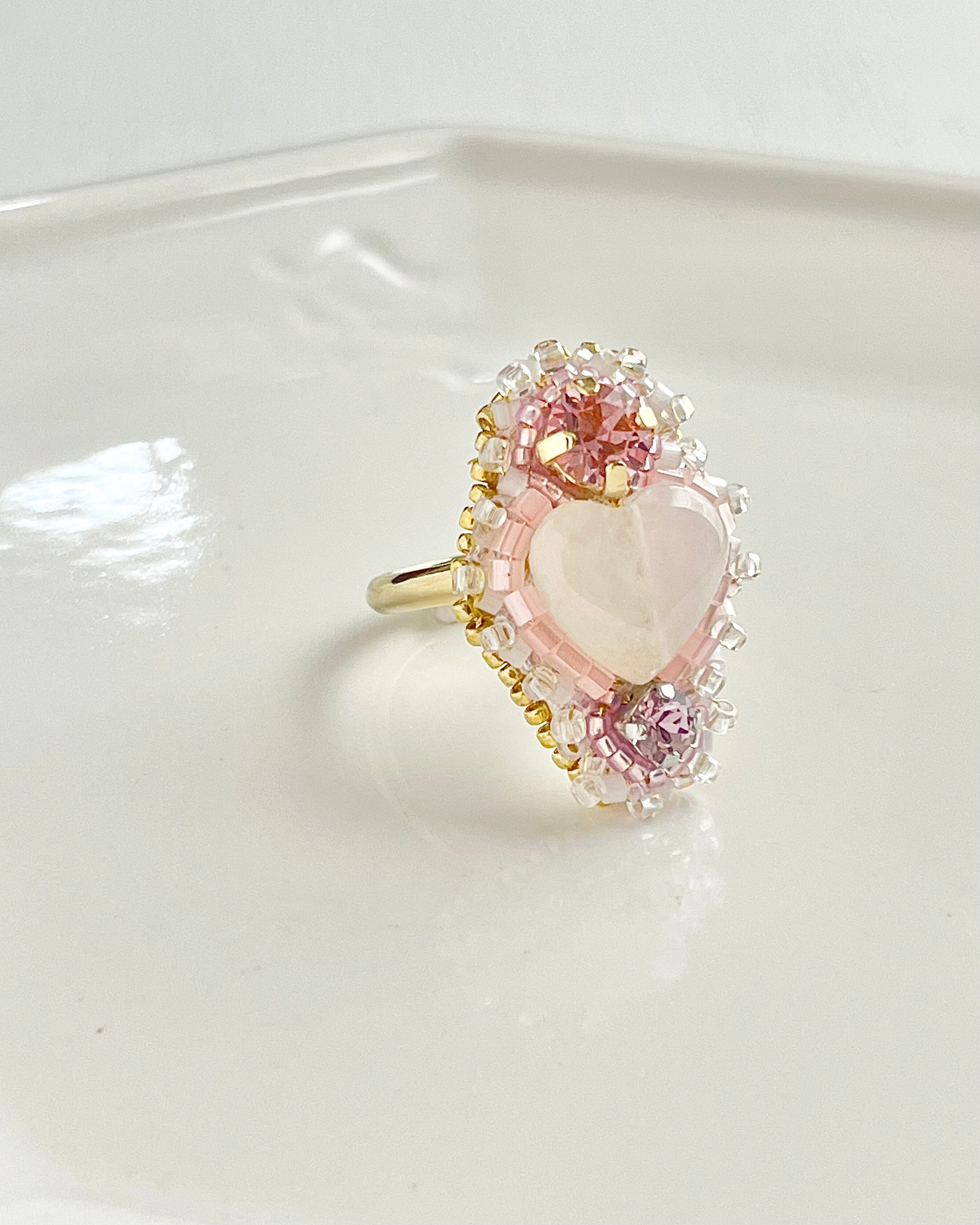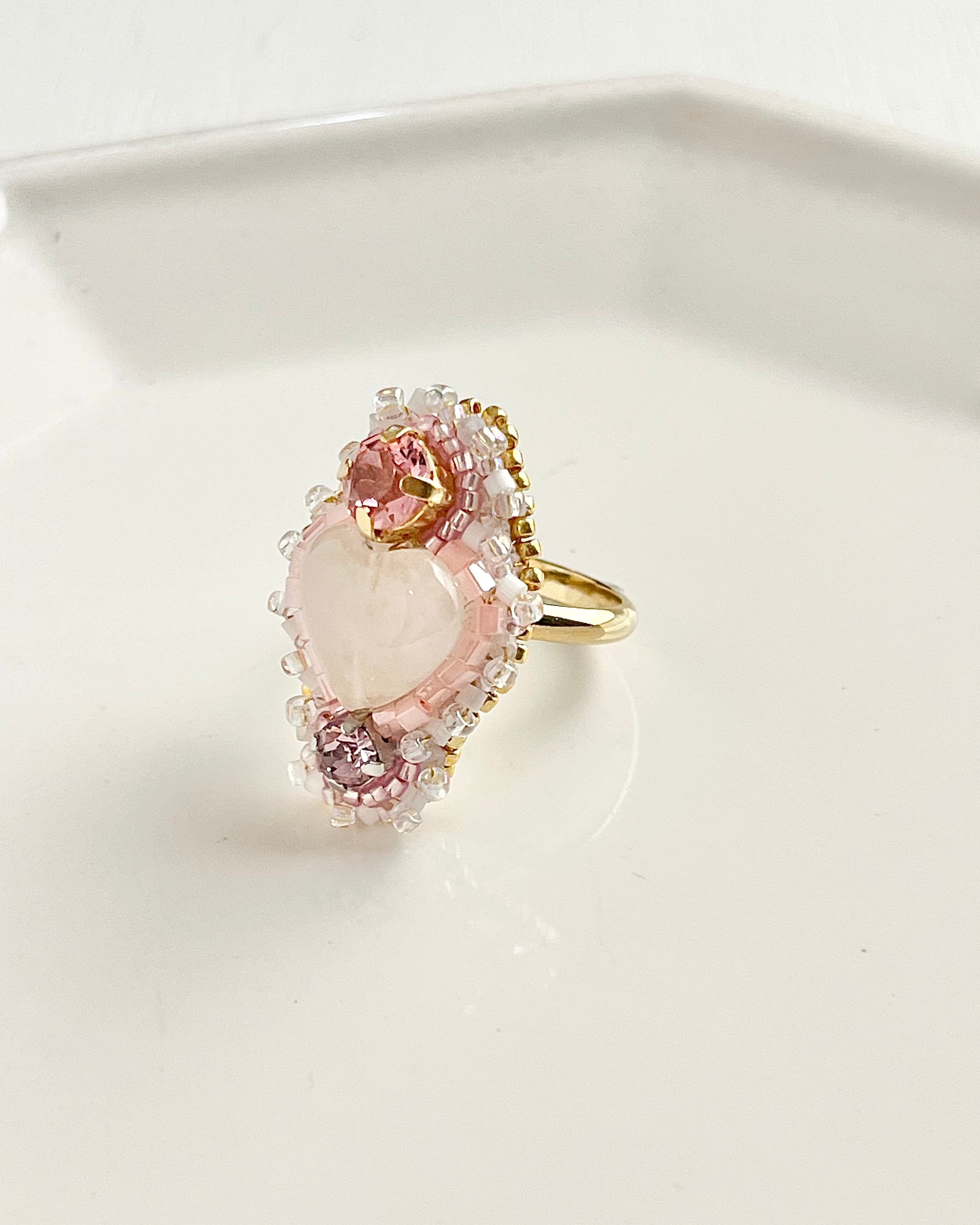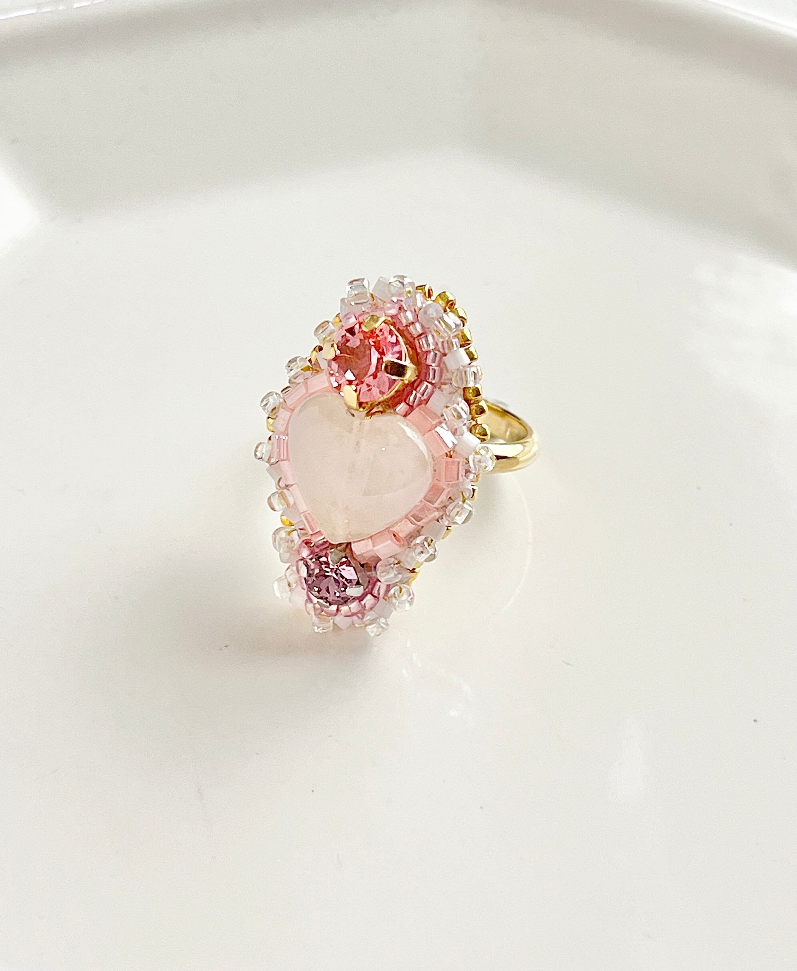 飴玉のようにつややかなハートの形のローズクォーツを主役にしてガラスのクリスタルビーズを飾りつけた、遊び心たっぷり上品に仕上げました