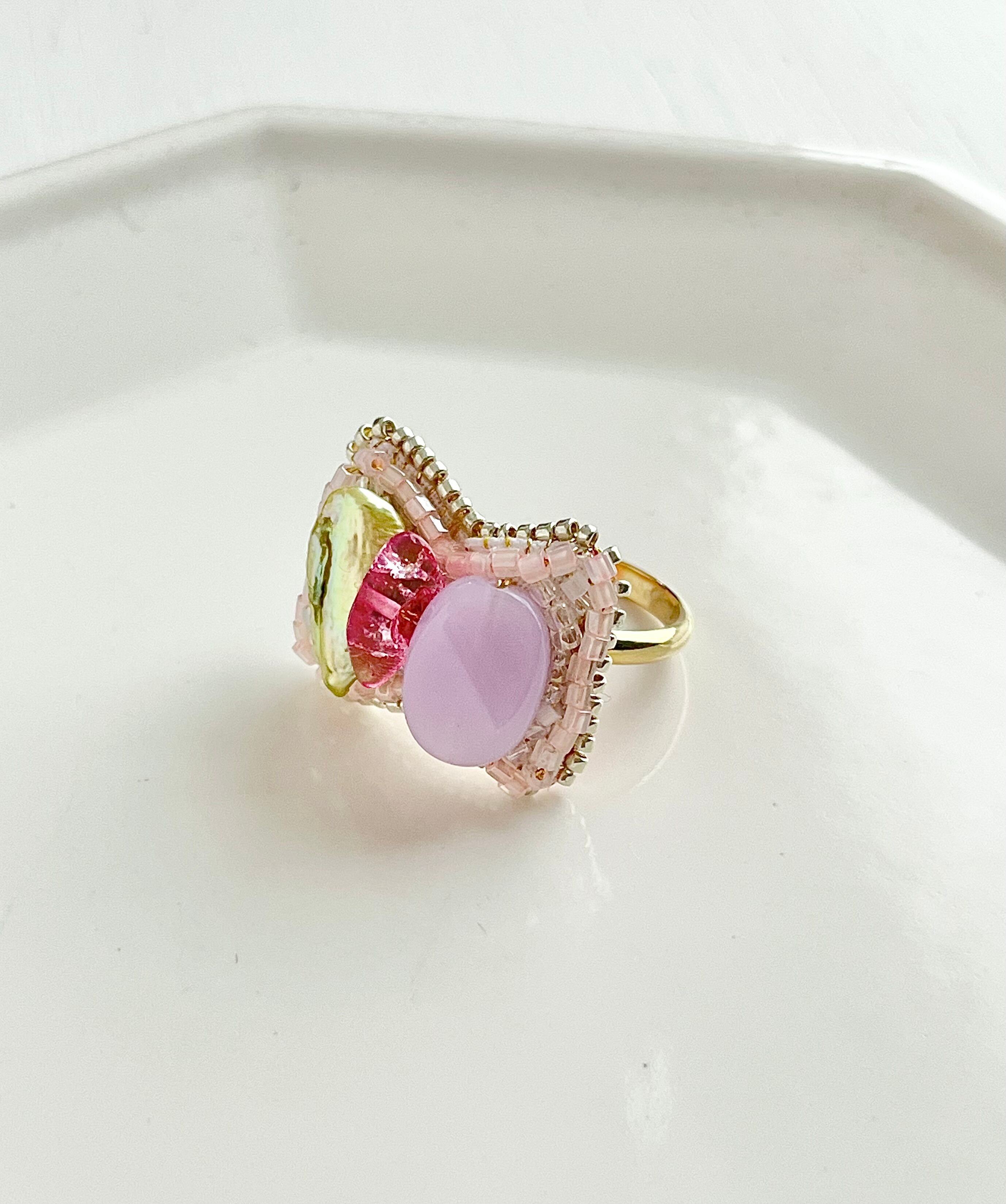 紅色のさざれ石、グリーンに色付けされたパール、ラベンダーのドイツのビーズ、個性的なパーツたちをぎゅっとして遊び心たっぷり上品に仕上げました